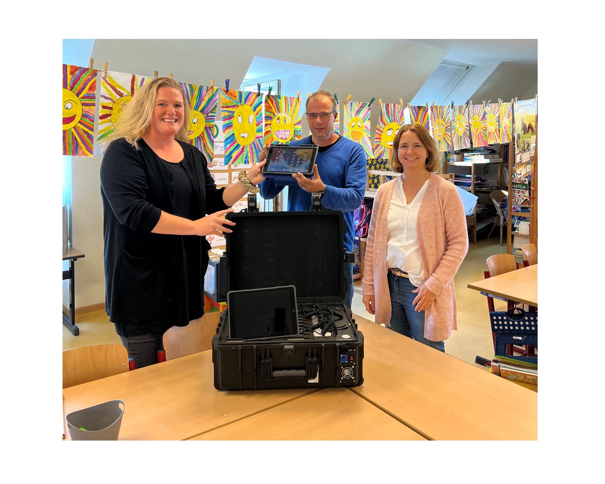 Laura Solzbacher vom Förderverein Löwenburgschule , Martin Wilke (Schulleiter) und Carmen Probst (stellv. Schulleiterin) mit dem Spezialkoffer und ein paar iPads. Foto: ©Förderverein Löwenburgschule