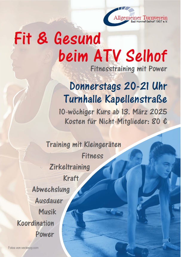 Du suchst nach einem effektiven und abwechslungsreichen Training um fit und gesund zu bleiben, aber für Wirbelsäulengymnastik fühlst du dich noch zu jung? Dann hat der ATV-Selhof genau das richtige für dich. Unter dem Motto „Fit und Gesund – Fitnesstraining mit Power“ wird zu aktueller Musik mit und ohne Handgeräte Kraft, Ausdauer und Fitness trainiert. Das neue Angebot startet am 13. März und findet immer donnerstags von 20 Uhr bis 21 Uhr in der Turnhalle Kapellenstraße statt. Einsteiger und Fortgeschrittene sind herzlich willkommen. Weiter Informationen unter www.atv-selhof.de oder 02224 969668.
