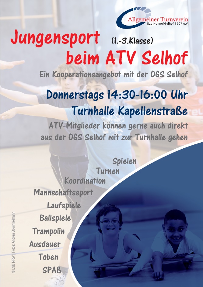 Für Jungen im Alter von 6-8 Jahren (Klasse 1 bis 3) bietet der ATV Selhof eine Breitensportgruppe an. Mit Ballspielen, Laufspielen, Kletterparcours und Grundübungen des Turnens werden Koordination und Teamgeist gefördert. Die Sportgruppe trifft sich immer donnerstags von 14:30 – 16:00 Uhr in der Sporthalle an der Kapellenstraße. Sportkleidung und Turnschuhe sind unverzichtbare Utensilien. Kinder, die in der OGS-Selhof sind können dieses Angebot in der OGS wählen oder als Vereinsmitglieder nach vorheriger Rücksprache auch gerne aus der OGS mit in die Turnhalle genommen werden.