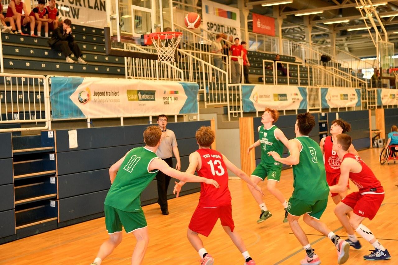 Eigentlich hatte man im Vorfeld die zweite Gruppe mit Bonn, Essen und Paderborn etwas schlechter als die eigene eingeschätzt – aber da hatte man sich getäuscht. Während sich Münster von einem Zehn-Punkte-Rückstand mühsam gegen Essen zurückkämpfte, lief die eigene Partie gegen Paderborn noch dramatischer. Die Zonenverteidigung des Reismann-Gymnasium Paderborn in Verbindung mit ihrem 2,05 großen Innenspieler machten einfache Punkte fast unmöglich. Immer wieder scheiterte man an der massiven Präsenz unter dem Korb und da auch unsere Dreier selten ihr Ziel fanden, entwickelte sich das punktärmste Spiel des Tages. Beim Stand von 18:17 und letztem Paderborner Ballbesitz gab es sogar eine echte Schrecksekunde. Aber nach einem Foul im Wurf verwandelte der Paderborner Center nur einen von zwei Freiwürfen, so dass es in die Verlängerung ging. Die war dann überraschenderweise eindeutig. Drei schnelle Fastbreak-Körbe öffneten das Spiel (30:21) und das Tor zum Finale. Die Erleichterung – aber nach dem dritten Spiel in Folge auch gewisse Ermüdungserscheinungen – waren unseren Spielern deutlich anzumerken.