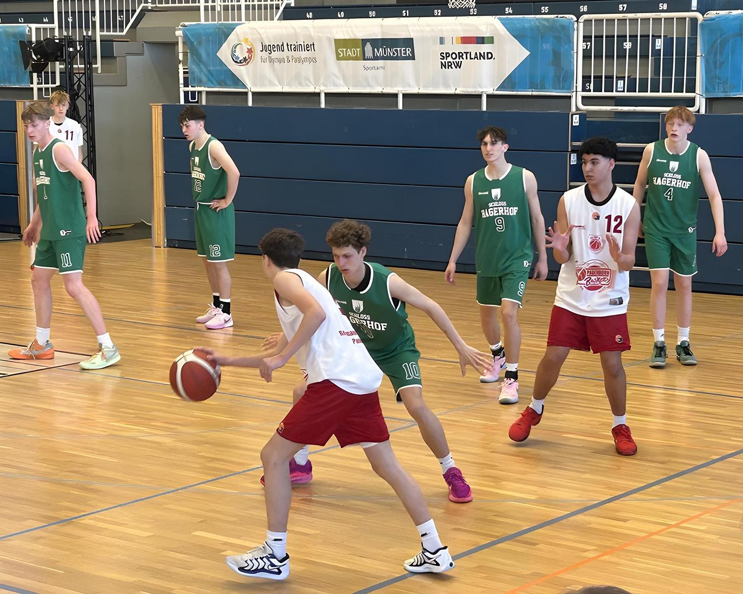 Im ersten Spiel traf Schloss Hagerhof direkt auf den Gastgeber Pascal-Gymnasium Münster, gegen den man im Vorjahr noch das Finale der WK3 verloren hatte. Es trafen sich also alte Bekannte. Während Münster bereits ein Spiel absolviert hatte und trotz knapper Niederlage gegen Hagen zwar unter Druck stand aber auch bereits besseren Rhythmus hatte, merkte man den Hagerhofler noch eine gewisse Auftaktnervosität an. Der Korb schien zunächst wie vernagelt, aber nach dem schwachen Start kämpfte man sich über schnelles und konsequentes Spiel ans Brett zurück und ging sogar mit einer 18:11-Führung in die Halbzeit. Doch die Umstellung Münsters auf Zonenverteidigung bereitete Probleme, unsere Distanzwürfe fielen nicht und das Spiel kippte langsam. Kurz vor Ende übernahmen die Münsteraner die Führung und gaben diese bis zum Schluss nicht mehr ab (29:31). Jetzt war der Druck in der bärenstarken Dreiergruppe auf Hagerhofseite.