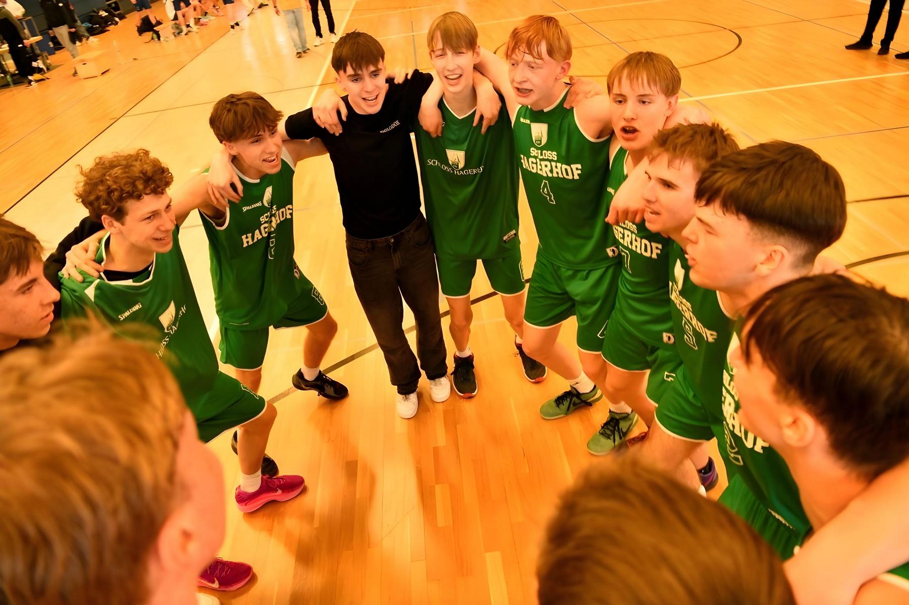 Das Endspiel wurde dann auf dem großen Bundesliga-Feld ausgetragen. Während sich die Halle füllte – die Siegerehrungen für alle Sportarten sollten nach dem Basketballfinale stattfinden – wurden die Spieler namentlich zum Einlauf bei der Mannschaftsvorstellung begrüßt. Münster begann die Partie erneut stark und setzte mit gewohnt aggressiver Verteidigung erste Zeichen. Dennoch entwickelte sich ein engeres Spiel als noch in der Vorrunde. Erst nach der Halbzeit kam der erste Run. Münster zog auf einmal auf acht Punkten davon (16:24) und unsere Jungs wirkten müde und auch etwas angeschlagen. Also Auszeit. Und aus dieser kamen alle nicht nur mit neuer Taktik sondern auch Energie zurück auf das Parkett. Die Zonenverteidigung, in den vorherigen Partien eher der eigene Endgegner, sorgte für Ruhe am eigenen Brett und in Kombination mit starken Offensivaktionen für einen 9:0-Lauf, der das Spiel drehte. In die Schlussminute ging der Hagerhof mit einer Drei-Punkte-Führung. Zwar konnte man keinen eigenen Korb mehr erzielen, aber die Verteidigung hielt im Rahmen des Nötigen. Münster hatte mit sechs Sekunden auf der Spieluhr noch einmal Einwurf, bekam aber keinen Wurf mehr los. Die Freude bei unseren Spielern war nach der finalen Sirene entsprechend groß.