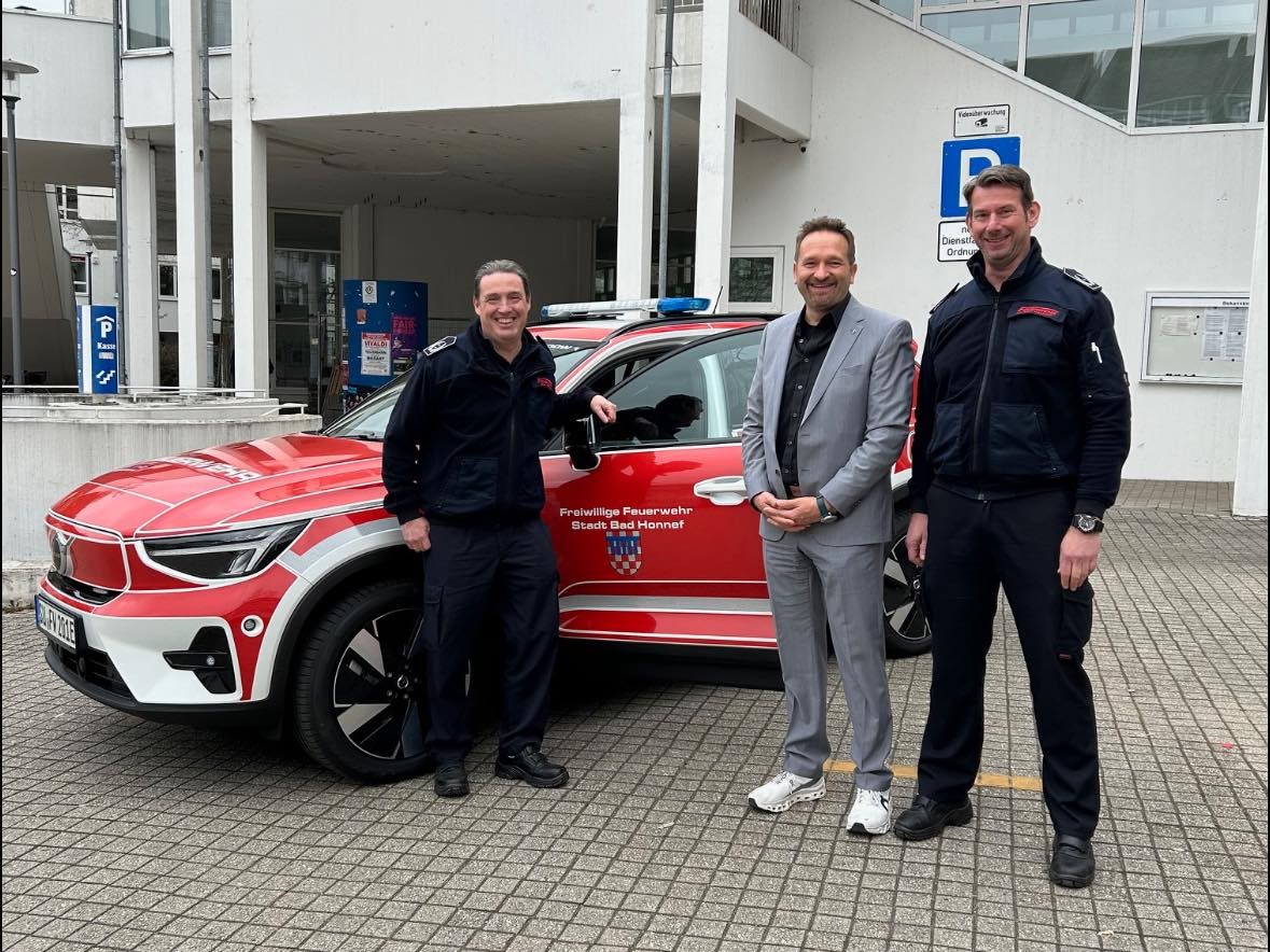 Übergabe des neuen Kdow (Volvo EX40) durch den 1 Beigeordneten Holger Heuser an Honnefs Feuerwehr Chef Frank Brodesser und Thomas Weis Foto© Freiwillige Feuerwehr Bad Honnef 2
