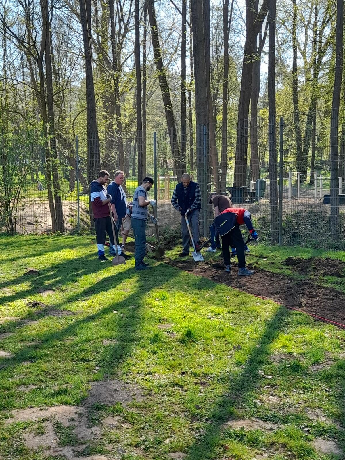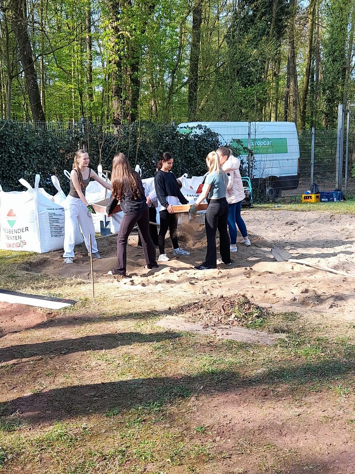 In einer gemeinschaftlichen Aktion, auf dem Sportgelände der Hagerhof-Schule, wurde der Sand von Fremdkörpern befreit, die holprige und zugewachsene Anlaufbahn abgetragen, der Untergrund vorbereitet, eine nagelneue Regupolbahn verlegt und der abgenutzte Absprungbalken durch einen Neuen ersetzt.