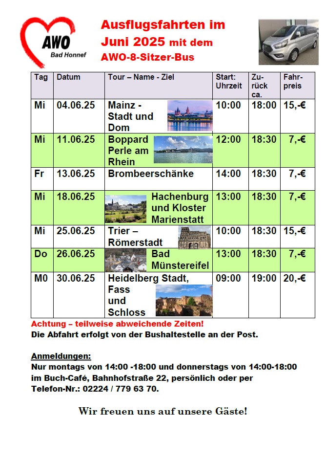 AWO Ausflugsfahrten im Juni 2025 15. Mai 2025 TS Infos...AusBadHonnef 0 teilen Quelle AWO Bad Honnef (hl) 15.05.2025 teilen AusBadHonnef.deAwo AusflugsfahrtenAWO Bad HonnefBad Honnef