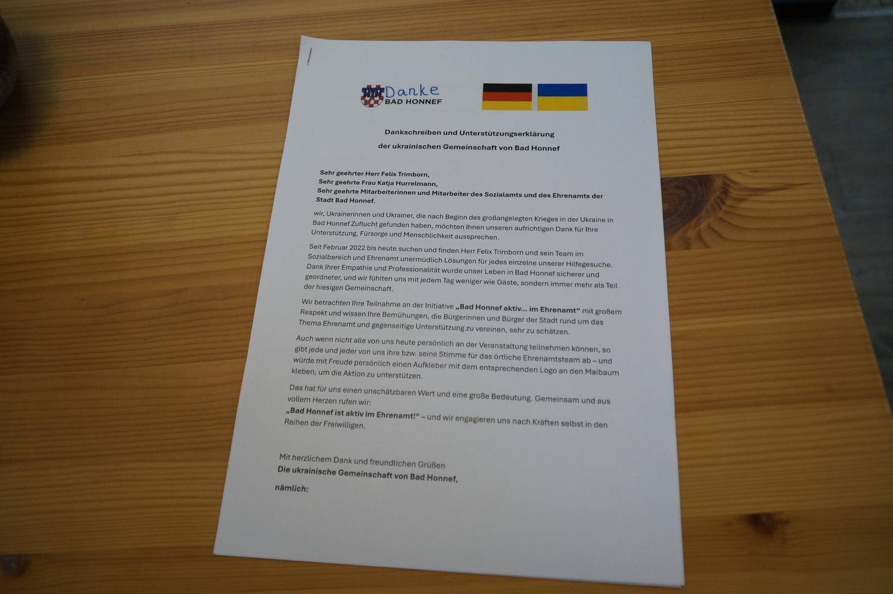 In dem Schreiben bringen die Unterzeichnenden ihre tiefe Dankbarkeit für die Unterstützung und Menschlichkeit zum Ausdruck, die sie seit ihrer Ankunft in Bad Honnef erfahren haben. Besonders hervorgehoben wird der Fachdienst Soziales, Integration und Ehrenamt, der seit Beginn des Krieges mit großem Einsatz dazu beigetragen hat, den Ankommenden Sicherheit, Orientierung und Perspektive zu geben.