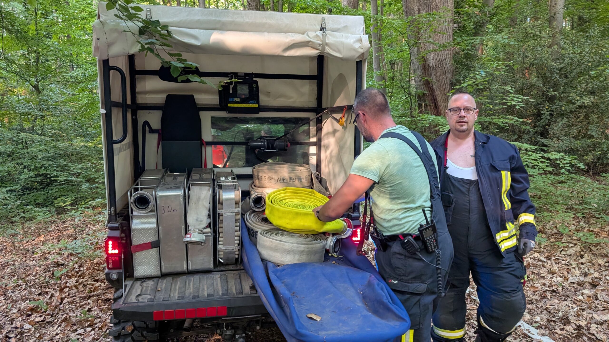 Nach etwa zwei Stunden intensiver Löscharbeiten konnte der Einsatz erfolgreich abgeschlossen werden. Rund 20 Quadratmeter Unterholz standen in Flammen, die effektiv mit Wasserrucksäcken abgelöscht wurden.