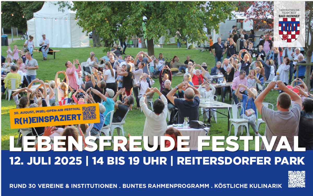 Das Lebensfreudefestival ist eine Initiative der Stadt Bad Honnef. Es bietet Bad Honnefer Vereinen und Institutionen eine gemeinsame Bühne – und zeigt, wie lebendig, vielfältig und engagiert das Miteinander in unserer Stadt ist. Unterstützt wird das Festival von der Bad Honnef AG und der Sparkasse KölnBonn.
