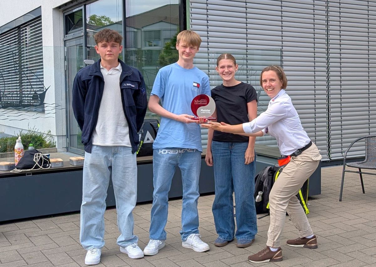 Louis, Karl und Emilia vom Städtischen Siebengebirgsgymnasium Bad Honnef haben für ihren Schulsanitätsdienst die Siegertrophäe gewonnen, die Jasmin Klinkner überreichte. — Fotos: Daniela Egger/Malteser
