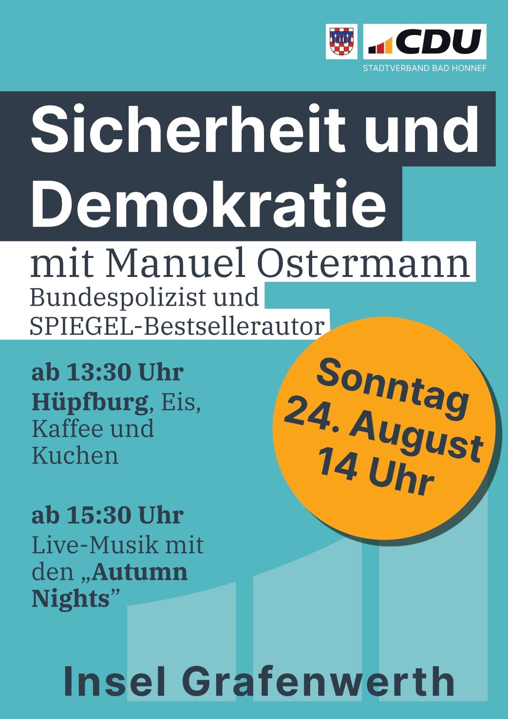 „Ohne Sicherheit keine Freiheit, und ohne Freiheit keine Demokratie“, ist das Leitmotiv von Manuel Ostermann, auf dessen Gedanken zur Inneren Sicherheit man beim diesjährigen Inselfest der CDU Bad Honnef sehr gespannt sein darf. Der Bestsellerautor, Bundespolizist und stellvertretende Vorsitzende der Polizei-Gewerkschaft DpolG ist ein gefragter Gesprächspartner, der bundesweit Veranstaltungshallen füllt und fachlich-fundiert Missstände aufdeckt und politischen Handlungsbedarf formuliert. Und Sicherheit und Ordnung sind Themen, die den Bürgern in Bad Honnef besonders nach den jüngsten Angriffen auf ein neueröffnetes Döner-Restaurant und die CDU-Geschäftsstelle auf den Nägeln brennen. Deshalb werden im Anschluss an Ostermanns Impulsvortrag Landrat Sebastian Schuster und Bürgermeisterkandidat Philipp Herzog, selber Regierungsdirektor im Bundesamt für Bevölkerungsschutz und Katastrophenhilfe, das Thema in einem Talk vertiefen.