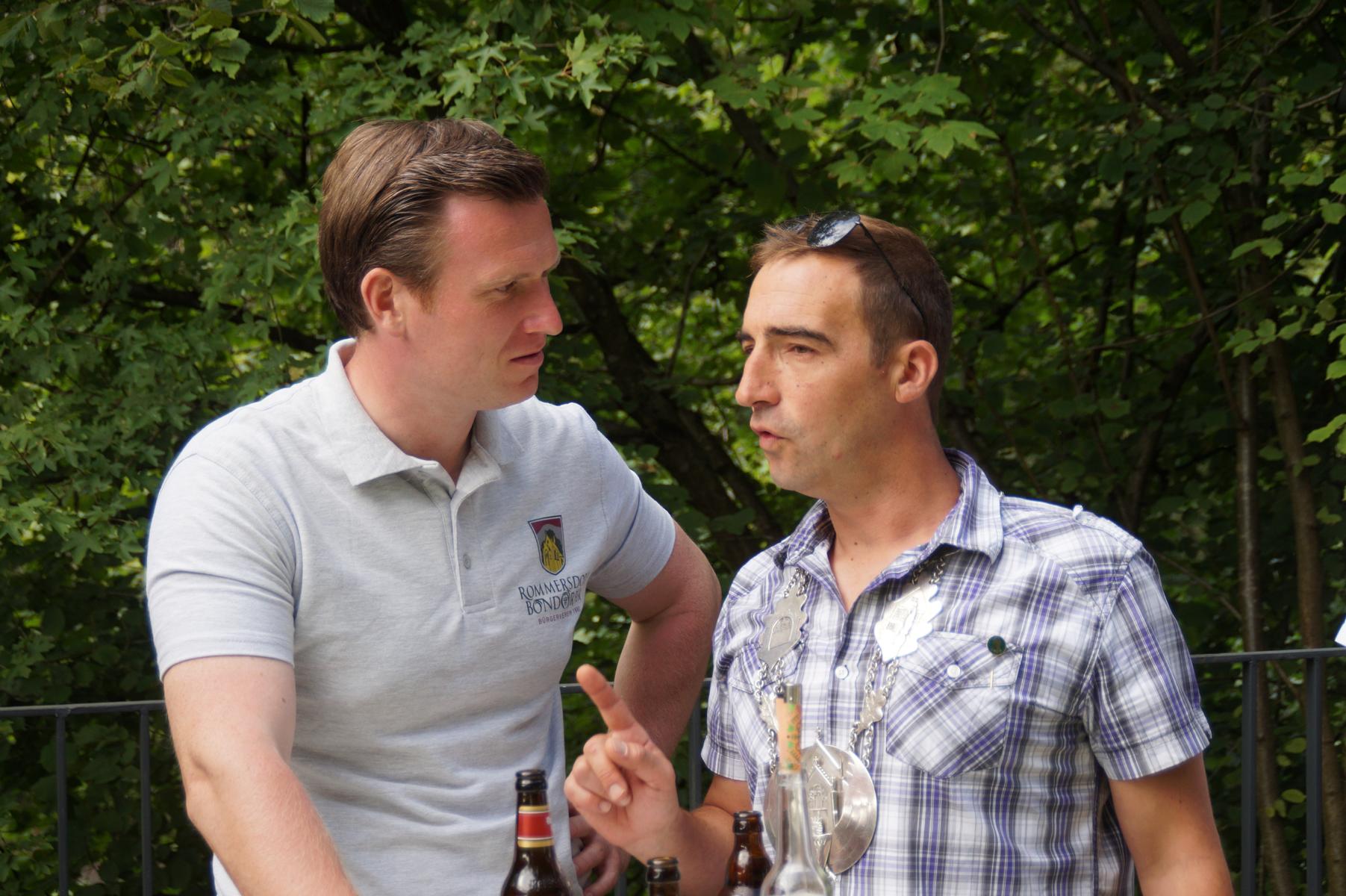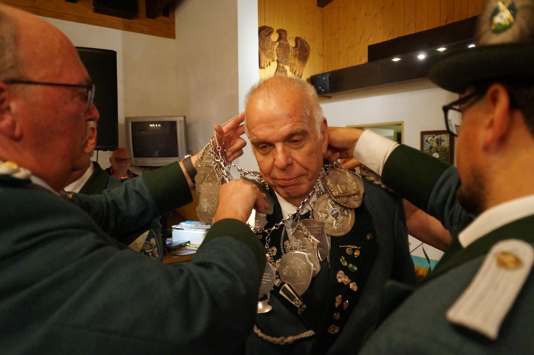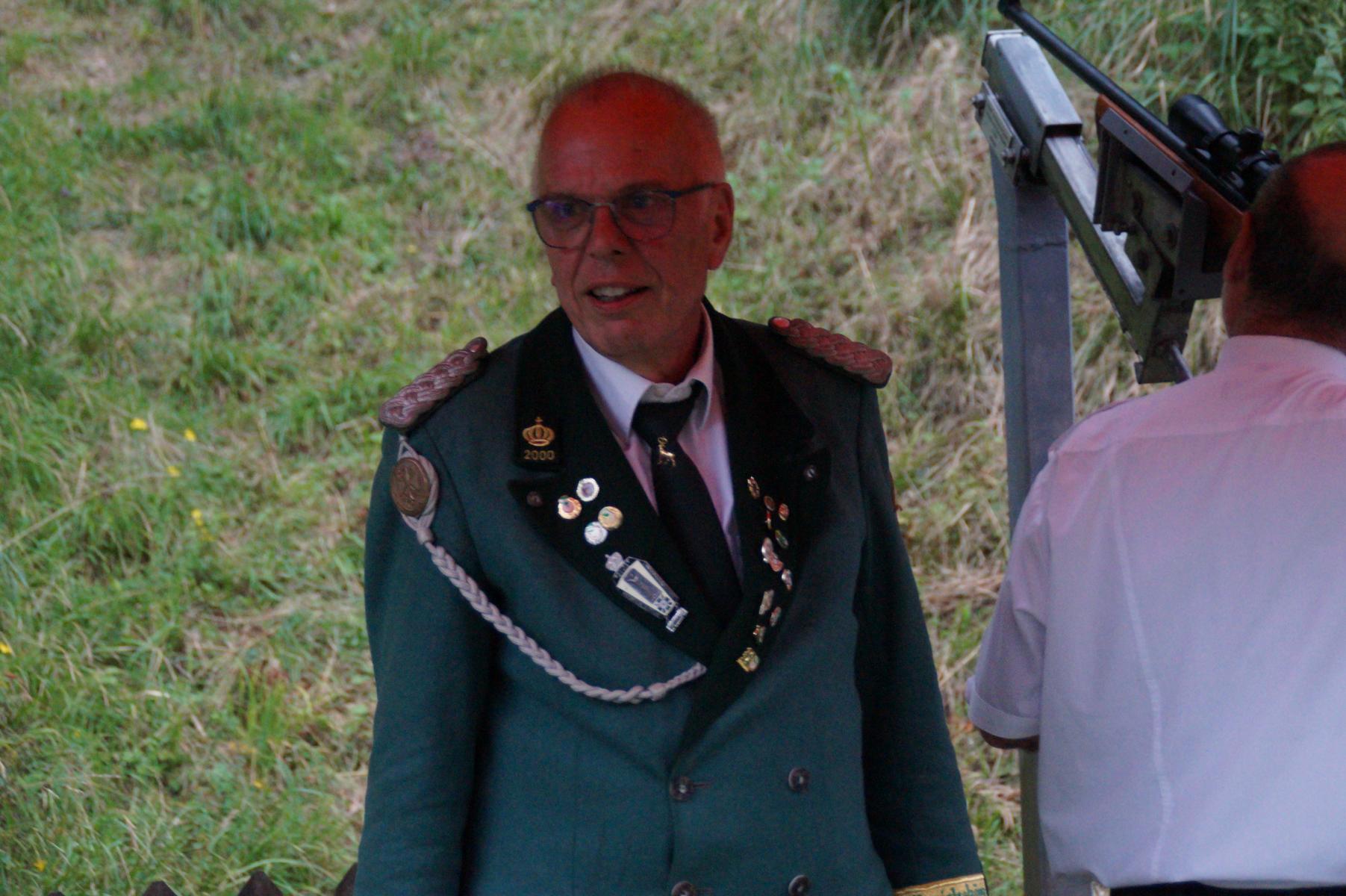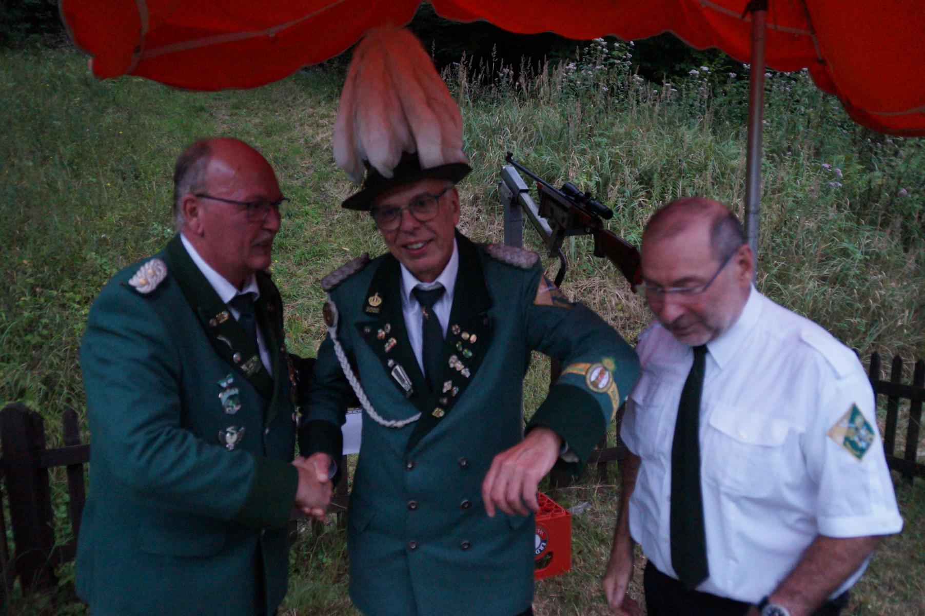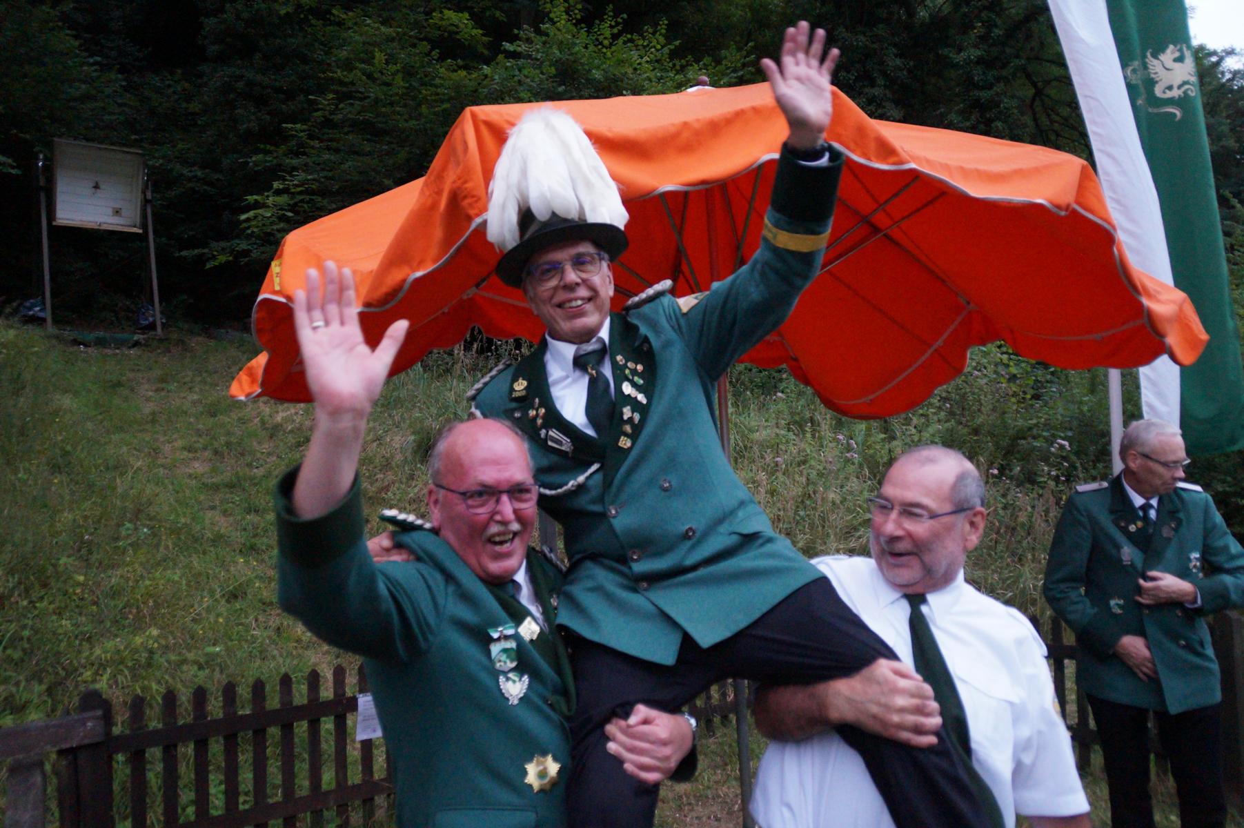Im Anschluss wurde der Königsvogel aufgestellt. Zahlreiche Rhöndorfer Schützen beteiligten sich am spannenden Wettkampf um die Königswürde. Bereits mit dem dritten Schuss errang Ralf Püllen die Krone. Niko Grebenar sicherte sich mit dem 45. Schuss den Kopf, Franz Gunkel holte mit dem 67. Schuss den linken Flügel, und Peter Profittlich ließ mit dem 95. Schuss den rechten Flügel fallen. Den Schweif schoss erneut Niko Grebenar mit dem 125. Schuss ab.