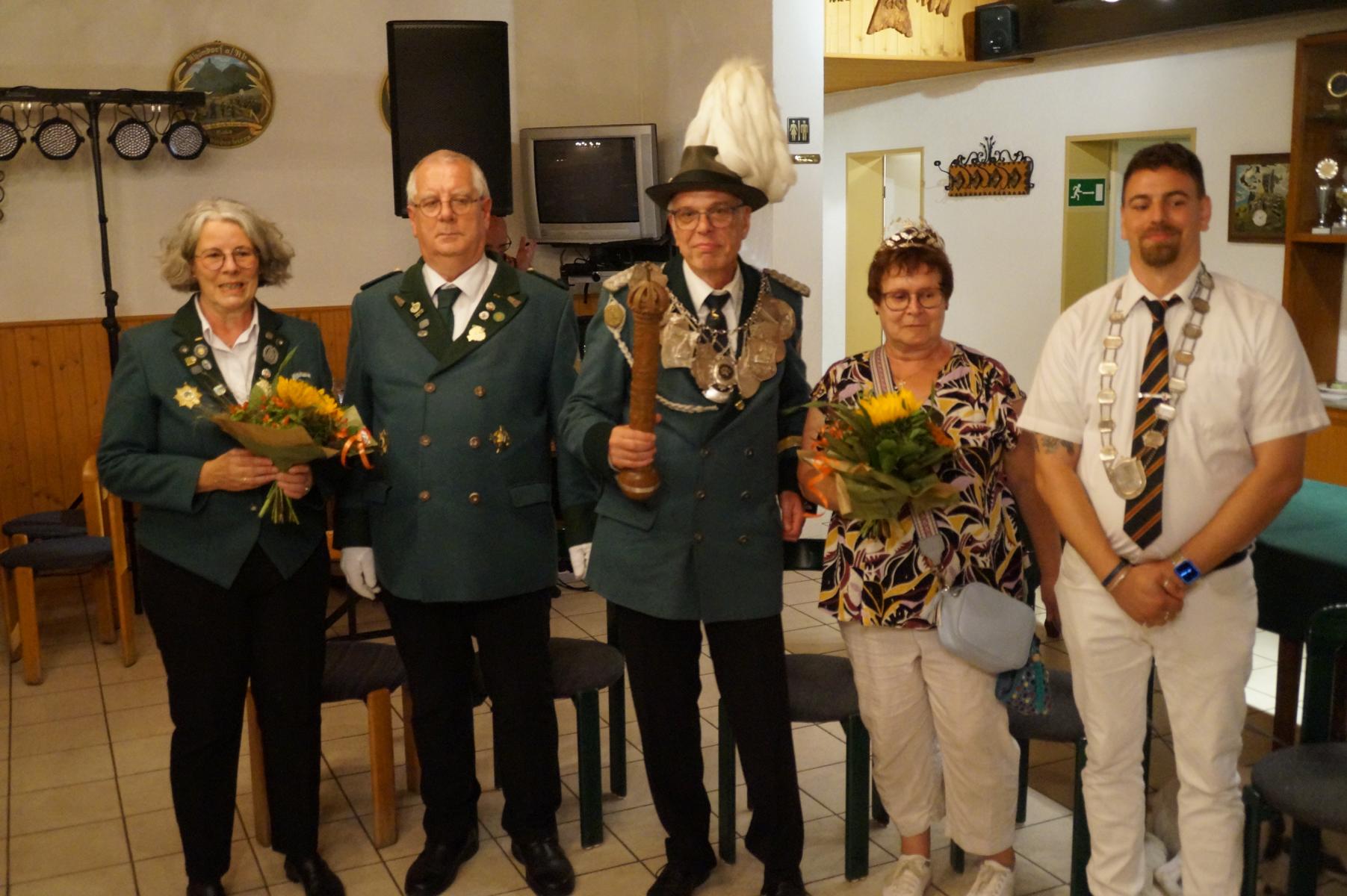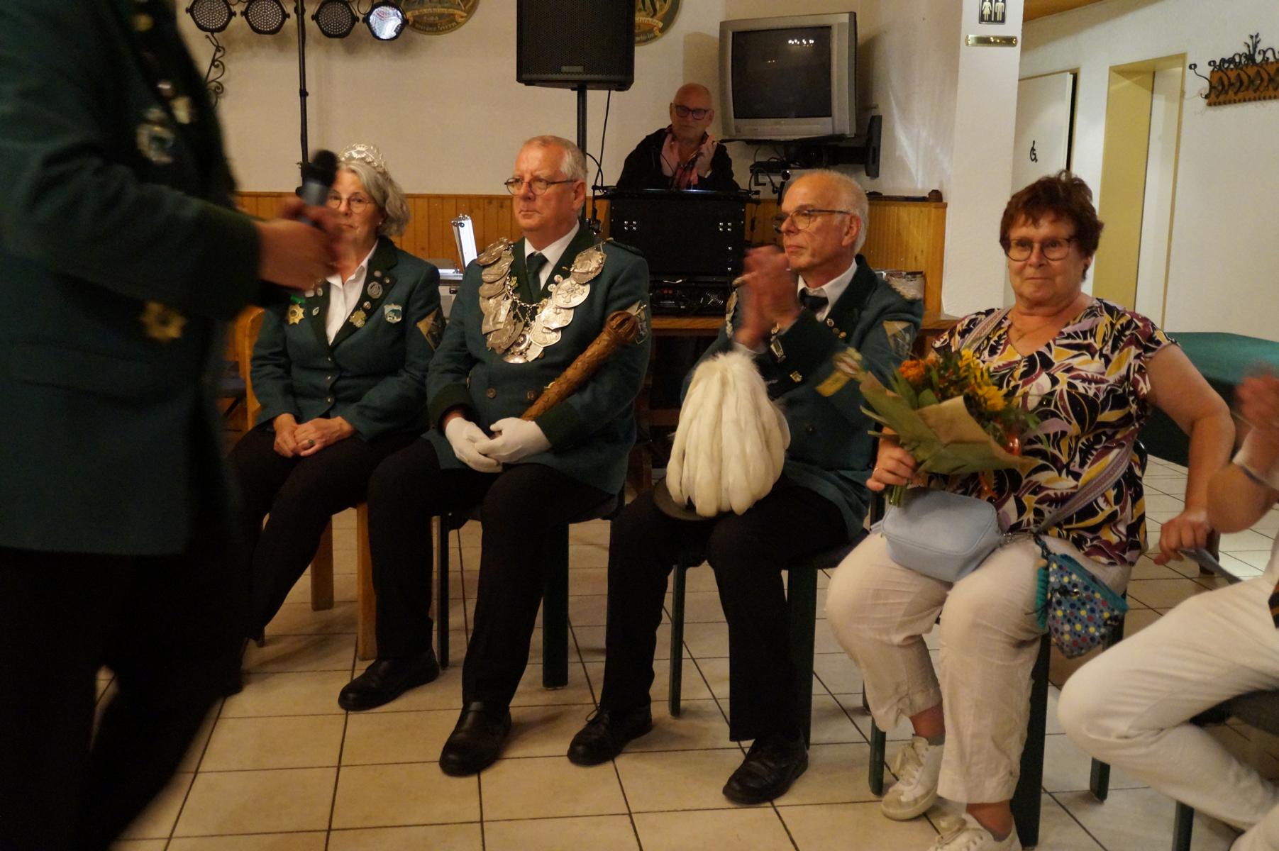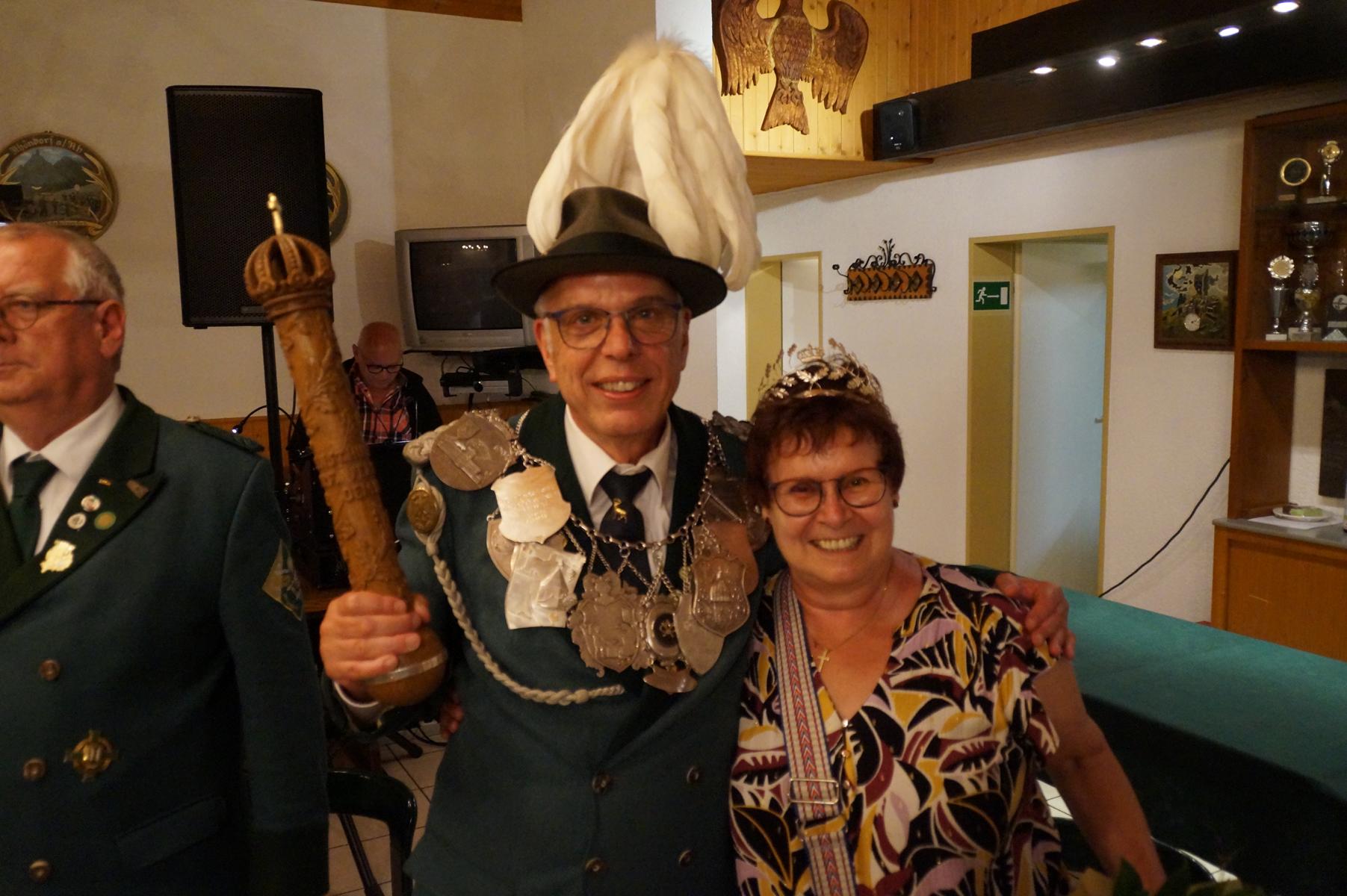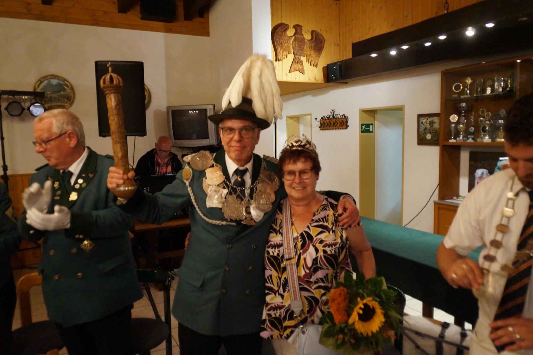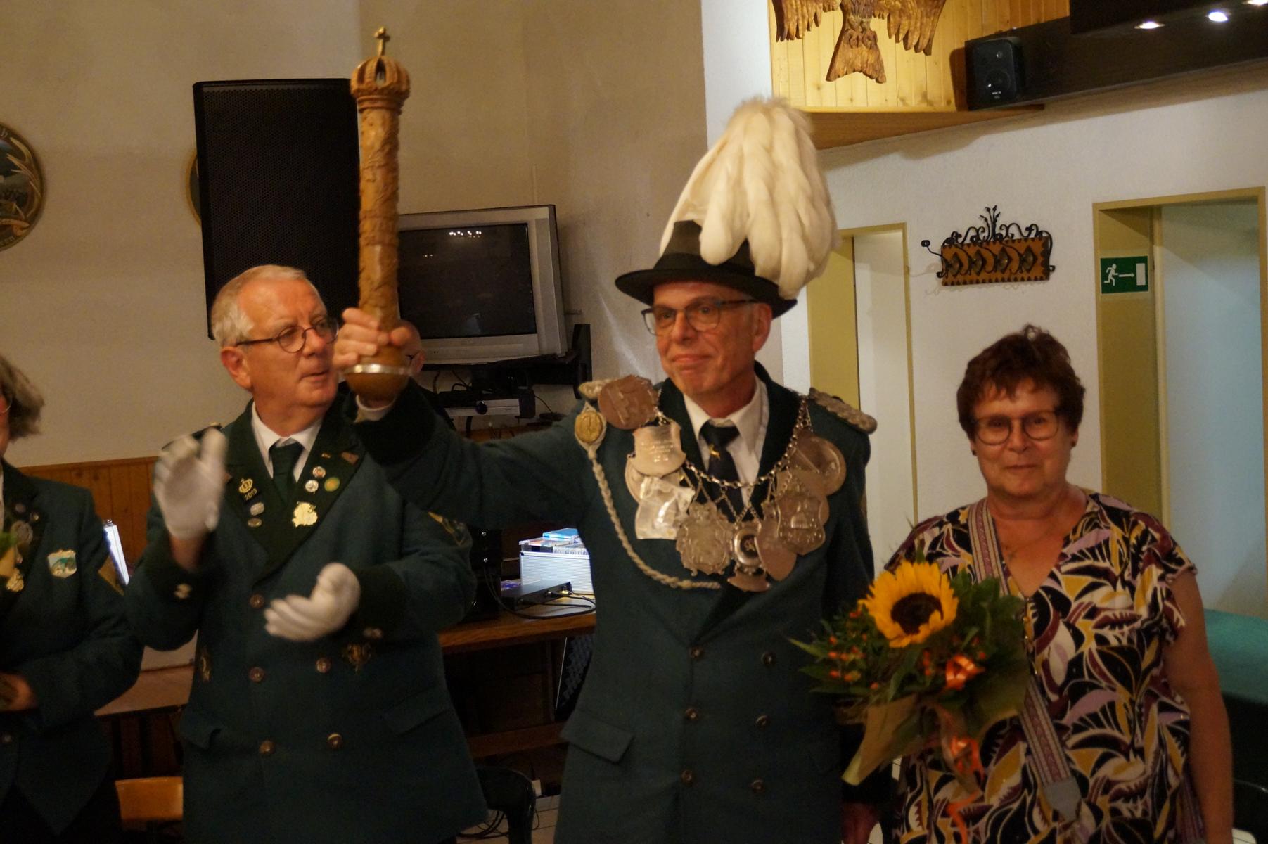 Gegen 21 Uhr folgte die feierliche Übergabe der Königswürde. Nach den Grußworten von Bürgermeister Otto Neuhoff dankte Präsident Ralf Wagner dem scheidenden Königspaar Ralf und Marie Jose Püllen für ihr Engagement. Mit einem dreifachen „HORIDO“ übergab er die Insignien an das neue Königspaar Jürgen und Anita Kuhn.