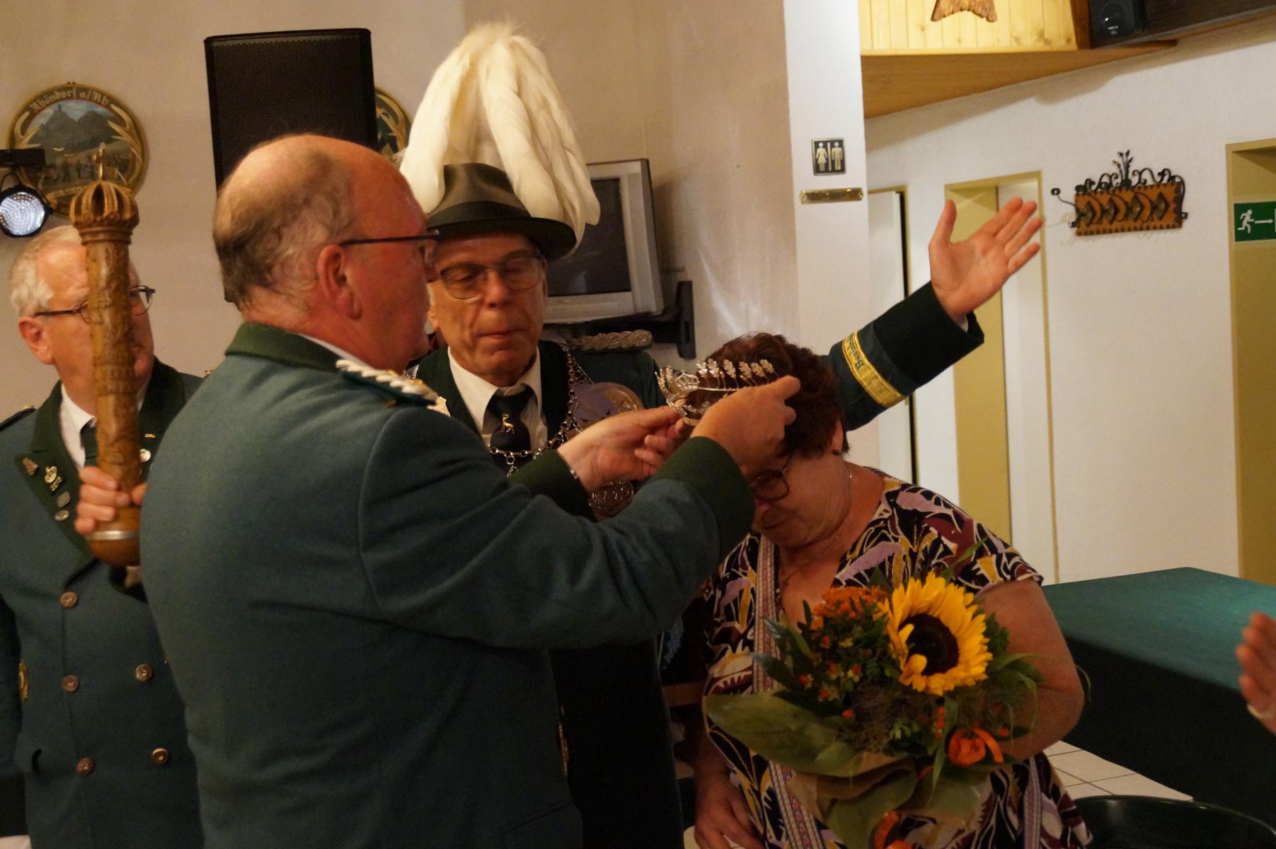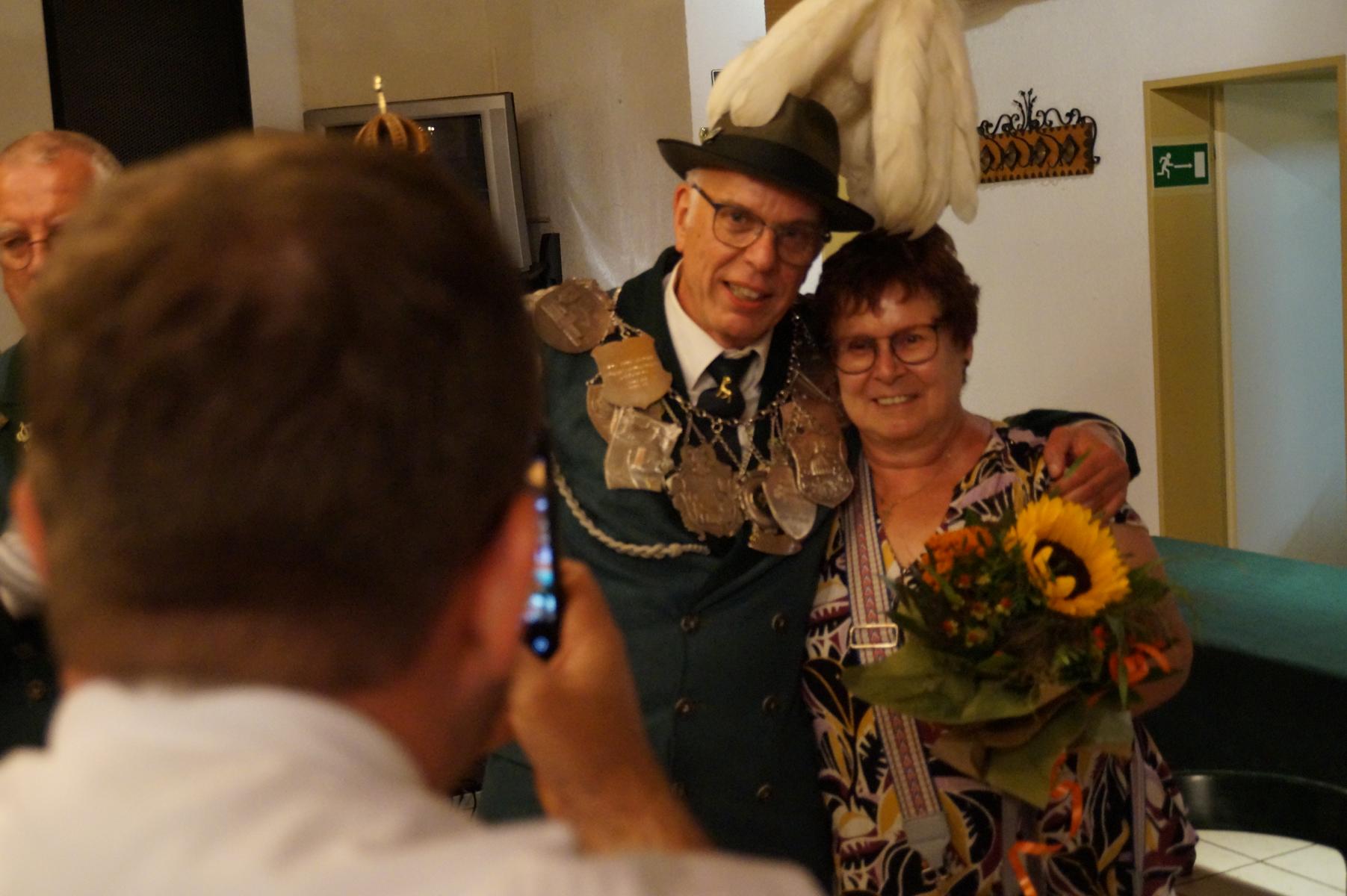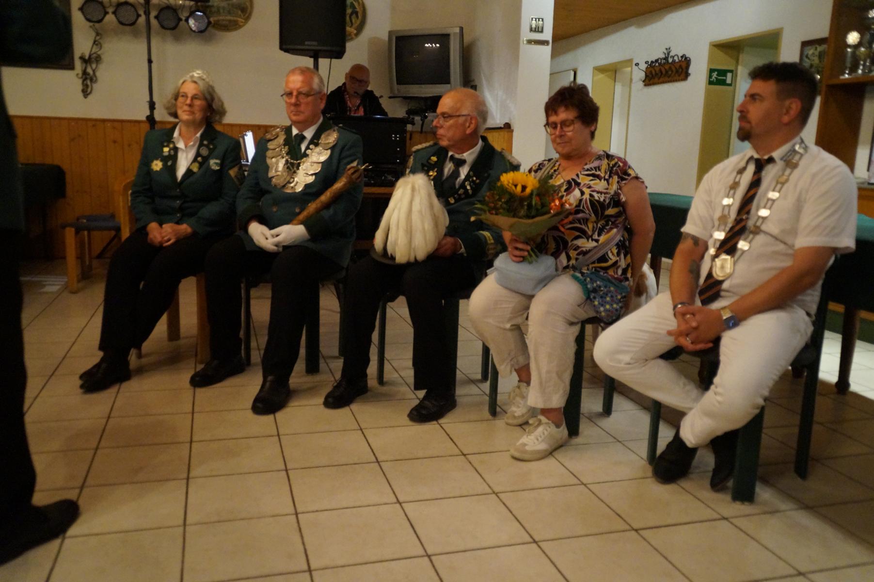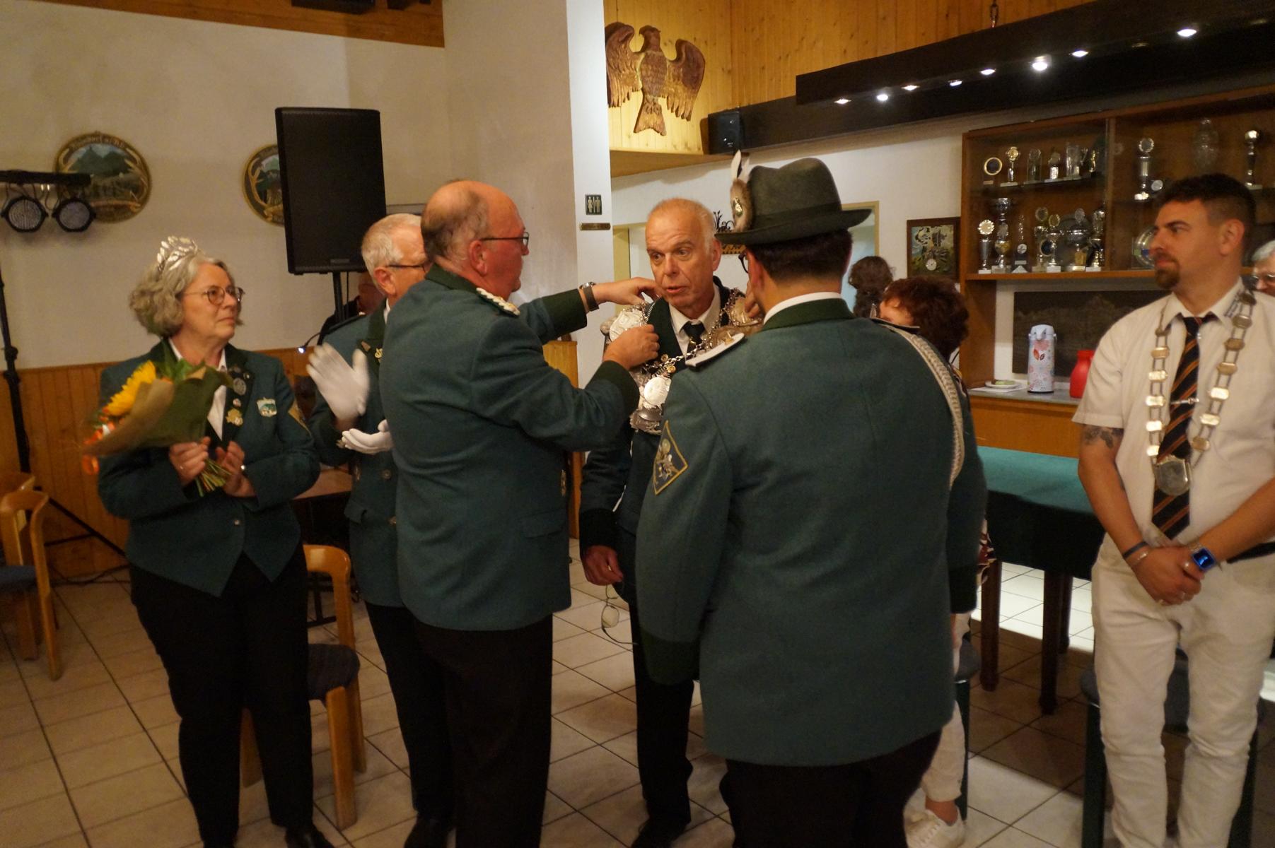 Gegen 21 Uhr folgte die feierliche Übergabe der Königswürde. Nach den Grußworten von Bürgermeister Otto Neuhoff dankte Präsident Ralf Wagner dem scheidenden Königspaar Ralf und Marie Jose Püllen für ihr Engagement. Mit einem dreifachen „HORIDO“ übergab er die Insignien an das neue Königspaar Jürgen und Anita Kuhn.