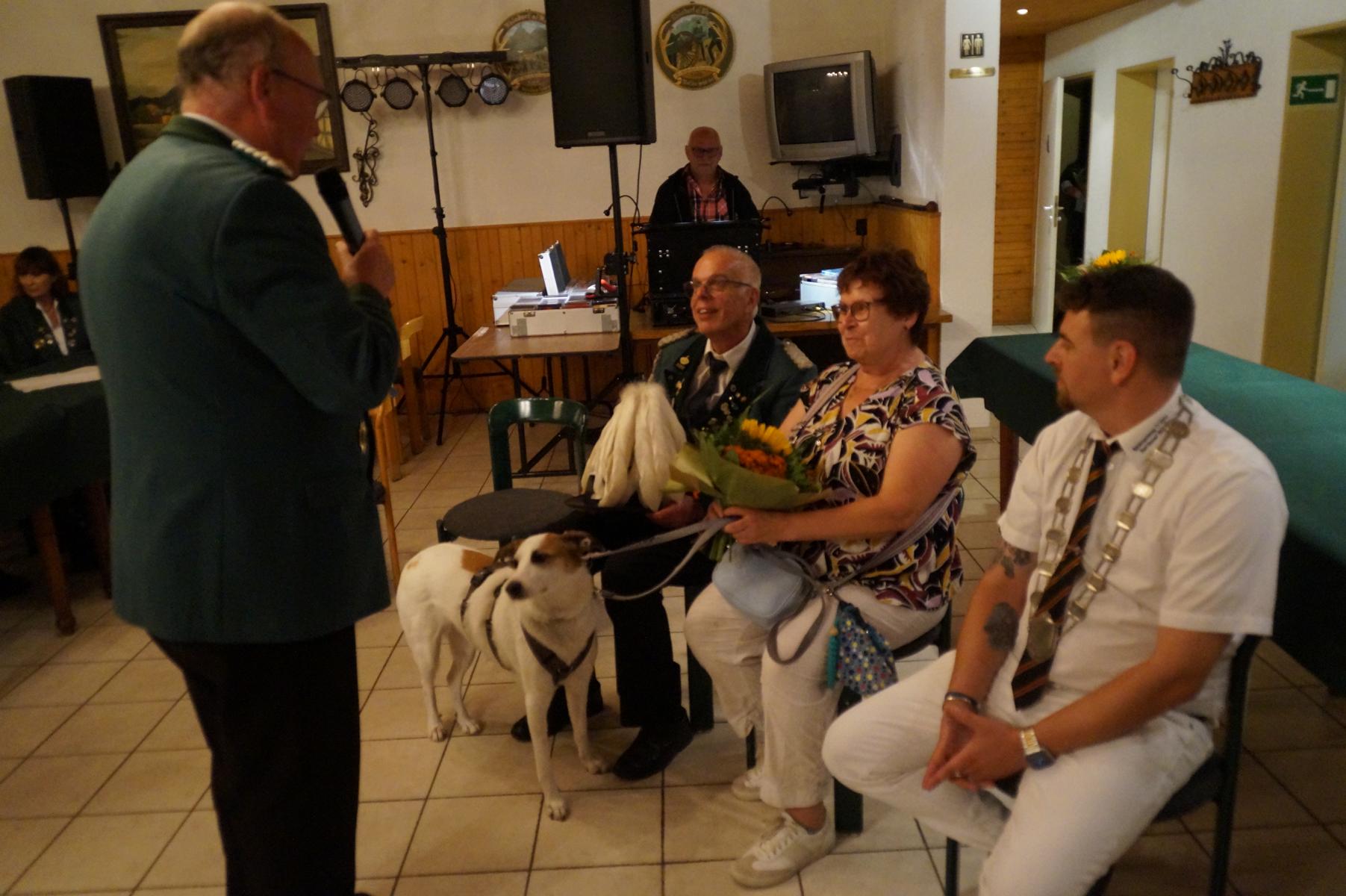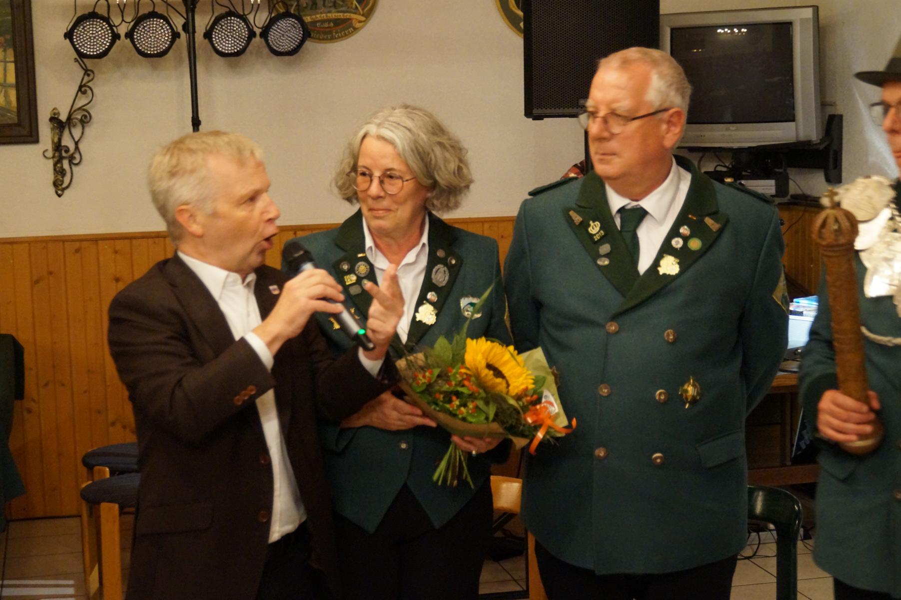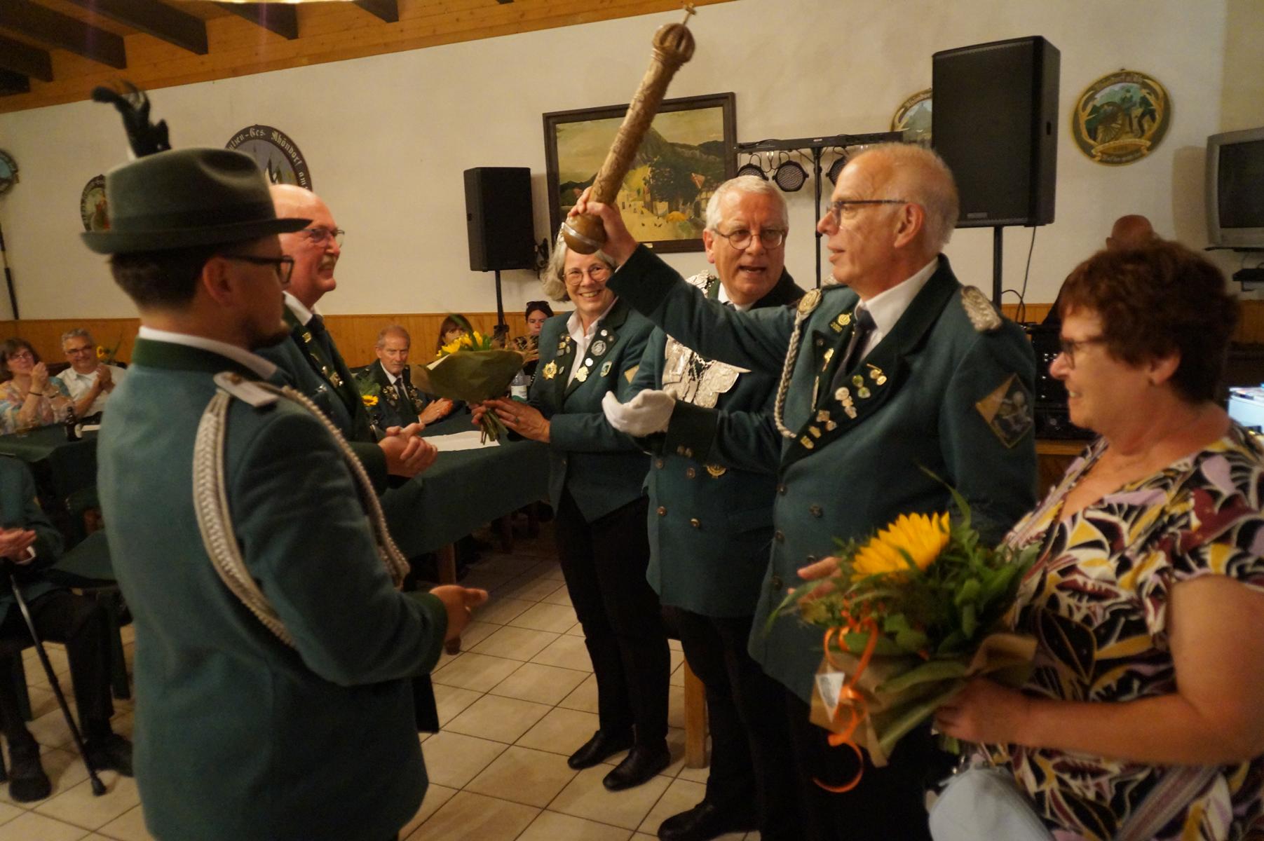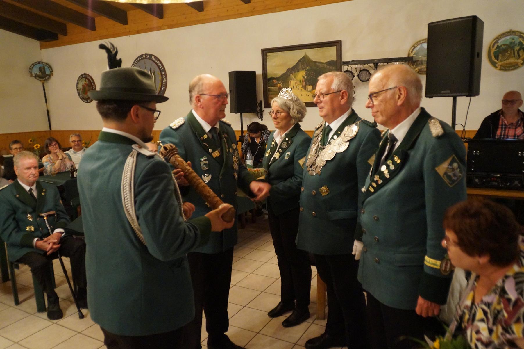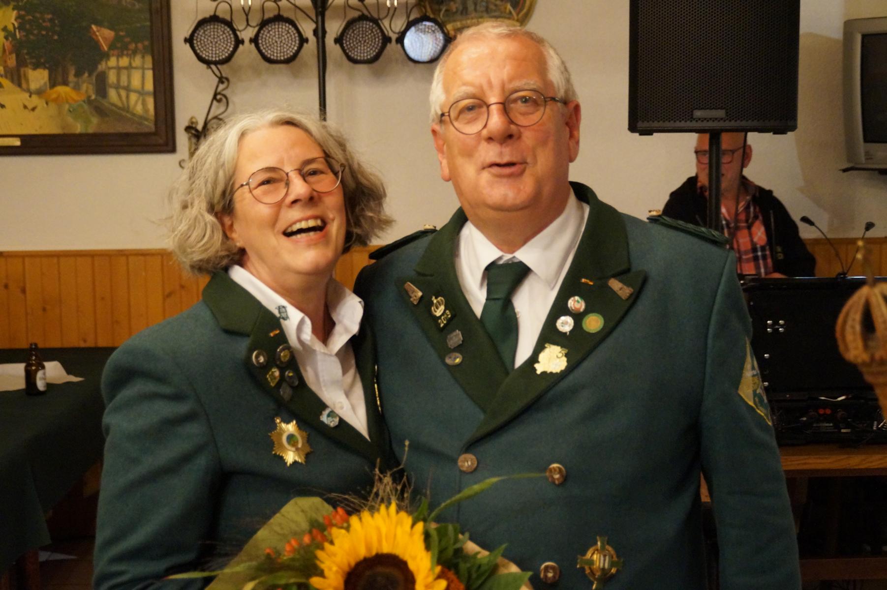 Gegen 21 Uhr folgte die feierliche Übergabe der Königswürde. Nach den Grußworten von Bürgermeister Otto Neuhoff dankte Präsident Ralf Wagner dem scheidenden Königspaar Ralf und Marie Jose Püllen für ihr Engagement. Mit einem dreifachen „HORIDO“ übergab er die Insignien an das neue Königspaar Jürgen und Anita Kuhn.