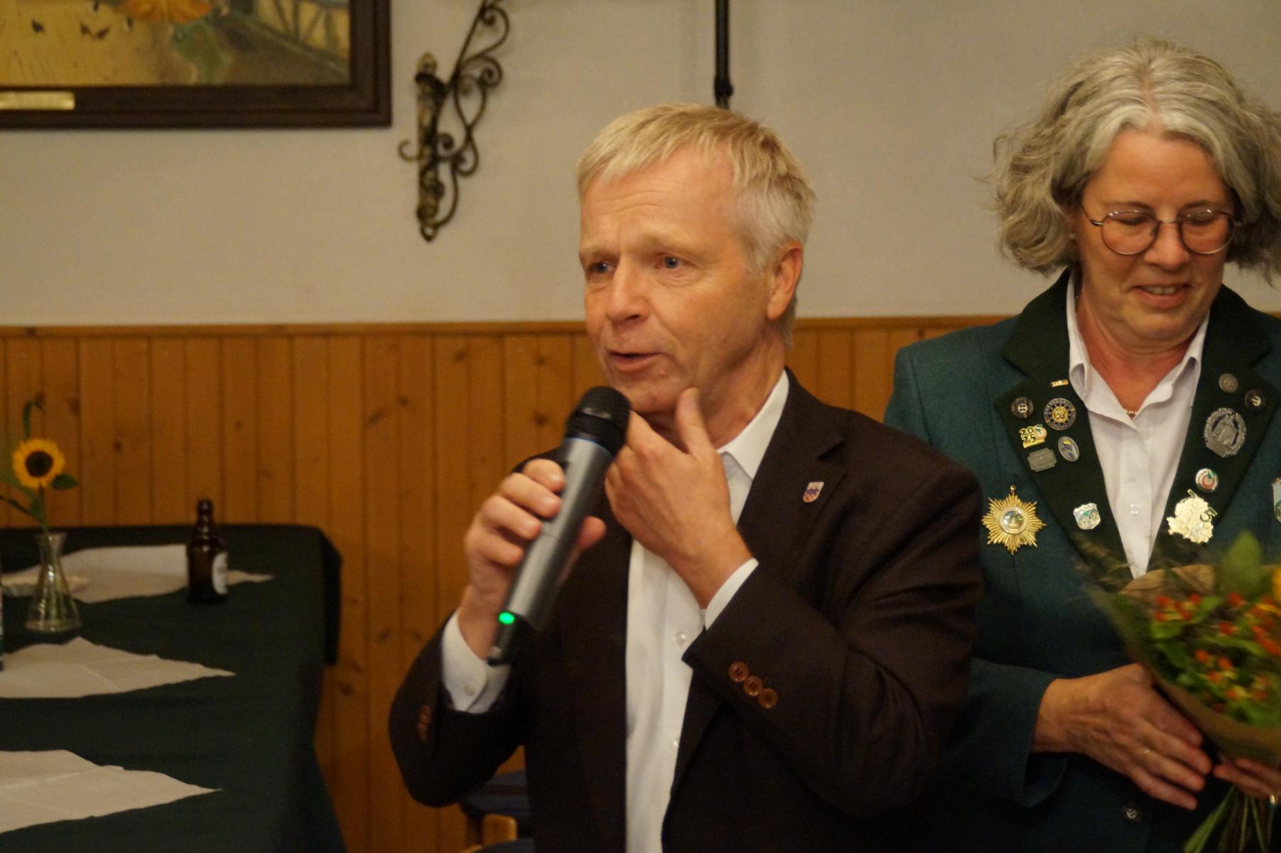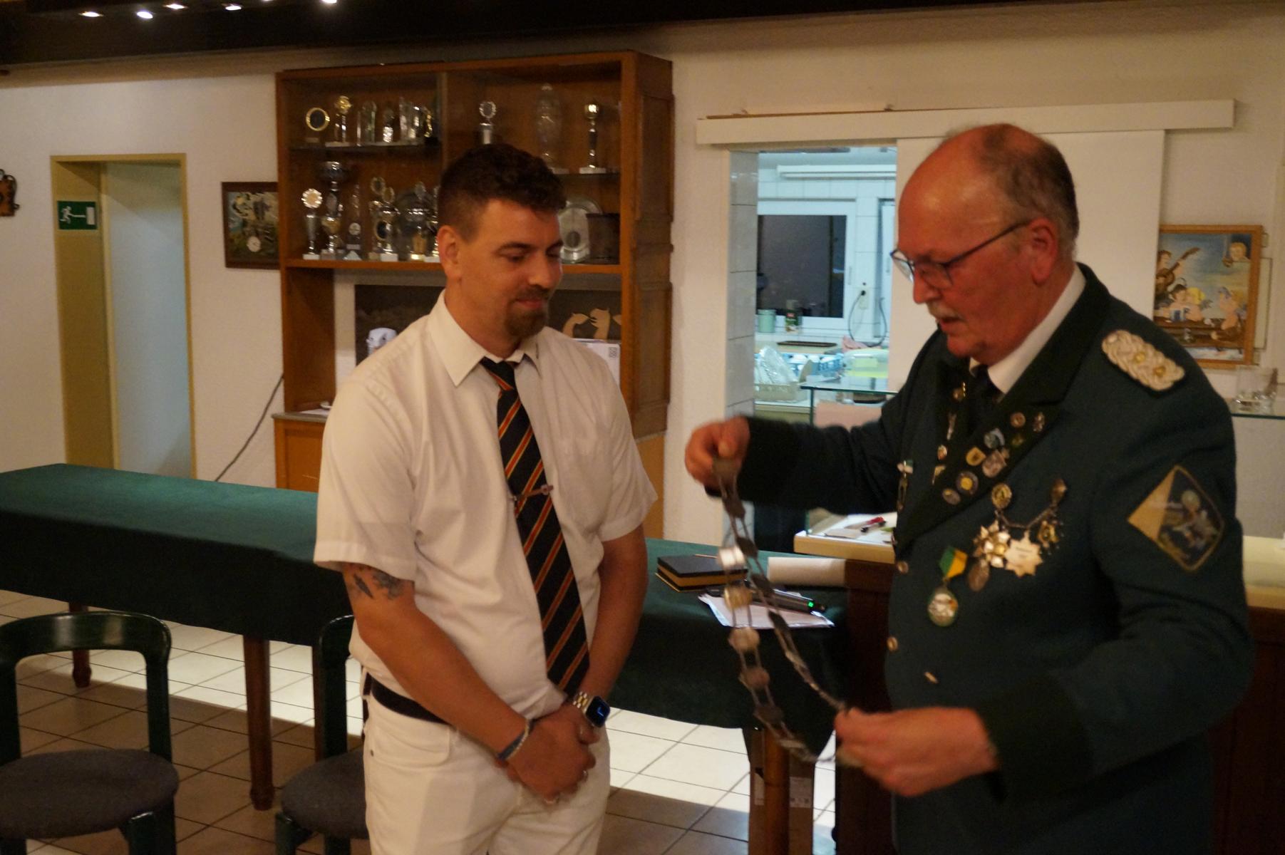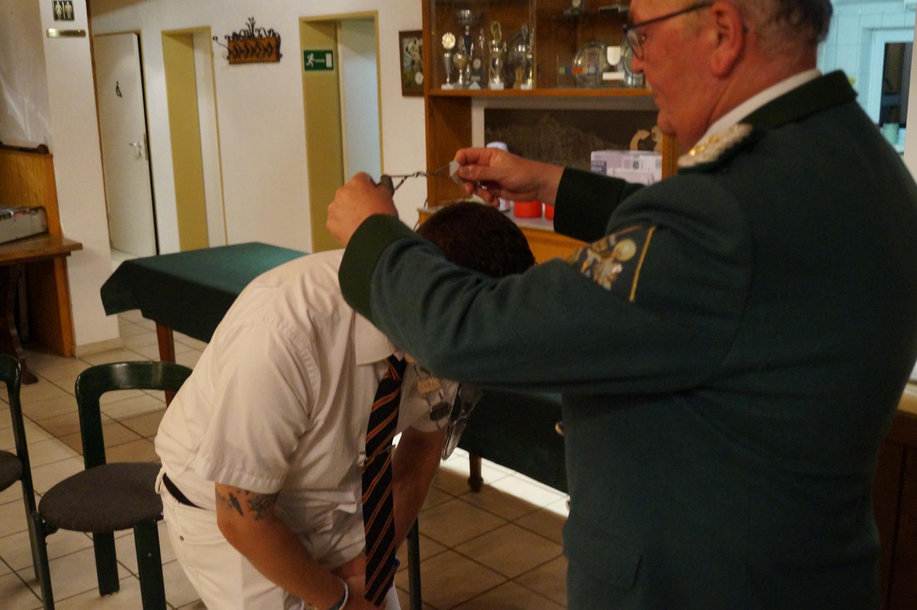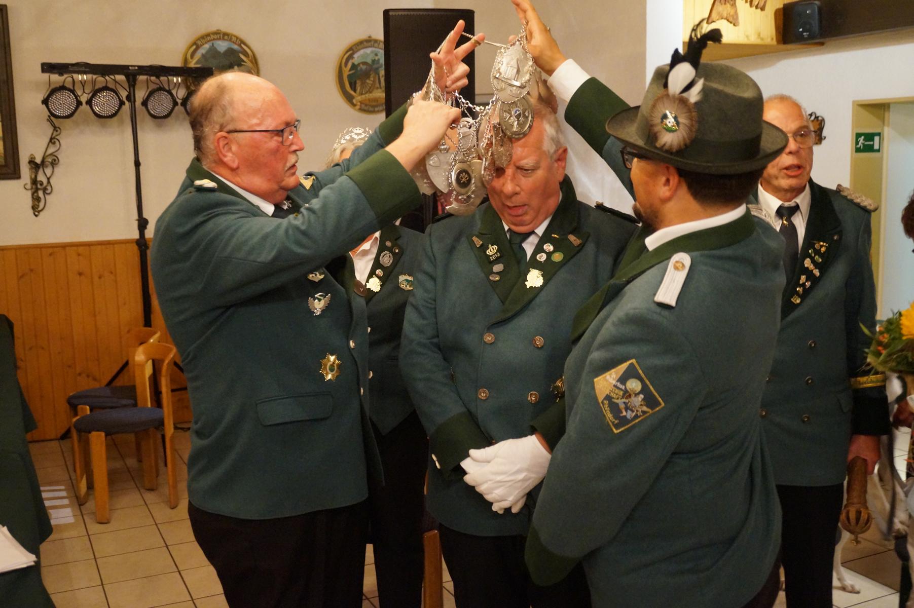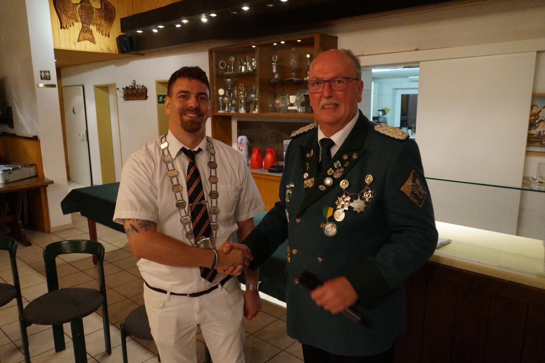 Gegen 21 Uhr folgte die feierliche Übergabe der Königswürde. Nach den Grußworten von Bürgermeister Otto Neuhoff dankte Präsident Ralf Wagner dem scheidenden Königspaar Ralf und Marie Jose Püllen für ihr Engagement. Mit einem dreifachen „HORIDO“ übergab er die Insignien an das neue Königspaar Jürgen und Anita Kuhn.