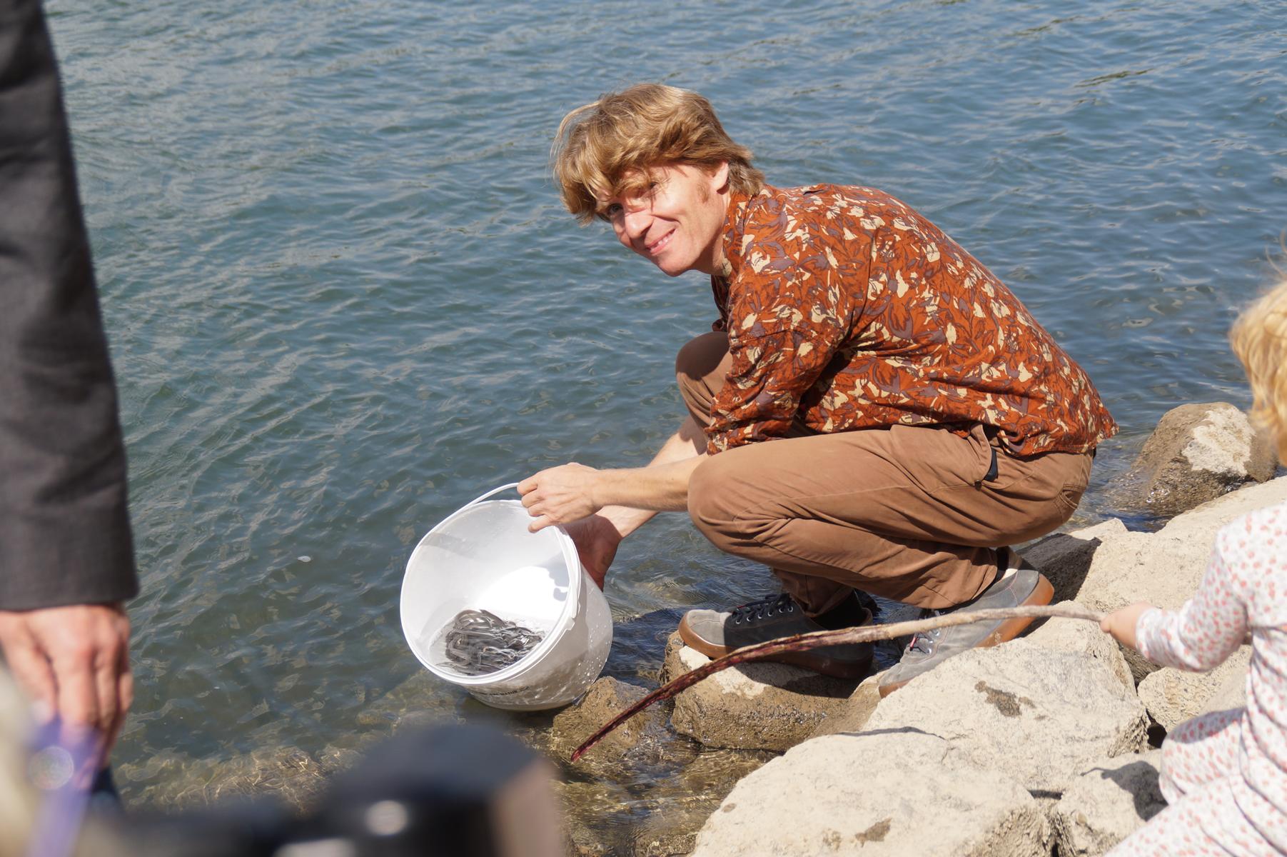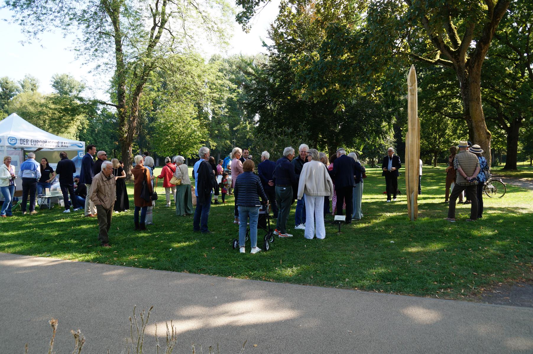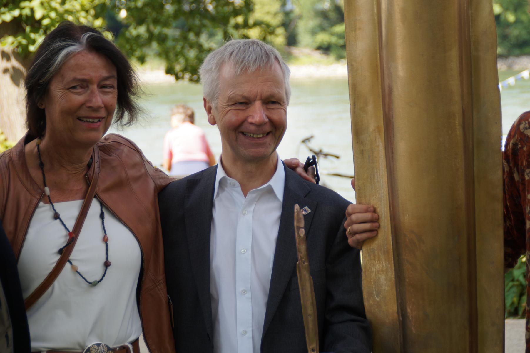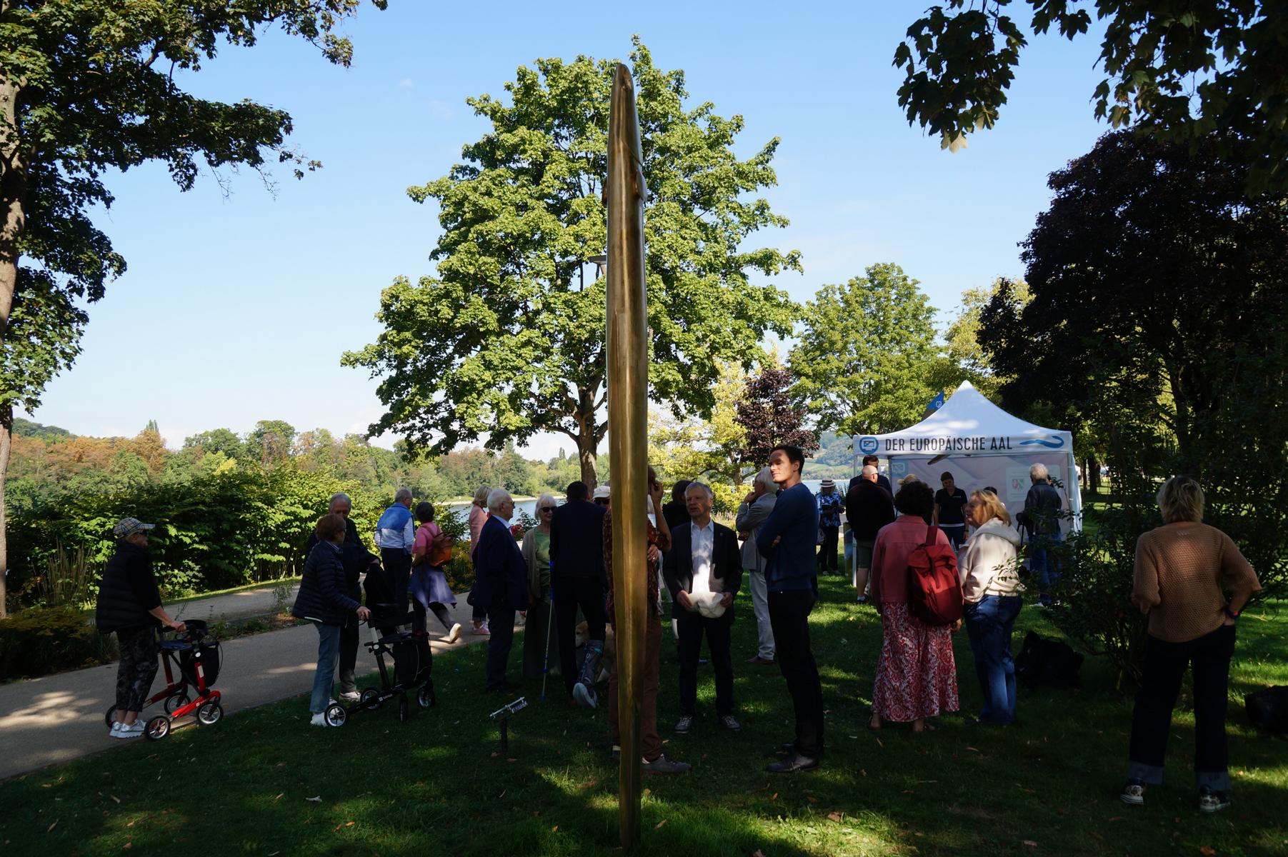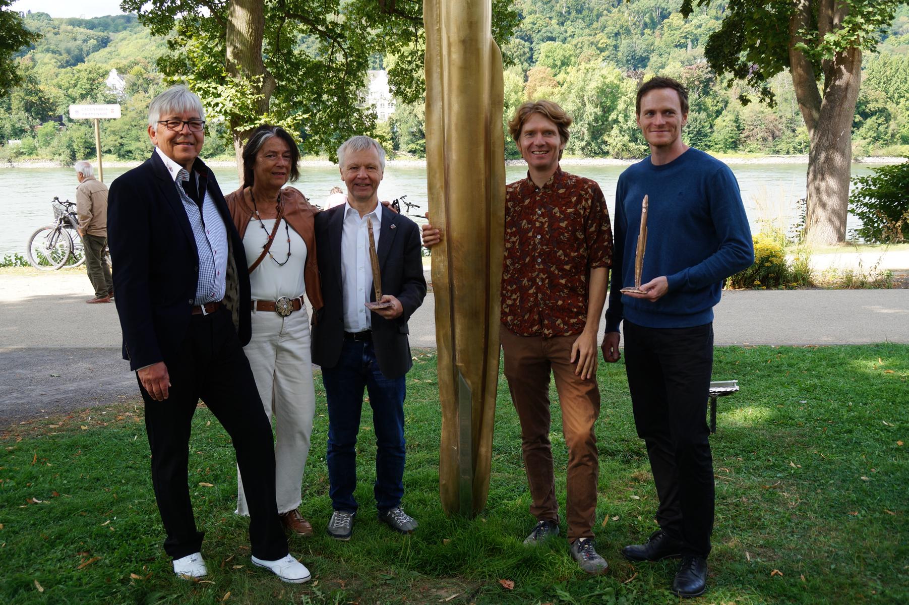 Der Umweltskulpturenpark auf der Insel Grafenwerth in Bad Honnef wächst. Am heutigen Sonntag wurde das 6. Kunstwerk der Öffentlichkeit übergeben. In Anwesenheit von zahlreichen Gästen aus der Kunstszene, der regionalen Politik und der Presse wurde der „Klima Aal“ von Markus Jeschaunig, österreichischer Künstler, präsentiert. Vorständin und Stifterin Dr. Beate Kummer würdigte das beeindruckende Werk mit folgenden Worten: „Die Aalskulptur passt hervorragend auf die Insel, weil damit nicht nur eine bedrohte Tierart besondere Aufmerksamkeit erlangt sondern auch auf den besonderen Bezug des Aals in Bad Honnef hingewiesen wird. Im Rhein ist der Bestand massiv zurück gegangen, deshalb freuen wir uns in besonderer Weise, dass Markus Jeschaunig mit seiner Arbeit dem Thema noch mehr Öffentlichkeit bietet.“ Die Prämierung wurde am vergangenem Sonntag (24.8.25) begleitet durch eine Aktion des Fischereiverbandes Westfalen-Lippe, die anwesenden Gäste konnten im Anschluss an das Kunstevent 600 lebende Aale in den Rhein aussetzen. Otto Neuhoff, Bürgermeister von Bad Honnef, ergänzte in seinem Grußwort seitens der Stadt: „Die ehrenamtlichen Klimainitiativen sind in nicht genug zu würdigen, denn ohne dieses Engagement würden Klima- und Umweltschutz nur schwer nahe an die Bürger herangetragen werden können.“
