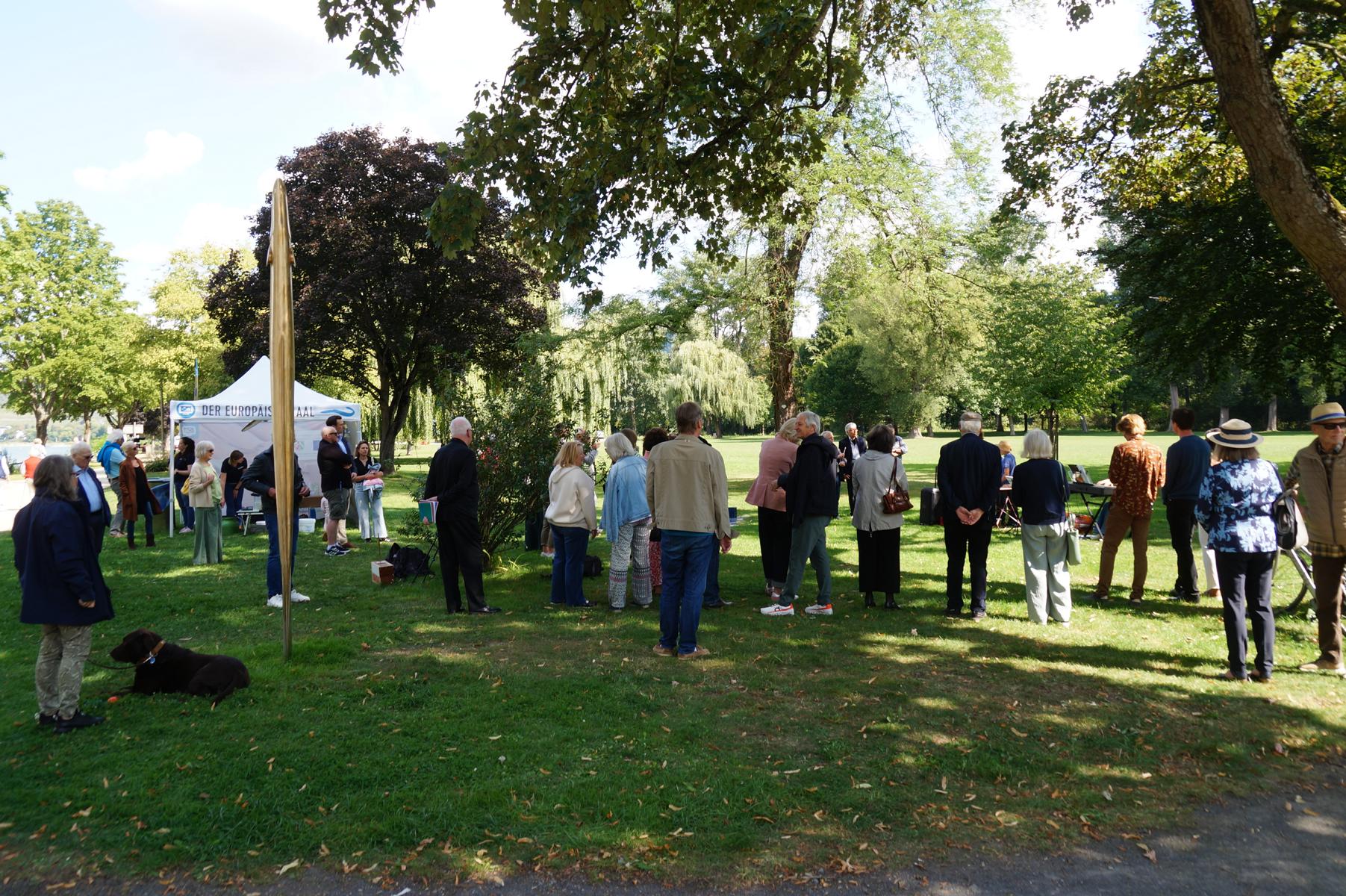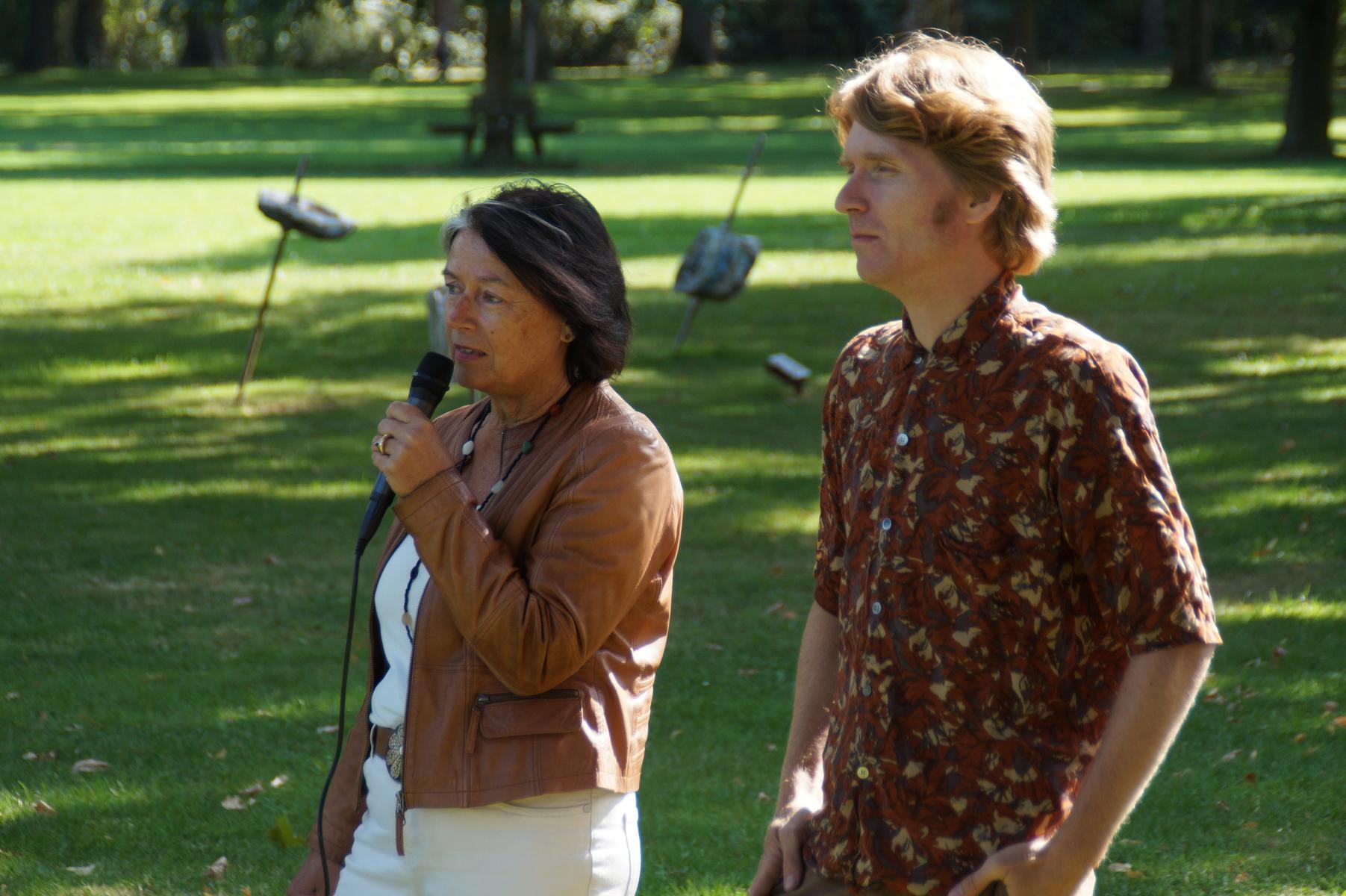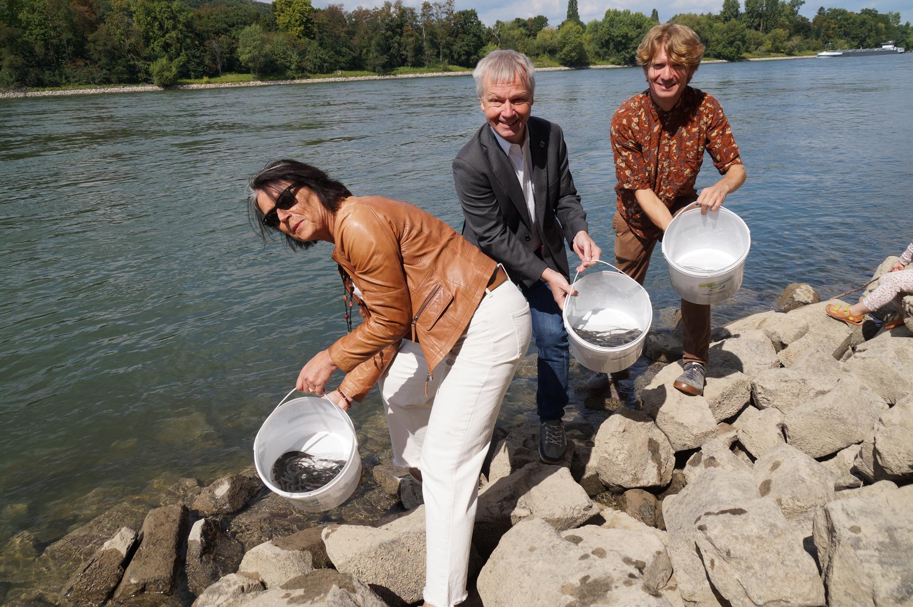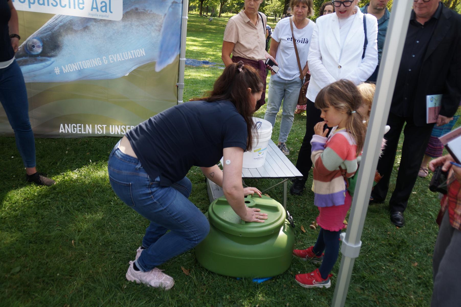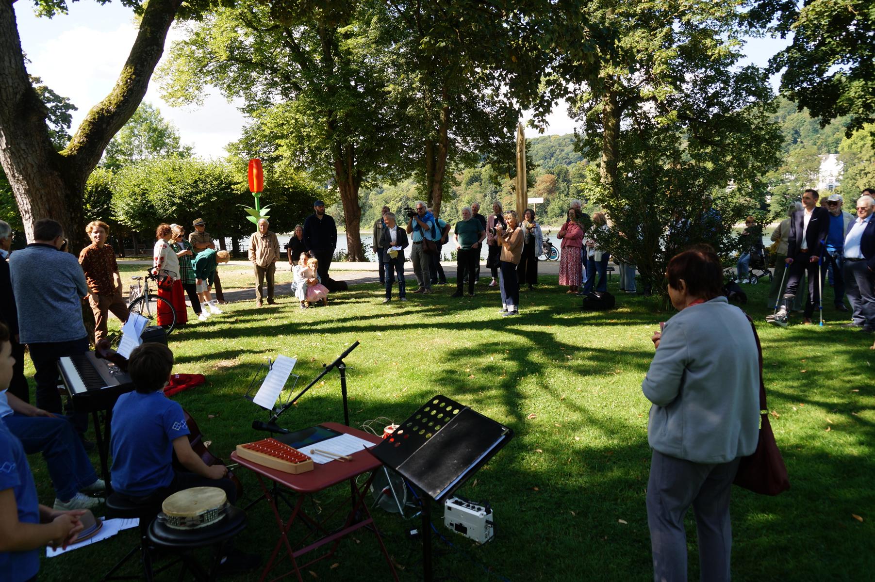 Der Umweltskulpturenpark auf der Insel Grafenwerth in Bad Honnef wächst. Am heutigen Sonntag wurde das 6. Kunstwerk der Öffentlichkeit übergeben. In Anwesenheit von zahlreichen Gästen aus der Kunstszene, der regionalen Politik und der Presse wurde der „Klima Aal“ von Markus Jeschaunig, österreichischer Künstler, präsentiert. Vorständin und Stifterin Dr. Beate Kummer würdigte das beeindruckende Werk mit folgenden Worten: „Die Aalskulptur passt hervorragend auf die Insel, weil damit nicht nur eine bedrohte Tierart besondere Aufmerksamkeit erlangt sondern auch auf den besonderen Bezug des Aals in Bad Honnef hingewiesen wird. Im Rhein ist der Bestand massiv zurück gegangen, deshalb freuen wir uns in besonderer Weise, dass Markus Jeschaunig mit seiner Arbeit dem Thema noch mehr Öffentlichkeit bietet.“ Die Prämierung wurde am vergangenem Sonntag (24.8.25) begleitet durch eine Aktion des Fischereiverbandes Westfalen-Lippe, die anwesenden Gäste konnten im Anschluss an das Kunstevent 600 lebende Aale in den Rhein aussetzen. Otto Neuhoff, Bürgermeister von Bad Honnef, ergänzte in seinem Grußwort seitens der Stadt: „Die ehrenamtlichen Klimainitiativen sind in nicht genug zu würdigen, denn ohne dieses Engagement würden Klima- und Umweltschutz nur schwer nahe an die Bürger herangetragen werden können.“