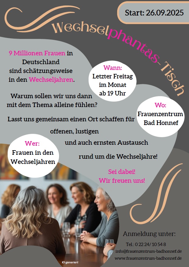 Im September startet im Bad Honnefer Frauenzentrum ein ganz besonderer Stammtisch: Der „Wechselphantas-Tisch“ – ein geschützter Raum für Frauen, die in den Wechseljahren stecken oder sich auf diese Lebensphase vorbereiten möchten.