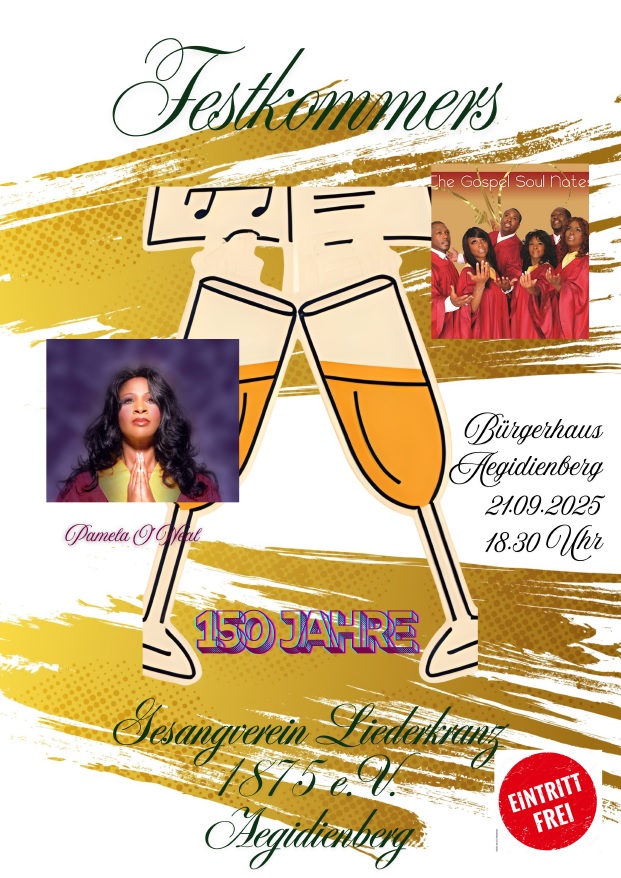 Nach einer kurzen Pause erwartet die Gäste ein musikalisches Highlight: Pamela O’Neal, begleitet von Chor, präsentiert ein Programm voller Energie, Gefühl und musikalischer Tiefe. Die Sängerin, die bereits mit internationalen Größen wie James Brown, Ray Charles, Mariah Carey, Udo Jürgens und den Weather Girls auf der Bühne stand, bringt ihre einzigartige Stimme und Präsenz nach Aegidienberg. Ihre Musik berührt und heilt – ein Erlebnis, das unter die Haut geht.
