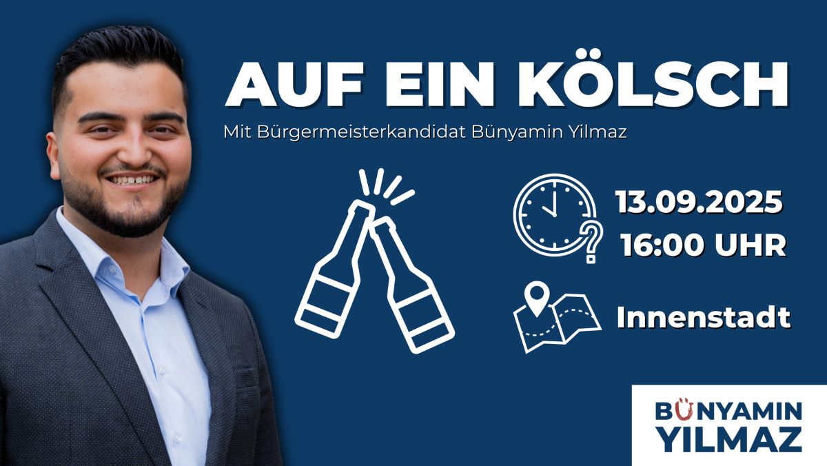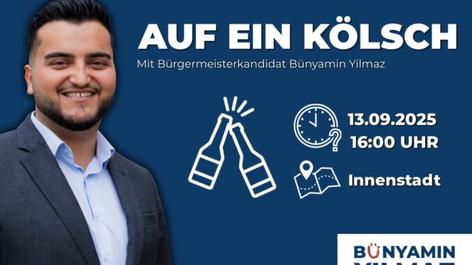 Als besonderen Abschluss lädt der Bürgermeisterkandidat ab 16 Uhr „Auf ein Kölsch“ ein. „Ich möchte den Wahlkampf gemeinsam mit den Bürgerinnen und Bürgern entspannt ausklingen lassen. Für mich ist das ein schöner Abschluss vor dem ersten Wahlgang und zugleich die Vorbereitung auf die kommenden Wochen, falls es zu einer Stichwahl kommt.“, so Yilmaz.