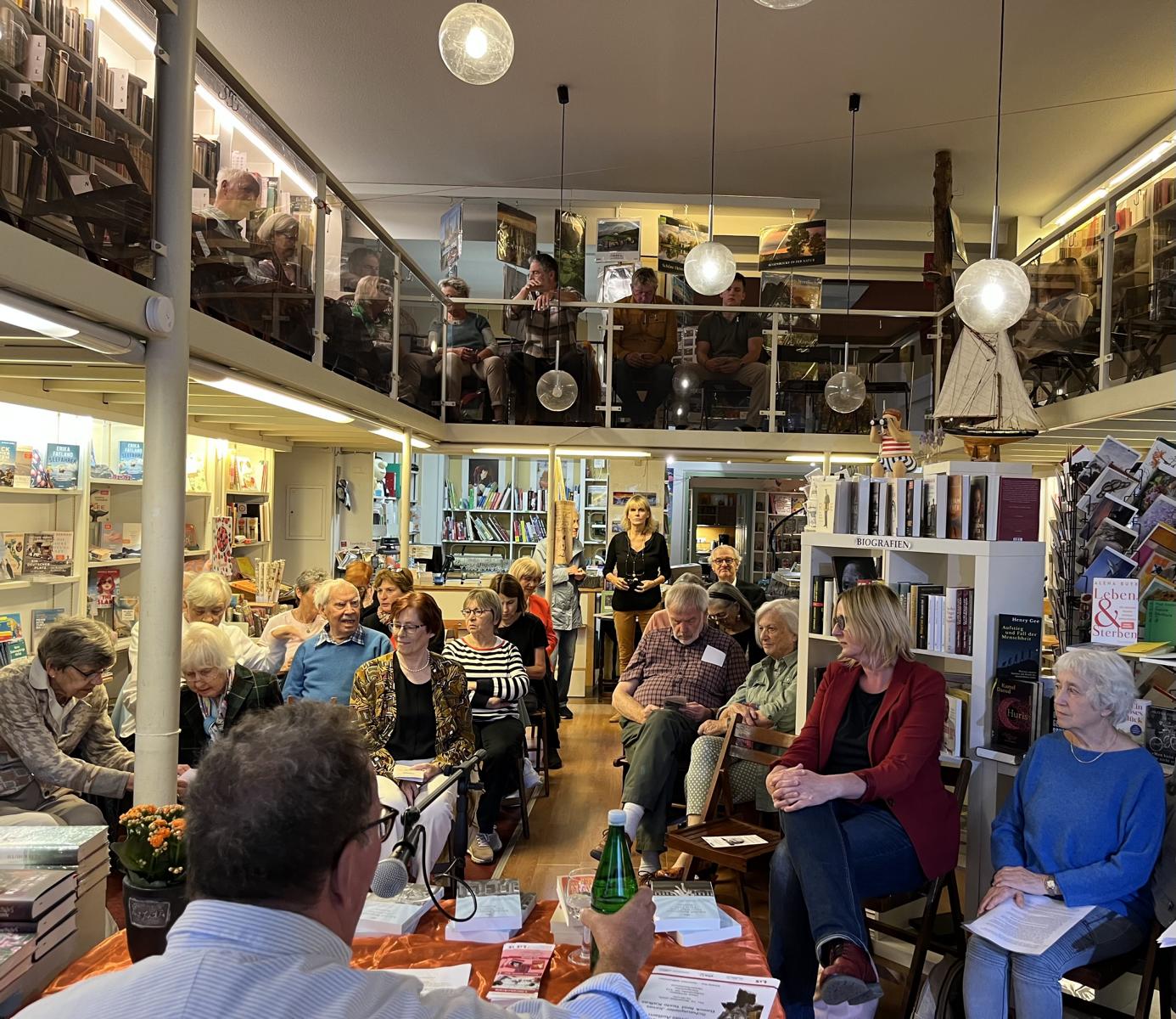 Ein trauriger Anlass, aber dennoch kein trauriger Abend, denn die Werke Michel Bergmanns sind trotz ernster Themen durchweg humorvoll. Schon sein erstes Werk wurde ein großer Erfolg. Danach folgten vier lustige und spannende Krimis mit dem Obertitel „Der Rabbi und der Kommissar“. Der letzte ist posthum vor einer Woche erschienen. Was die Bücher für die Leser und Leserinnen so interessant macht, ist, dass sie mit Ausnahme der Rabbi-Romane allesamt autobiografisch geprägt sind. Er schildert das jüdische Leben im Nachkriegs-Deutschland. Hin und wieder flechtet er Jiddisch ein. Auch das jiddische Glossar am Ende des Romans „Mameleben“ zeugt davon, das viele jiddische Begriffe Eingang in die deutsche Umgangssprache gefunden haben, wie zum Beispiel Schlamassel, Tinnef, Mischpoche, Schnorrer und zocken. Dies Buch ist sein persönlichstes Buch. Obwohl es vordergründig um eine komplizierte Mutter-Sohn-Geschichte geht, können vor allen Dingen Nachkriegskinder viele Gemeinsamkeiten erkennen. Die Kriegserfahrungen der Eltern haben auch deren Erziehung mit bestimmt. Die Zuhörer und Zuhörerinnen waren sich einig, dass diese Lesung kurz vor dem jüdischen Neujahrsfest Rosch-ha-Schana am 23. und 24. September eine wunderbare Würdigung dieses vielseitigen Autors war.