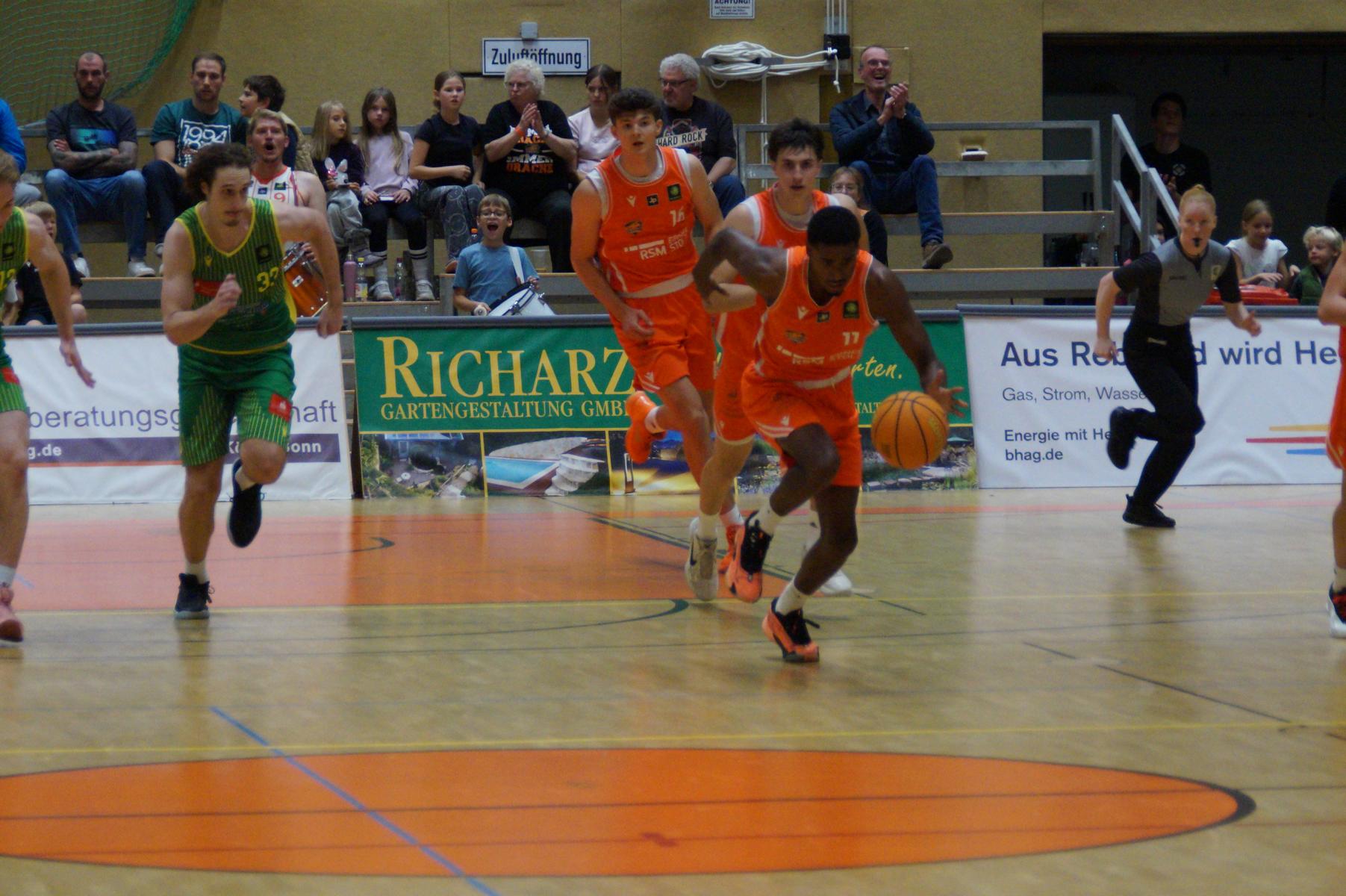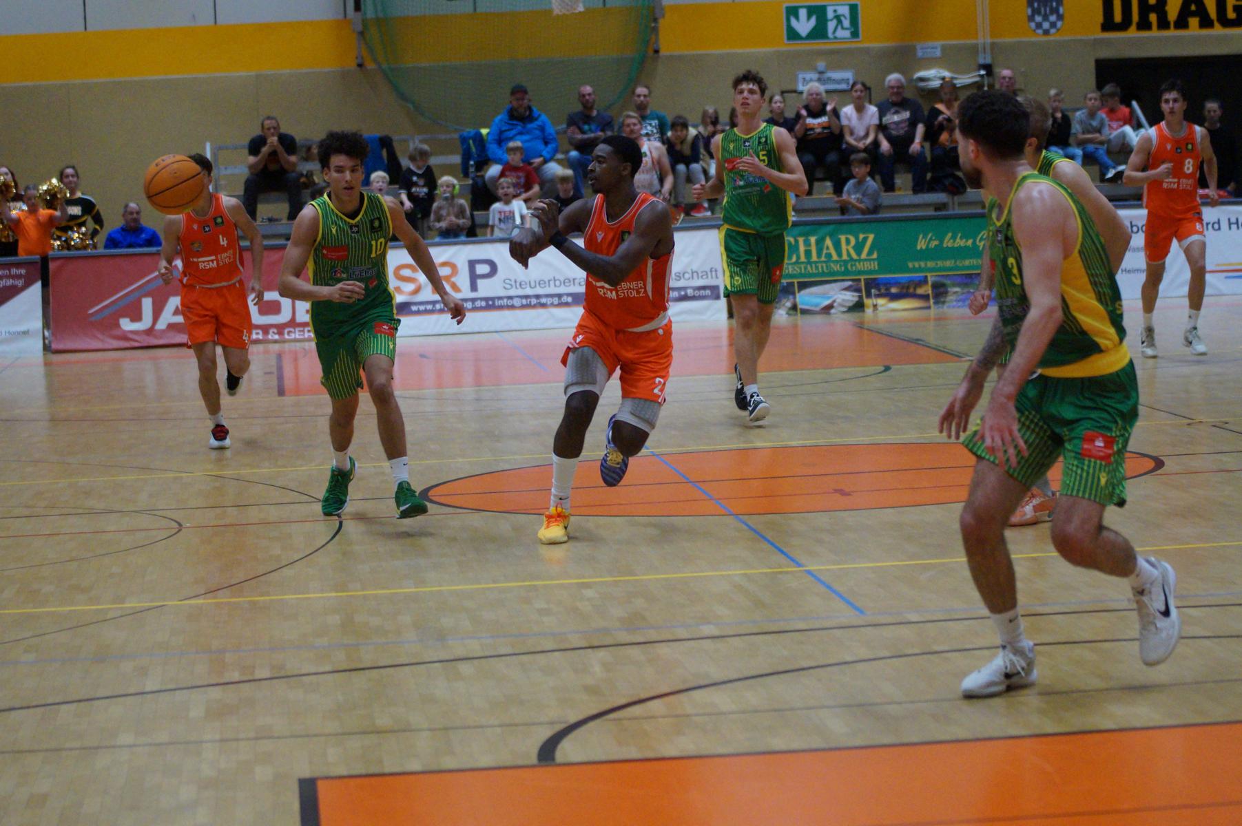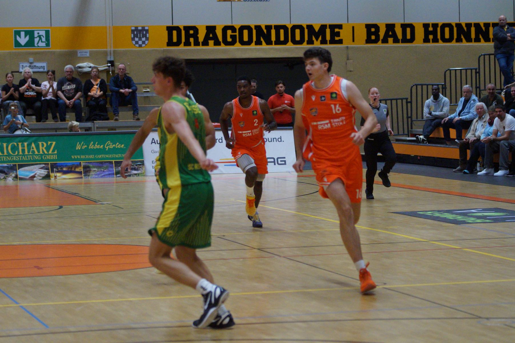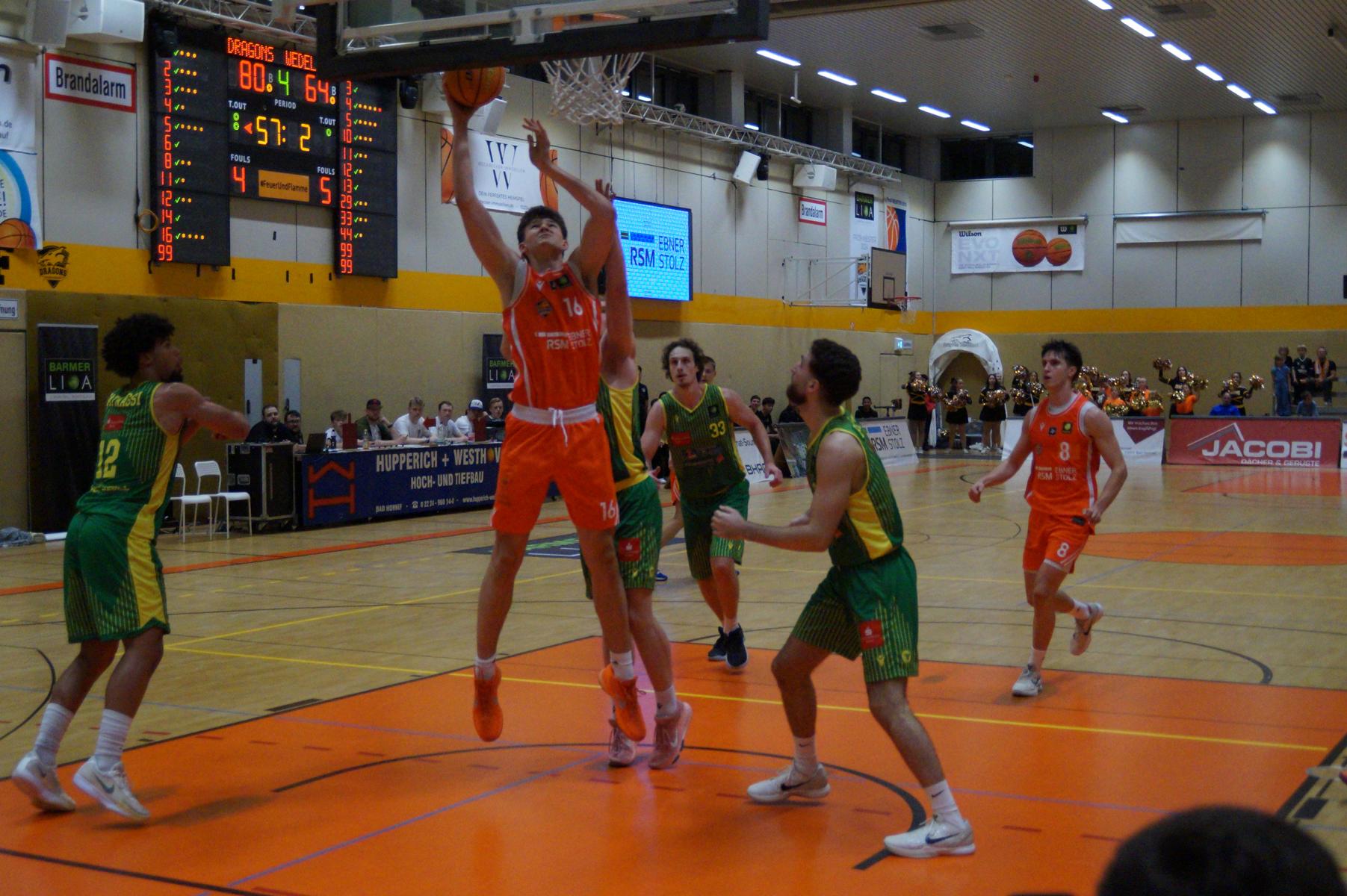Nach dem Seitenwechsel blieben die Gastgeber bis zur 24. Minute am Drücker (46:36), dann kassierte Benjamin Sadikovic (12 Pkt./8 Reb.) sein viertes persönliches Foul und Rhöndorfs Spiel geriet vorübergehend ins Stocken. Auf der Gegenseite markierte Rist Wedel einen 8:0-Lauf und kam auf 46:44 ran. Eine kritische Phase, die Lagui Diallo mit einem Dreier beendete. Im letzten Viertel legte dann Rémi Völkers entfesselt los und machte für seine Dragons den Deckel auf die Begegnung. Insgesamt verdienten sich die beiden jungen Guards Rémi Völkers (8 Pkt.) und Dusan Ilic (12 Pkt./6 Ass.) im Rhöndorfer Spielaufbau Bestnoten. Als dann der ebenfalls starke Kenan Reinhart, mit 20 Punkten Topscorer des Spiels, in der 37. Minute seinen zweiten Dreier zum 76:57 einklinkte, war der Sieg vorzeitig perfekt. Nicht unerwähnt soll die Leistung von Juhwan Harris-Dyson (13 Pkt./9 Reb.) bleiben, der mit seiner athletischen Spielweise den Gegner immer wieder vor Probleme stellte und wichtige Akzente zum Heimsieg beisteuerte.