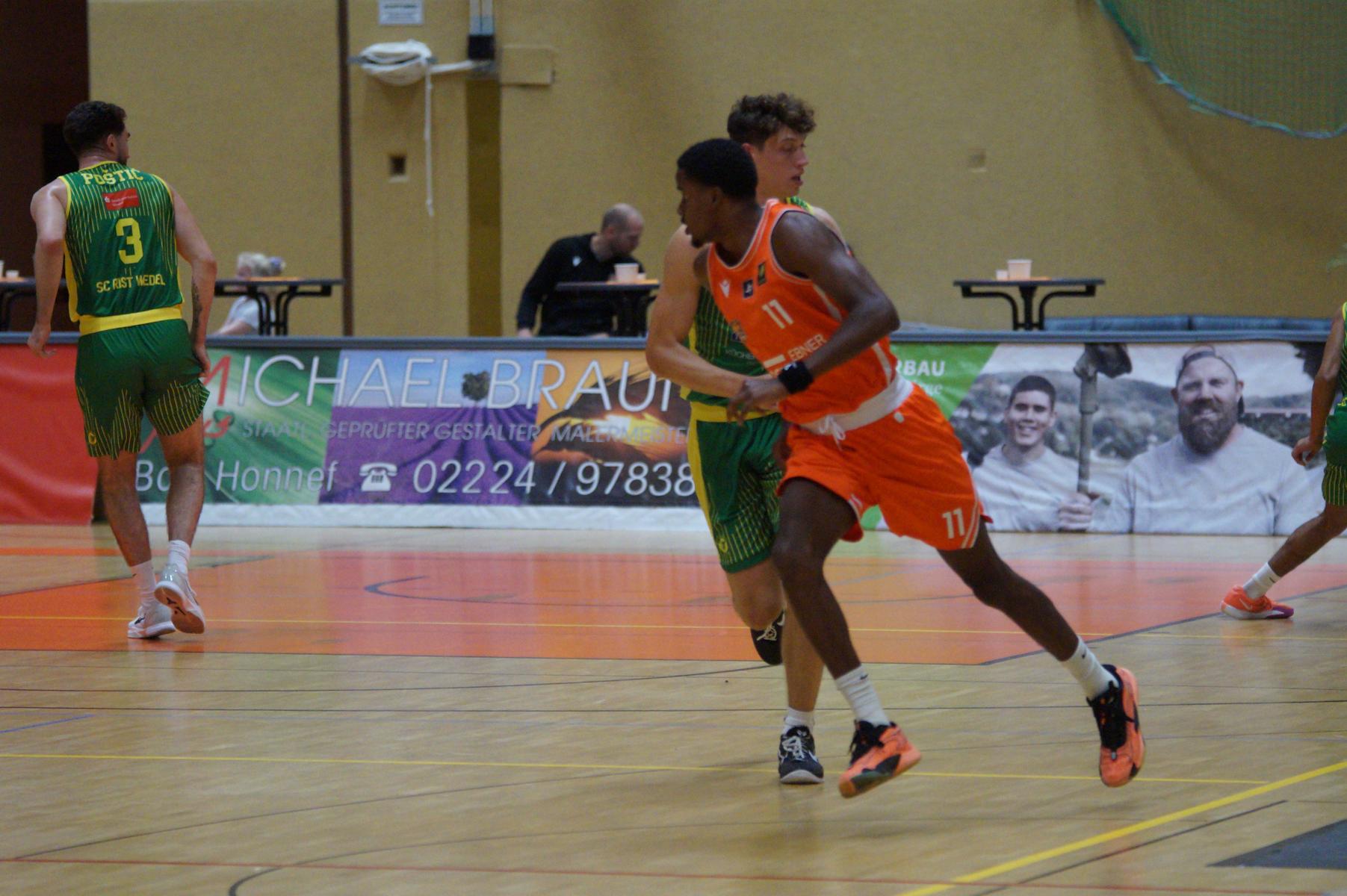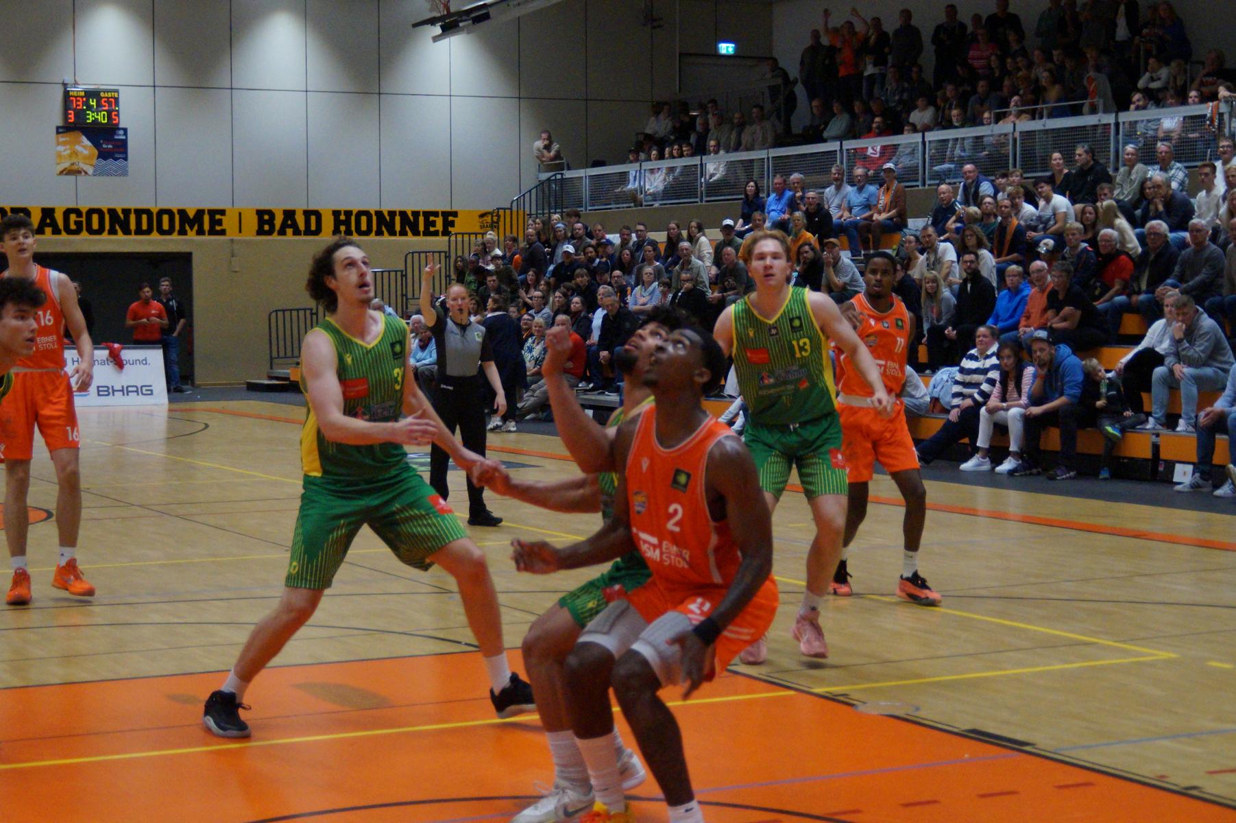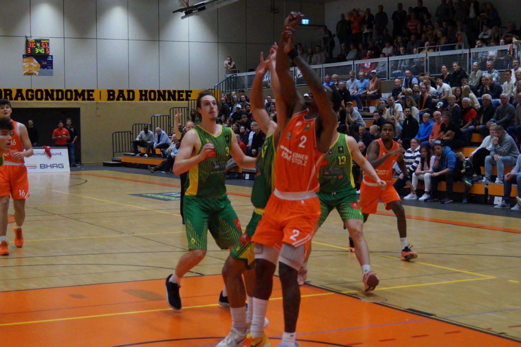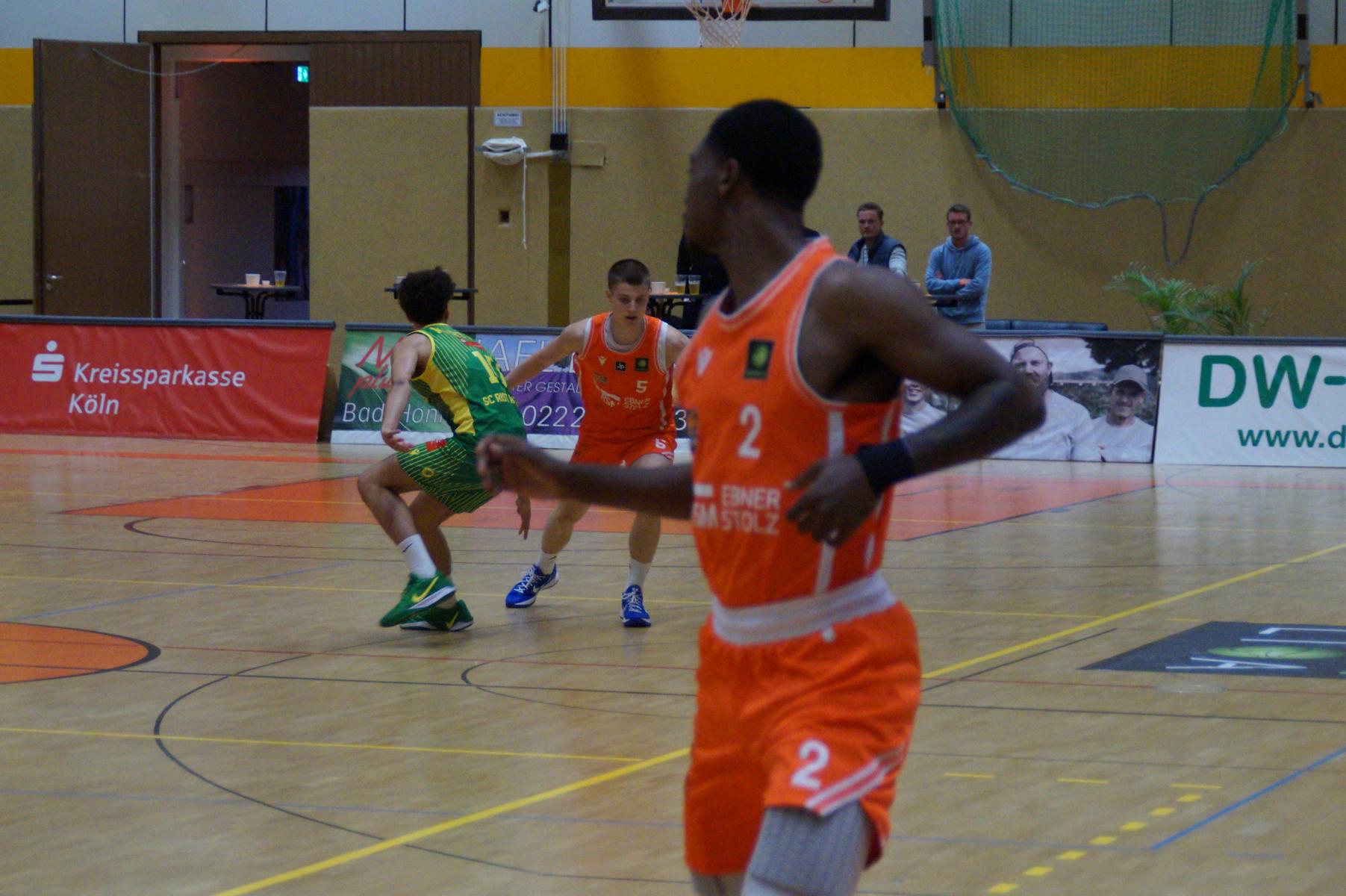 Nach dem Seitenwechsel blieben die Gastgeber bis zur 24. Minute am Drücker (46:36), dann kassierte Benjamin Sadikovic (12 Pkt./8 Reb.) sein viertes persönliches Foul und Rhöndorfs Spiel geriet vorübergehend ins Stocken. Auf der Gegenseite markierte Rist Wedel einen 8:0-Lauf und kam auf 46:44 ran. Eine kritische Phase, die Lagui Diallo mit einem Dreier beendete. Im letzten Viertel legte dann Rémi Völkers entfesselt los und machte für seine Dragons den Deckel auf die Begegnung. Insgesamt verdienten sich die beiden jungen Guards Rémi Völkers (8 Pkt.) und Dusan Ilic (12 Pkt./6 Ass.) im Rhöndorfer Spielaufbau Bestnoten. Als dann der ebenfalls starke Kenan Reinhart, mit 20 Punkten Topscorer des Spiels, in der 37. Minute seinen zweiten Dreier zum 76:57 einklinkte, war der Sieg vorzeitig perfekt. Nicht unerwähnt soll die Leistung von Juhwan Harris-Dyson (13 Pkt./9 Reb.) bleiben, der mit seiner athletischen Spielweise den Gegner immer wieder vor Probleme stellte und wichtige Akzente zum Heimsieg beisteuerte.