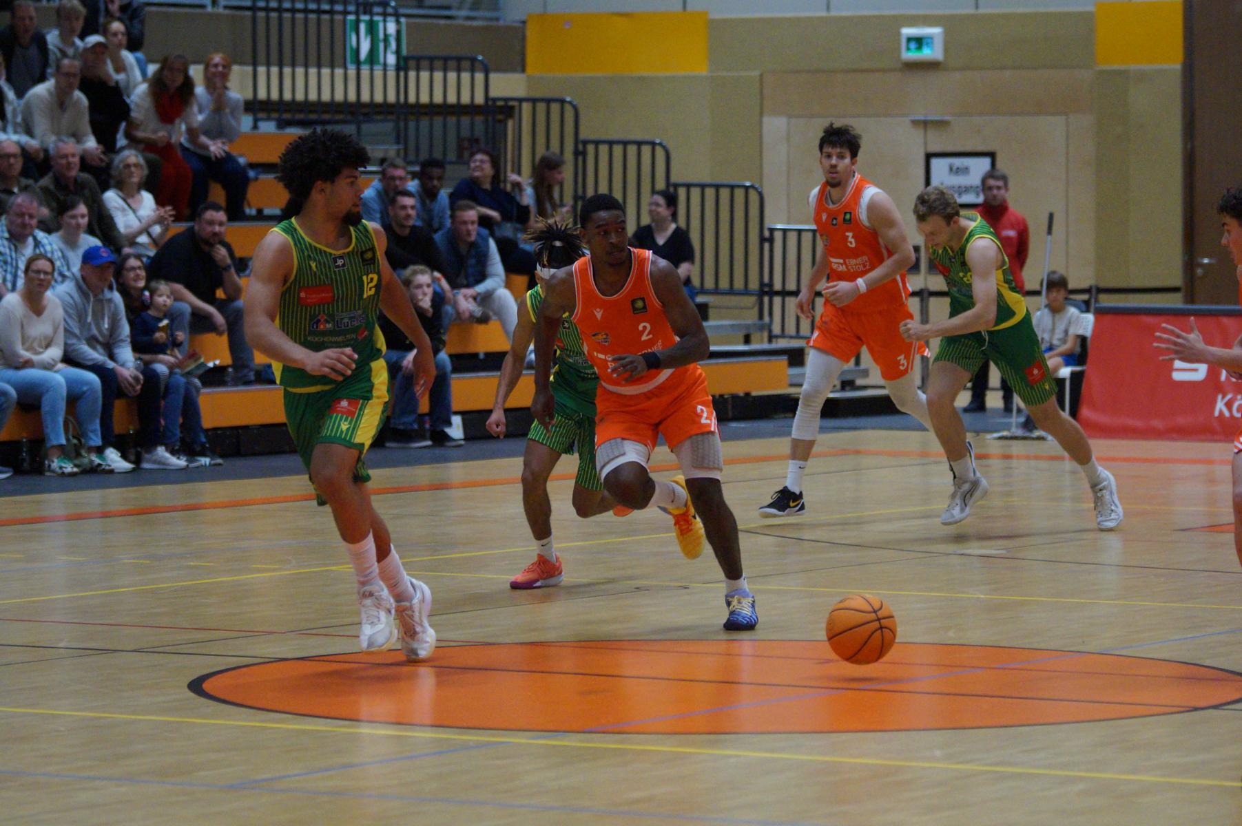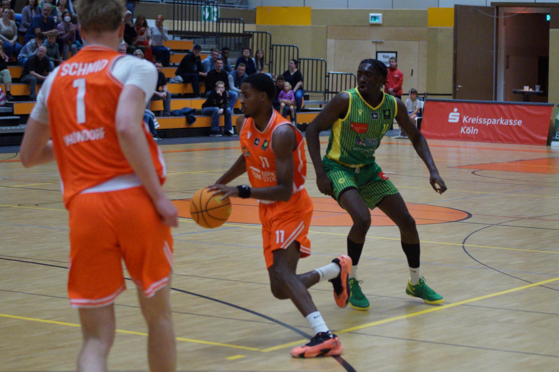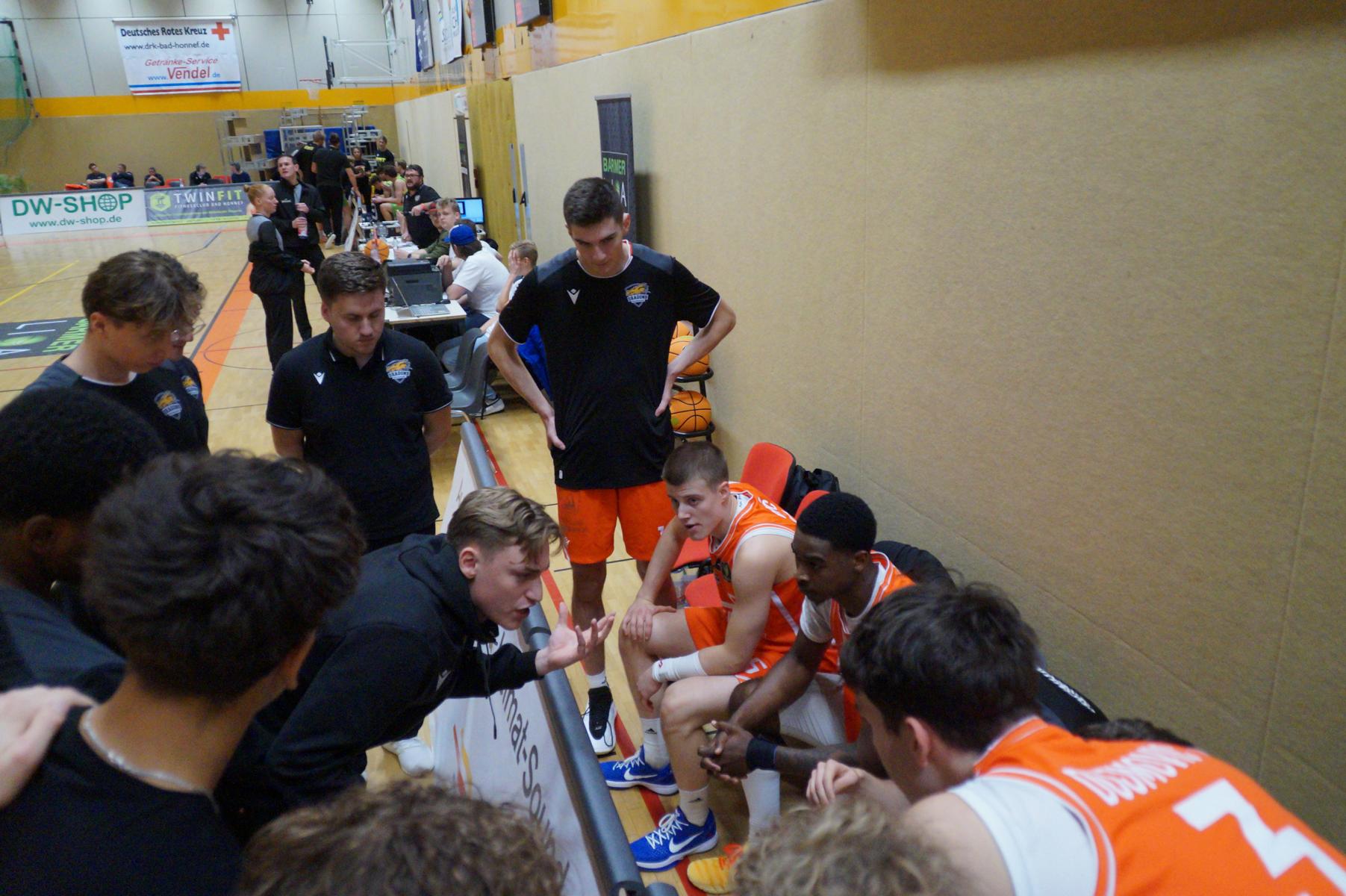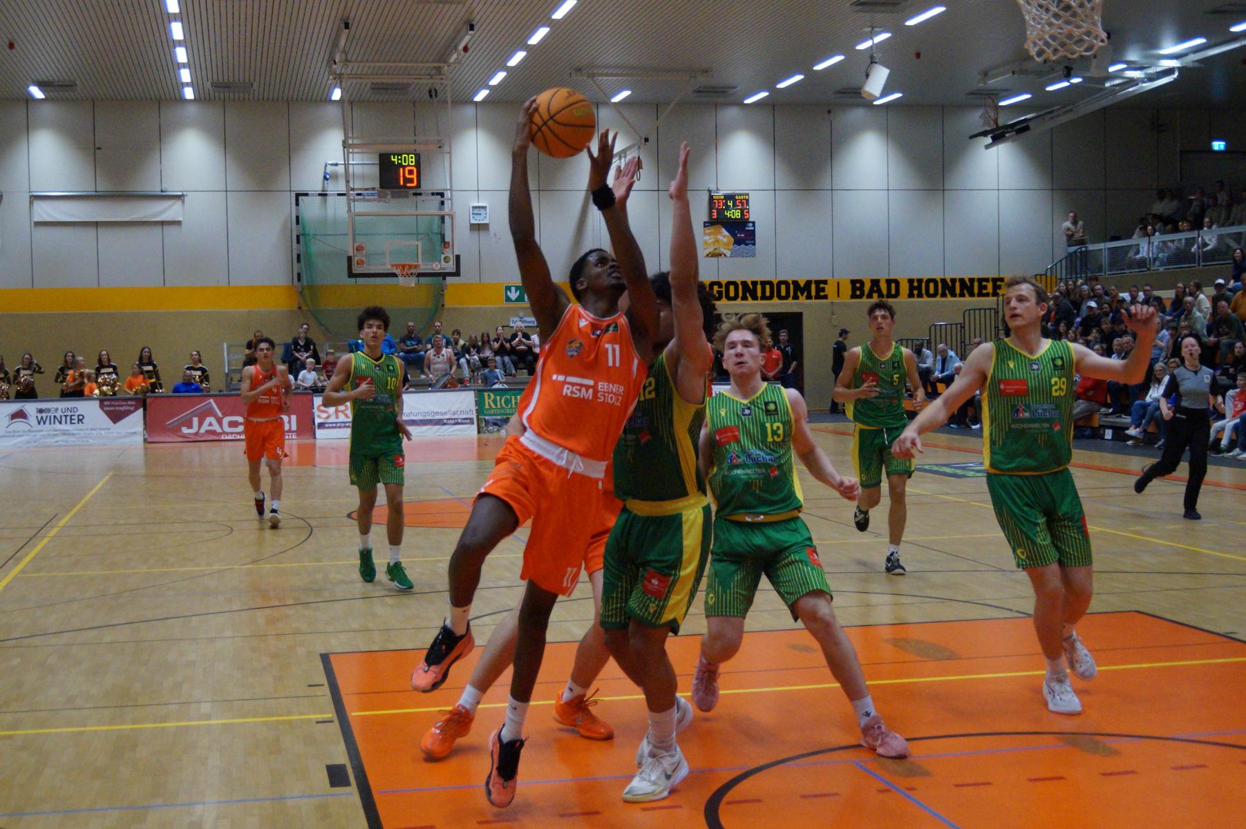 Nach dem Seitenwechsel blieben die Gastgeber bis zur 24. Minute am Drücker (46:36), dann kassierte Benjamin Sadikovic (12 Pkt./8 Reb.) sein viertes persönliches Foul und Rhöndorfs Spiel geriet vorübergehend ins Stocken. Auf der Gegenseite markierte Rist Wedel einen 8:0-Lauf und kam auf 46:44 ran. Eine kritische Phase, die Lagui Diallo mit einem Dreier beendete. Im letzten Viertel legte dann Rémi Völkers entfesselt los und machte für seine Dragons den Deckel auf die Begegnung. Insgesamt verdienten sich die beiden jungen Guards Rémi Völkers (8 Pkt.) und Dusan Ilic (12 Pkt./6 Ass.) im Rhöndorfer Spielaufbau Bestnoten. Als dann der ebenfalls starke Kenan Reinhart, mit 20 Punkten Topscorer des Spiels, in der 37. Minute seinen zweiten Dreier zum 76:57 einklinkte, war der Sieg vorzeitig perfekt. Nicht unerwähnt soll die Leistung von Juhwan Harris-Dyson (13 Pkt./9 Reb.) bleiben, der mit seiner athletischen Spielweise den Gegner immer wieder vor Probleme stellte und wichtige Akzente zum Heimsieg beisteuerte.