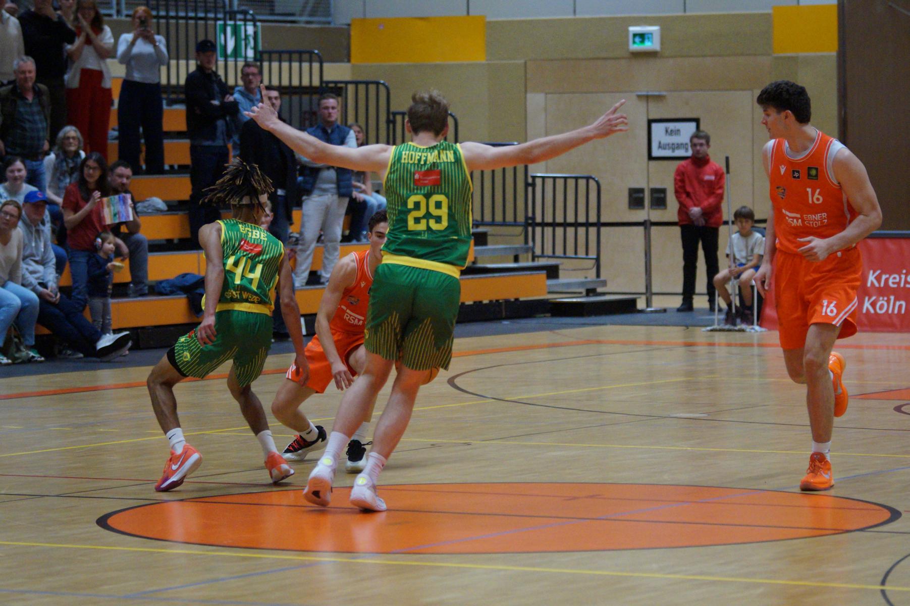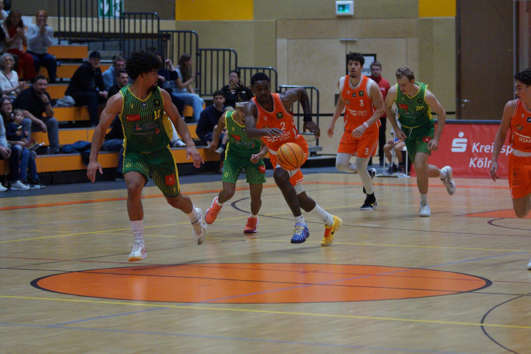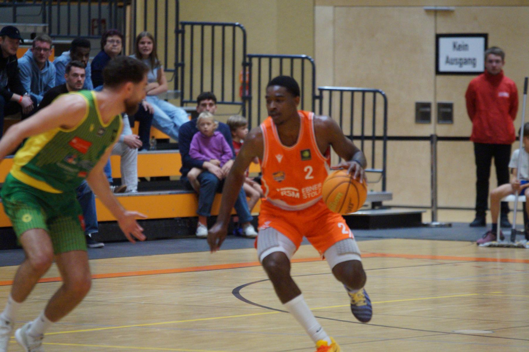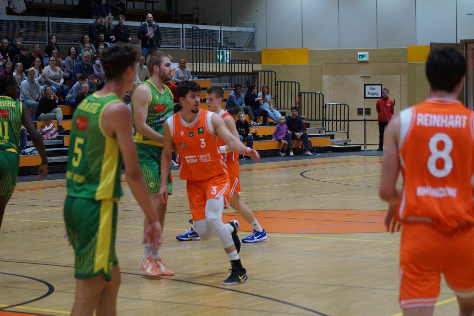 Nach dem Seitenwechsel blieben die Gastgeber bis zur 24. Minute am Drücker (46:36), dann kassierte Benjamin Sadikovic (12 Pkt./8 Reb.) sein viertes persönliches Foul und Rhöndorfs Spiel geriet vorübergehend ins Stocken. Auf der Gegenseite markierte Rist Wedel einen 8:0-Lauf und kam auf 46:44 ran. Eine kritische Phase, die Lagui Diallo mit einem Dreier beendete. Im letzten Viertel legte dann Rémi Völkers entfesselt los und machte für seine Dragons den Deckel auf die Begegnung. Insgesamt verdienten sich die beiden jungen Guards Rémi Völkers (8 Pkt.) und Dusan Ilic (12 Pkt./6 Ass.) im Rhöndorfer Spielaufbau Bestnoten. Als dann der ebenfalls starke Kenan Reinhart, mit 20 Punkten Topscorer des Spiels, in der 37. Minute seinen zweiten Dreier zum 76:57 einklinkte, war der Sieg vorzeitig perfekt. Nicht unerwähnt soll die Leistung von Juhwan Harris-Dyson (13 Pkt./9 Reb.) bleiben, der mit seiner athletischen Spielweise den Gegner immer wieder vor Probleme stellte und wichtige Akzente zum Heimsieg beisteuerte.