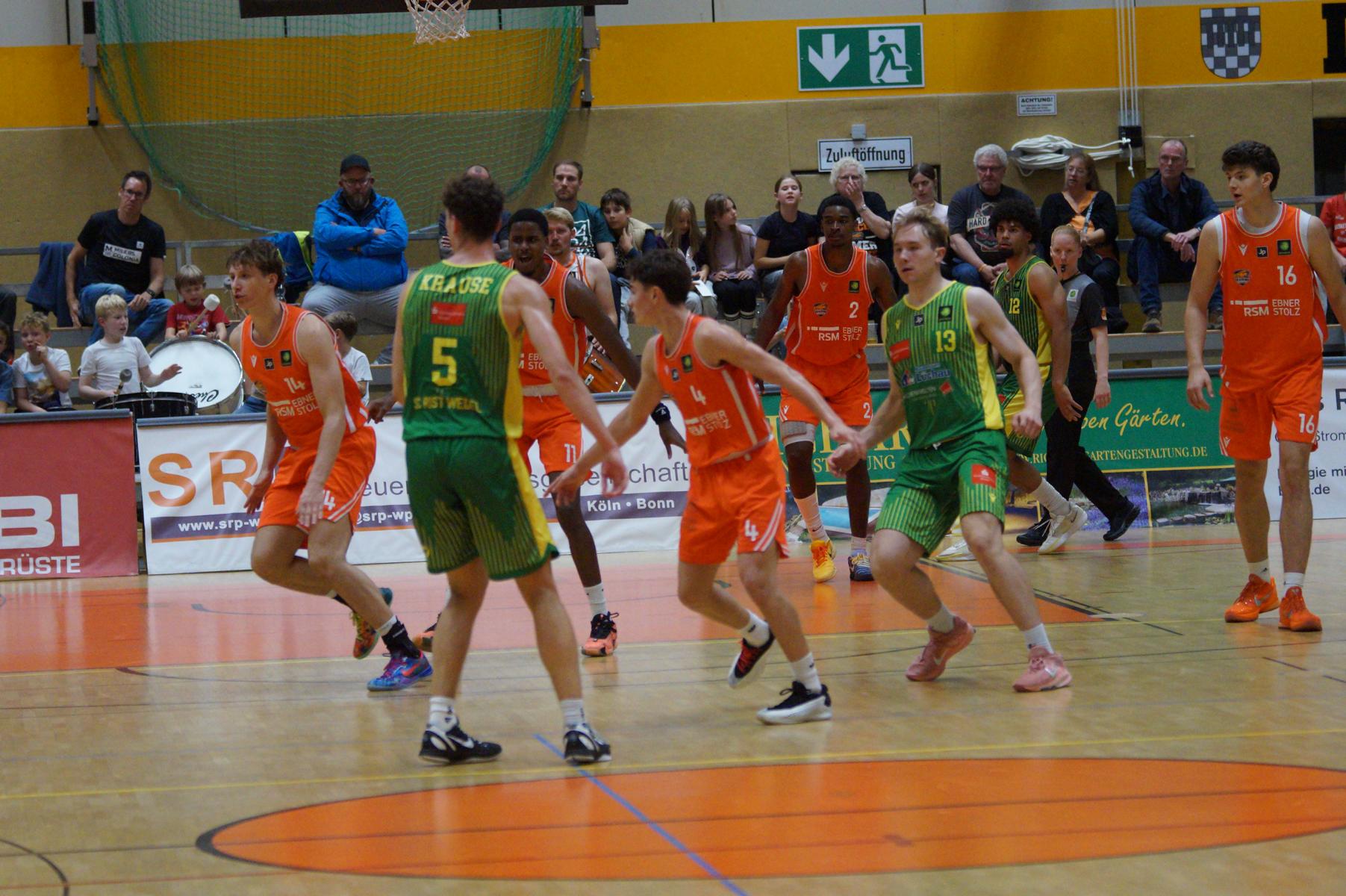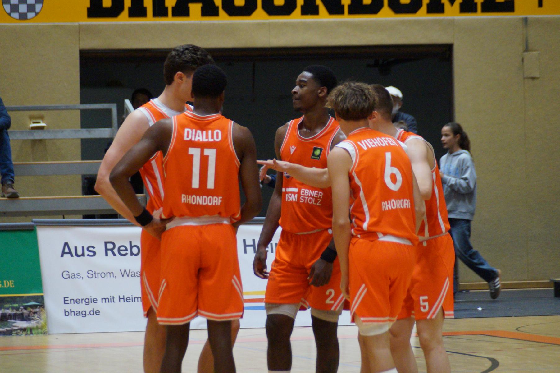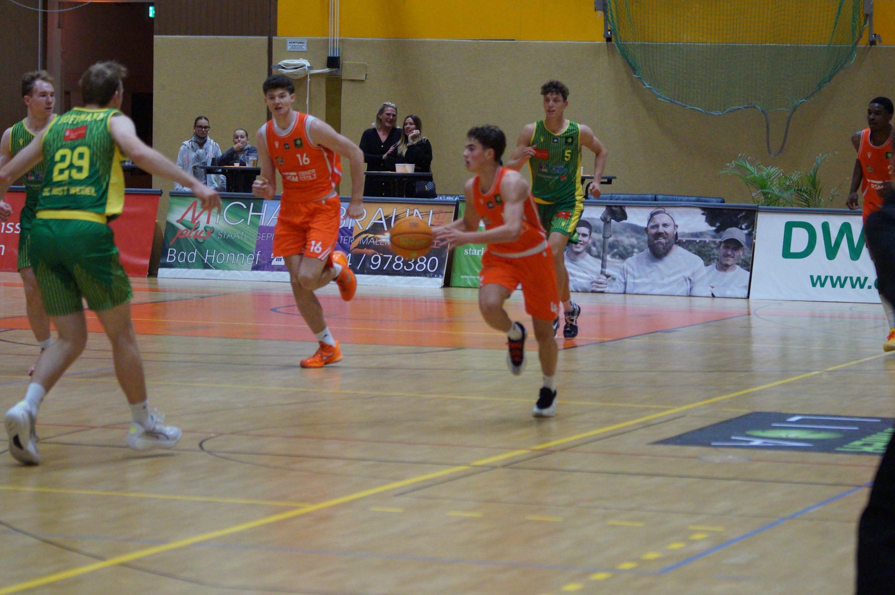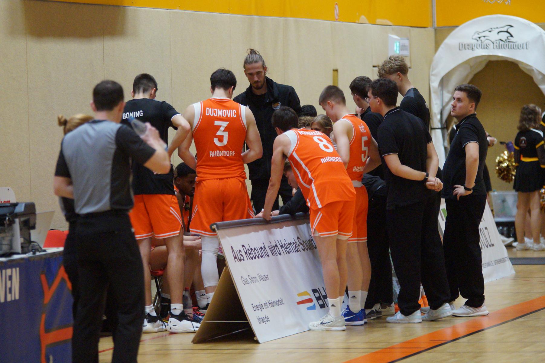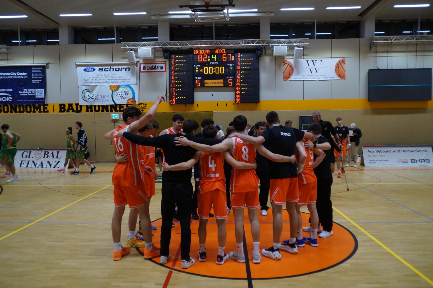 Entsprechend engagiert gingen die Dragons von Beginn an zur Sache. Die Mannschaft wirkte kein Stück verunsichert, sondern legte offensiv selbstbewusst los und ein 11:8 (5“) vor. Lediglich in der Verteidigung erlaubte sich Rhöndorf den ein oder anderen vermeidbaren Fehler, den man jugendlichen Leichtsinn zuordnen konnte. Rist Wedel nutzte die Ballverluste zum 13:13 (8“), es sollte aber der einzige Ausgleich für die Gäste in der gesamten Begegnung bleiben. Nicht zuletzt, weil Rist Wedel einen rabenschwarzen Tag aus der Distanz erwischte und nur zwei von 22 Dreierversuchen verwandelte. In den ersten 20 Minuten hatte die Mannschaft um Max Becker das Geschehen fest im Griff und ging mit einer 38:31-Führung in die Pause.