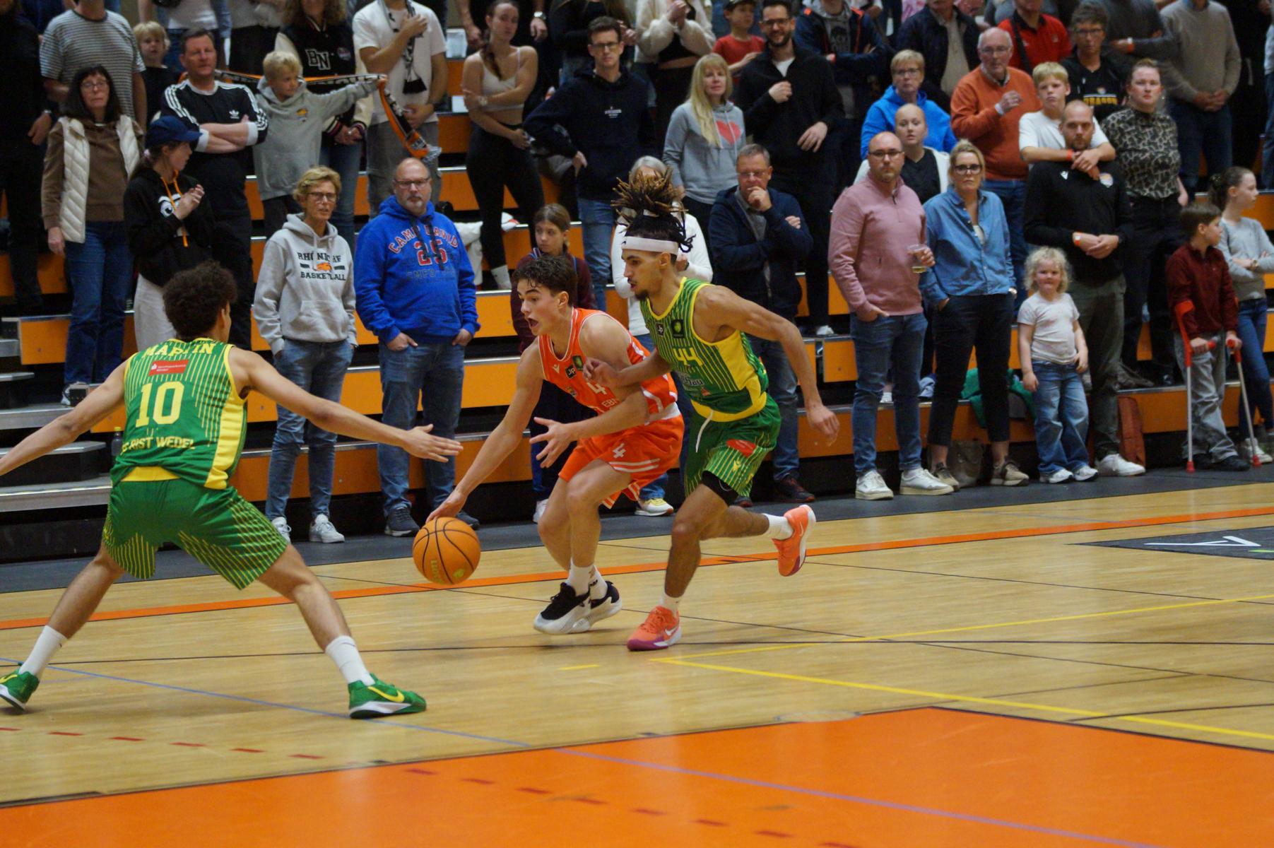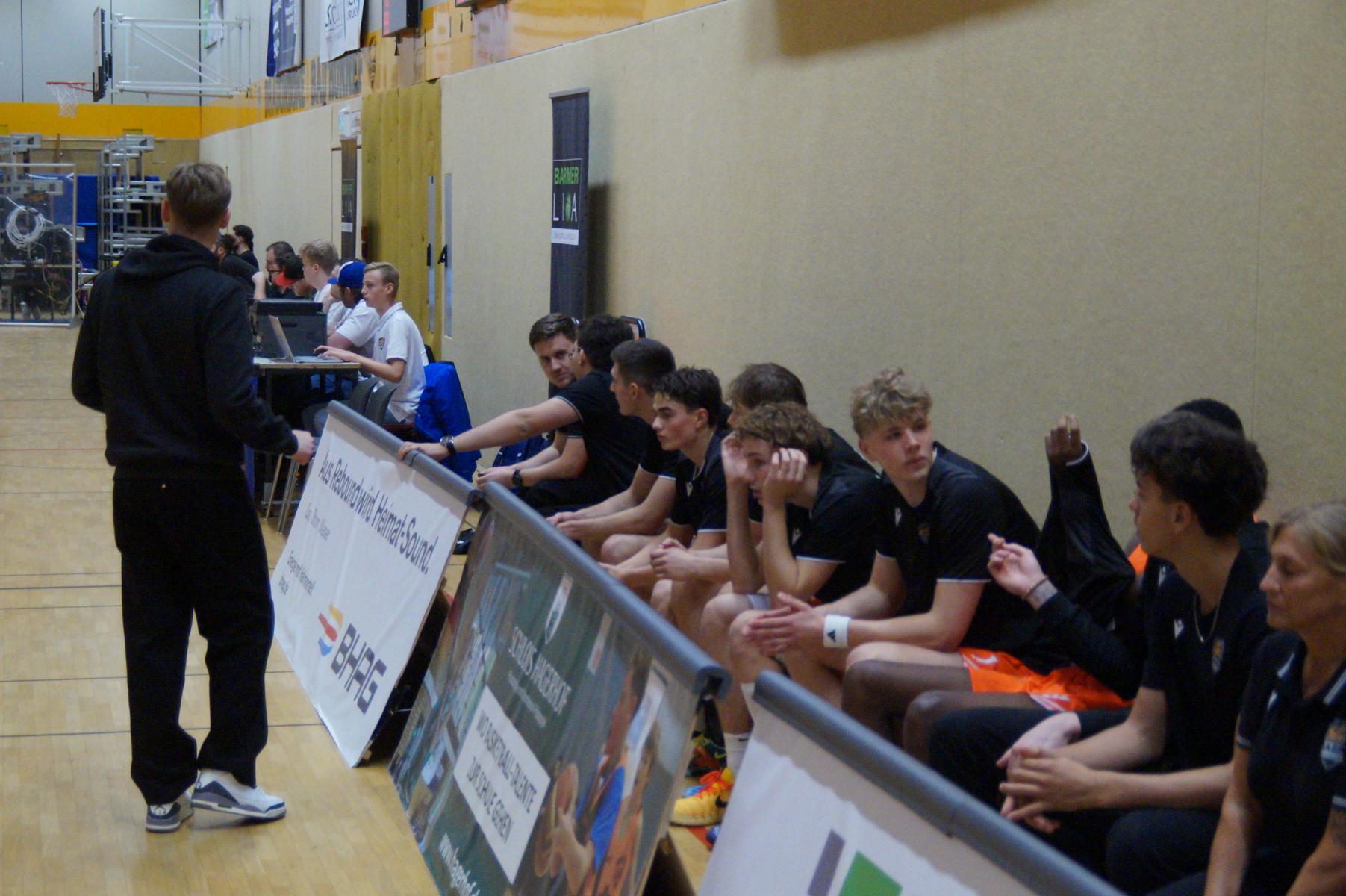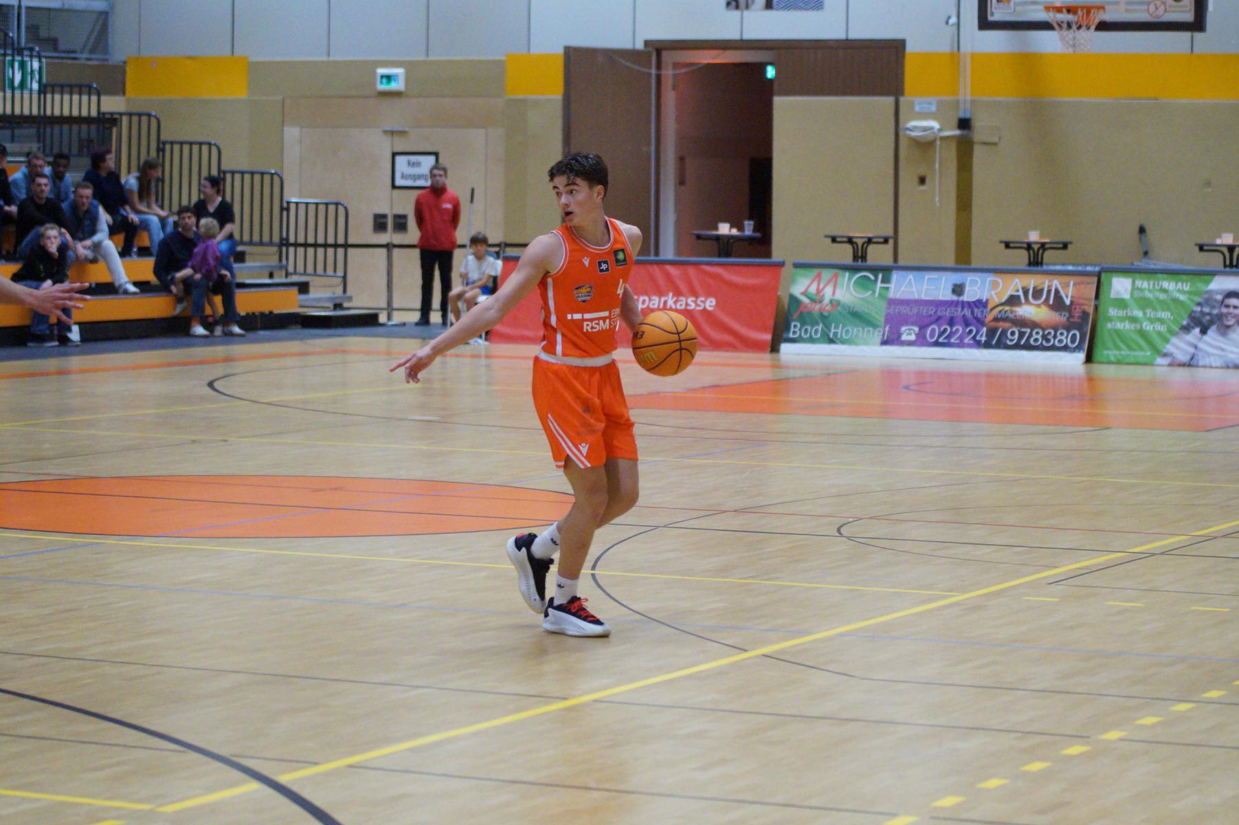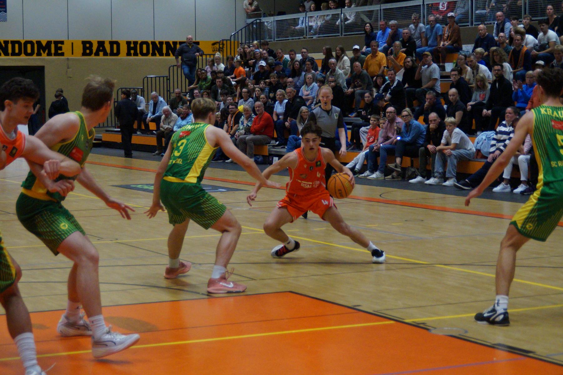 Entsprechend engagiert gingen die Dragons von Beginn an zur Sache. Die Mannschaft wirkte kein Stück verunsichert, sondern legte offensiv selbstbewusst los und ein 11:8 (5“) vor. Lediglich in der Verteidigung erlaubte sich Rhöndorf den ein oder anderen vermeidbaren Fehler, den man jugendlichen Leichtsinn zuordnen konnte. Rist Wedel nutzte die Ballverluste zum 13:13 (8“), es sollte aber der einzige Ausgleich für die Gäste in der gesamten Begegnung bleiben. Nicht zuletzt, weil Rist Wedel einen rabenschwarzen Tag aus der Distanz erwischte und nur zwei von 22 Dreierversuchen verwandelte. In den ersten 20 Minuten hatte die Mannschaft um Max Becker das Geschehen fest im Griff und ging mit einer 38:31-Führung in die Pause.