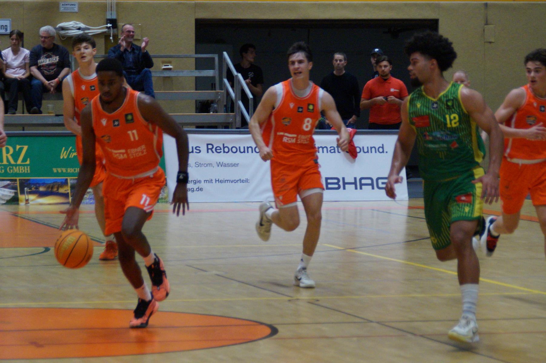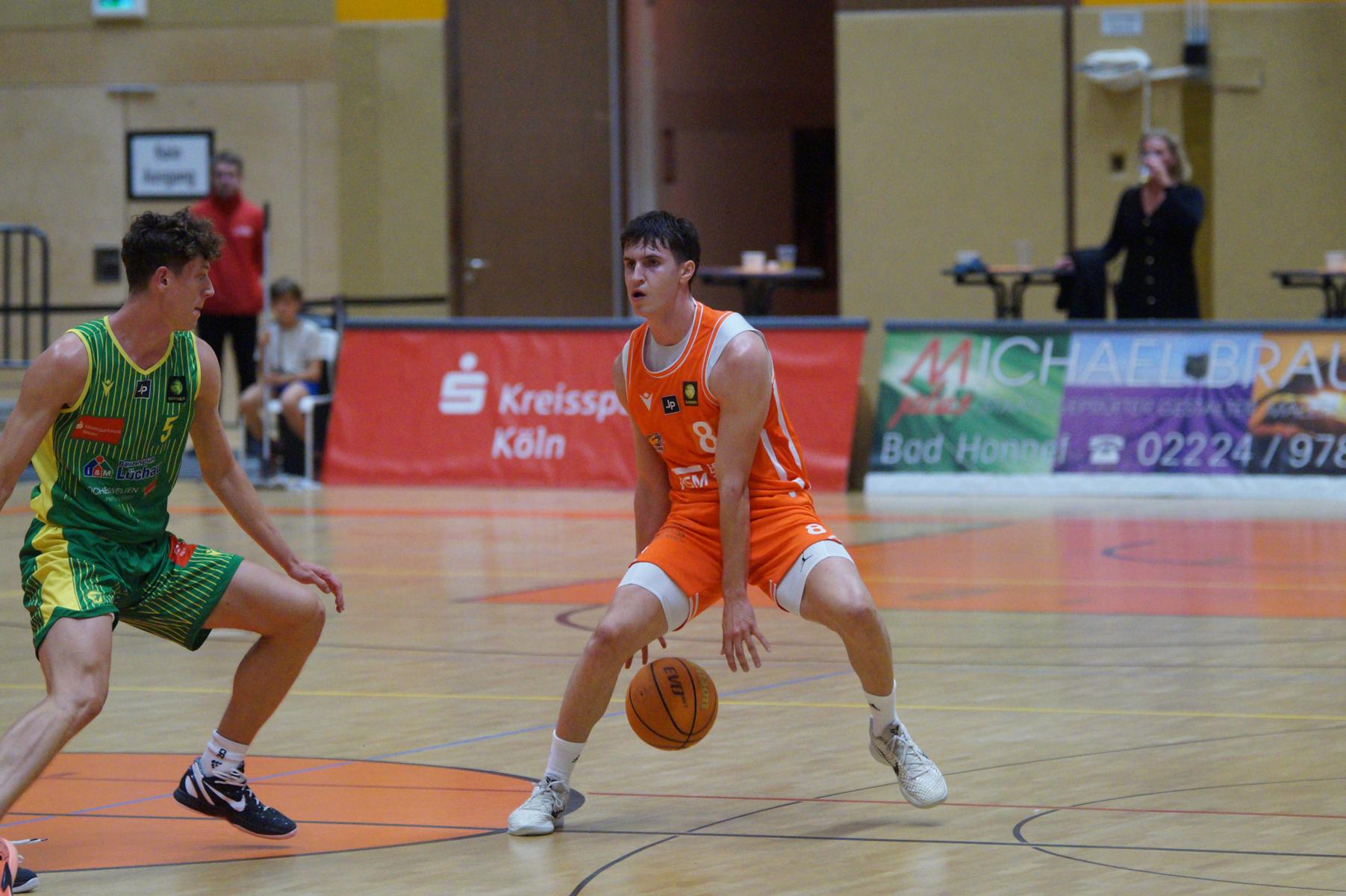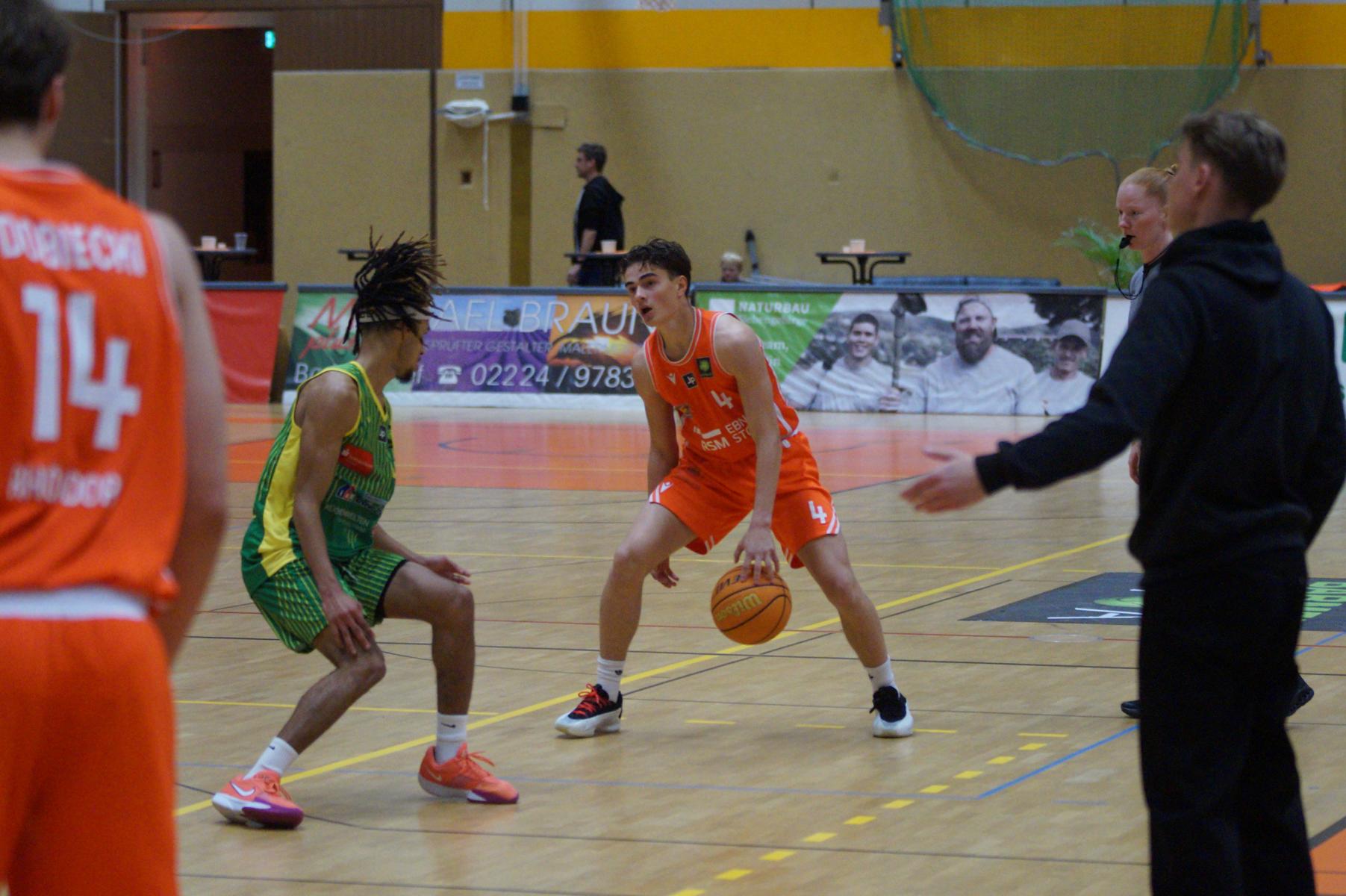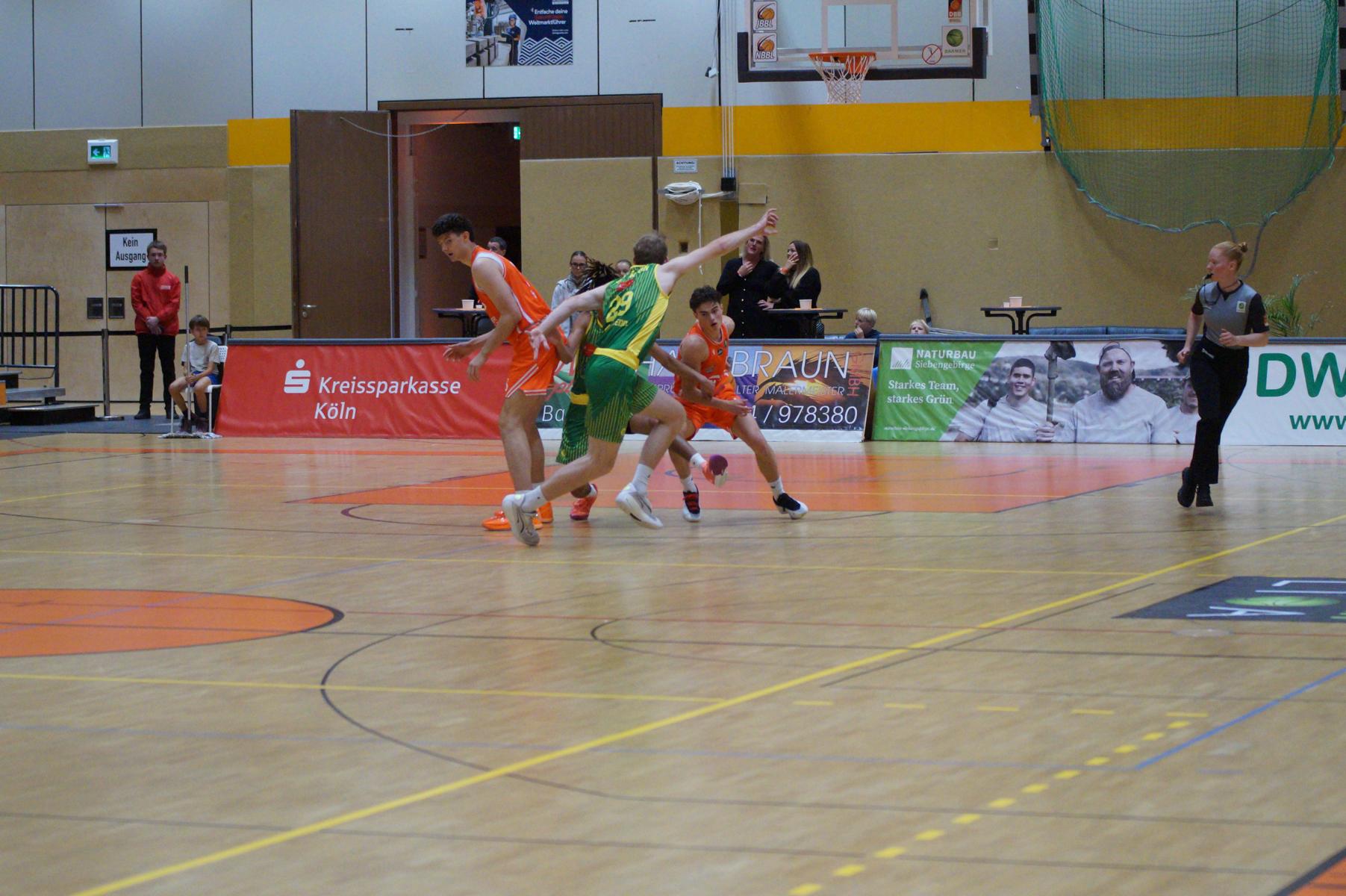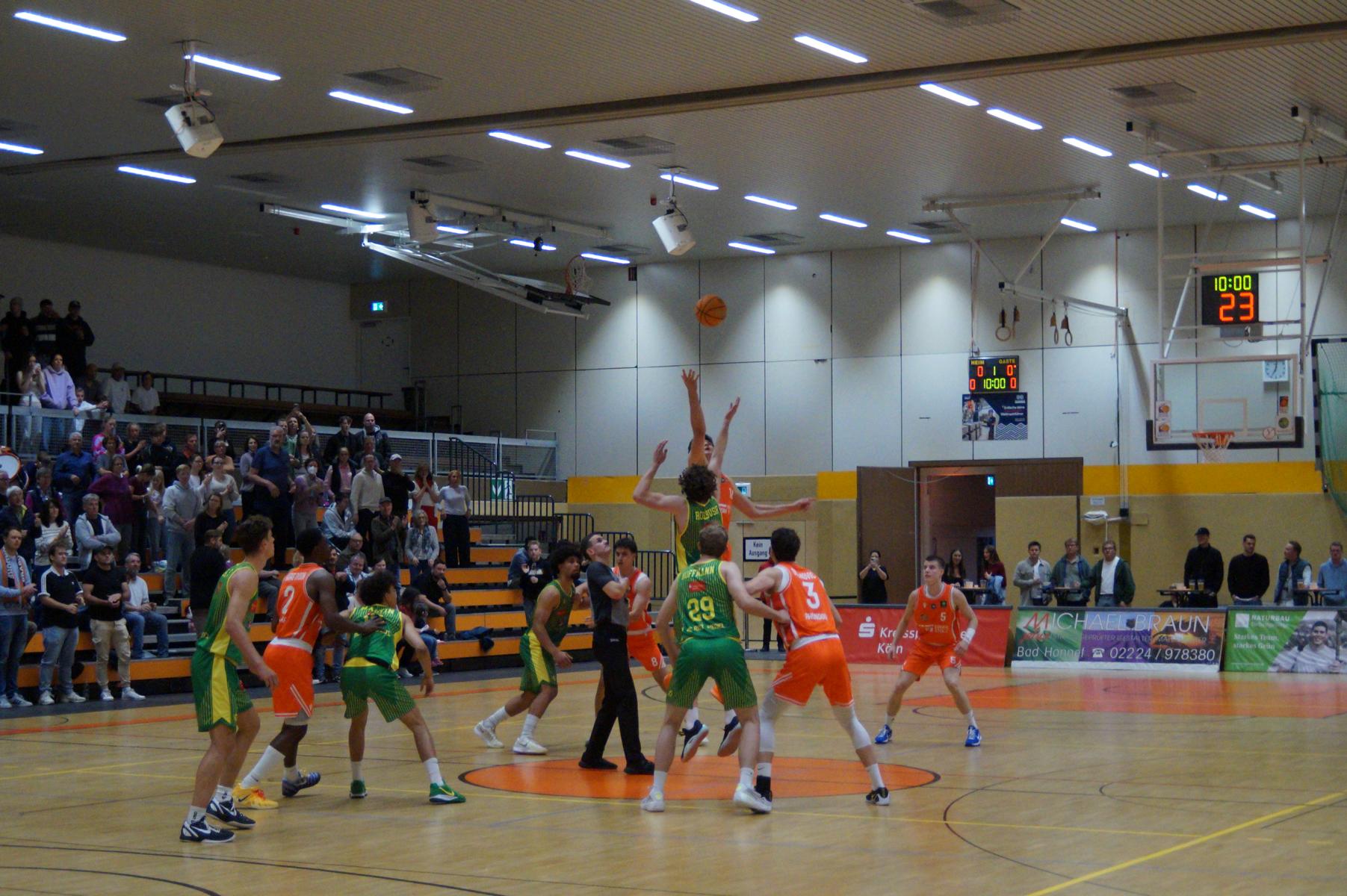 Entsprechend engagiert gingen die Dragons von Beginn an zur Sache. Die Mannschaft wirkte kein Stück verunsichert, sondern legte offensiv selbstbewusst los und ein 11:8 (5“) vor. Lediglich in der Verteidigung erlaubte sich Rhöndorf den ein oder anderen vermeidbaren Fehler, den man jugendlichen Leichtsinn zuordnen konnte. Rist Wedel nutzte die Ballverluste zum 13:13 (8“), es sollte aber der einzige Ausgleich für die Gäste in der gesamten Begegnung bleiben. Nicht zuletzt, weil Rist Wedel einen rabenschwarzen Tag aus der Distanz erwischte und nur zwei von 22 Dreierversuchen verwandelte. In den ersten 20 Minuten hatte die Mannschaft um Max Becker das Geschehen fest im Griff und ging mit einer 38:31-Führung in die Pause.