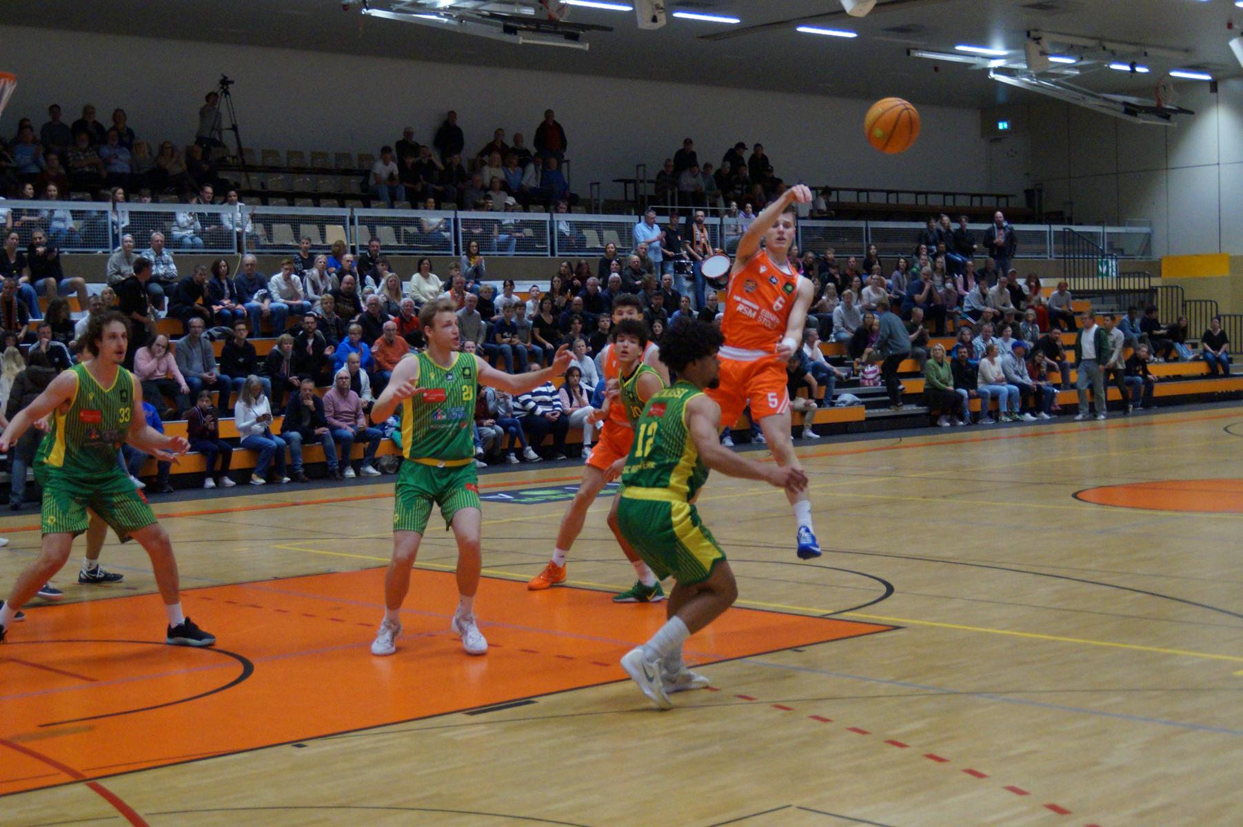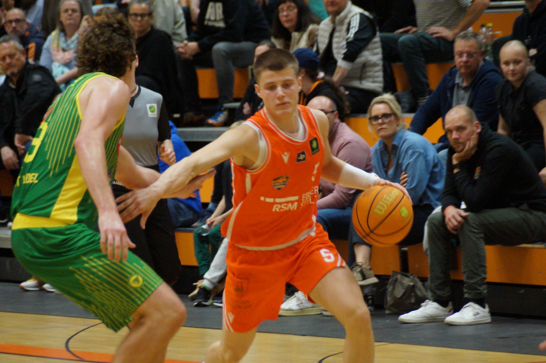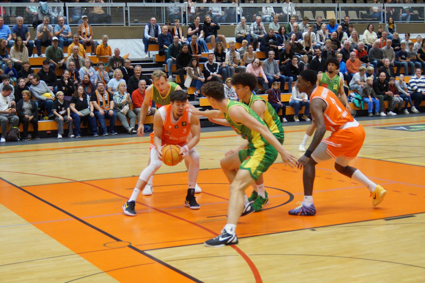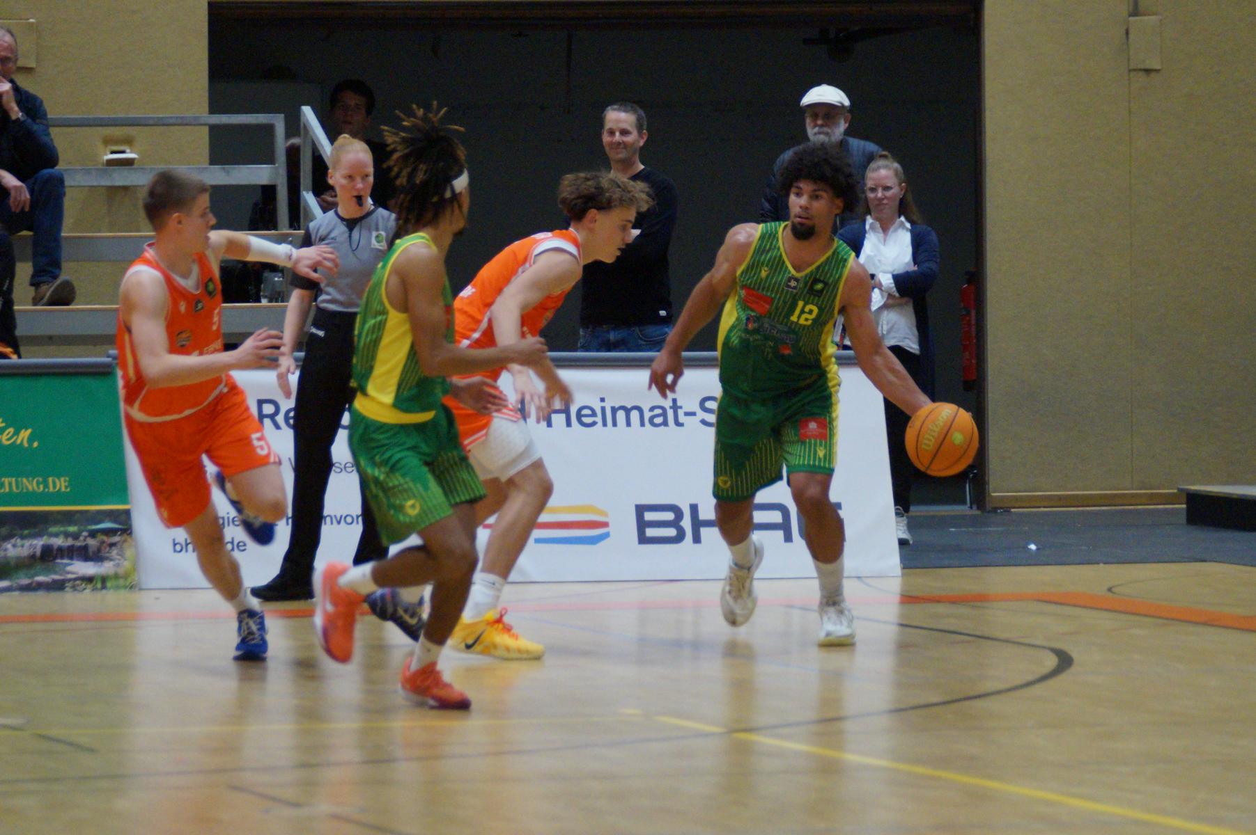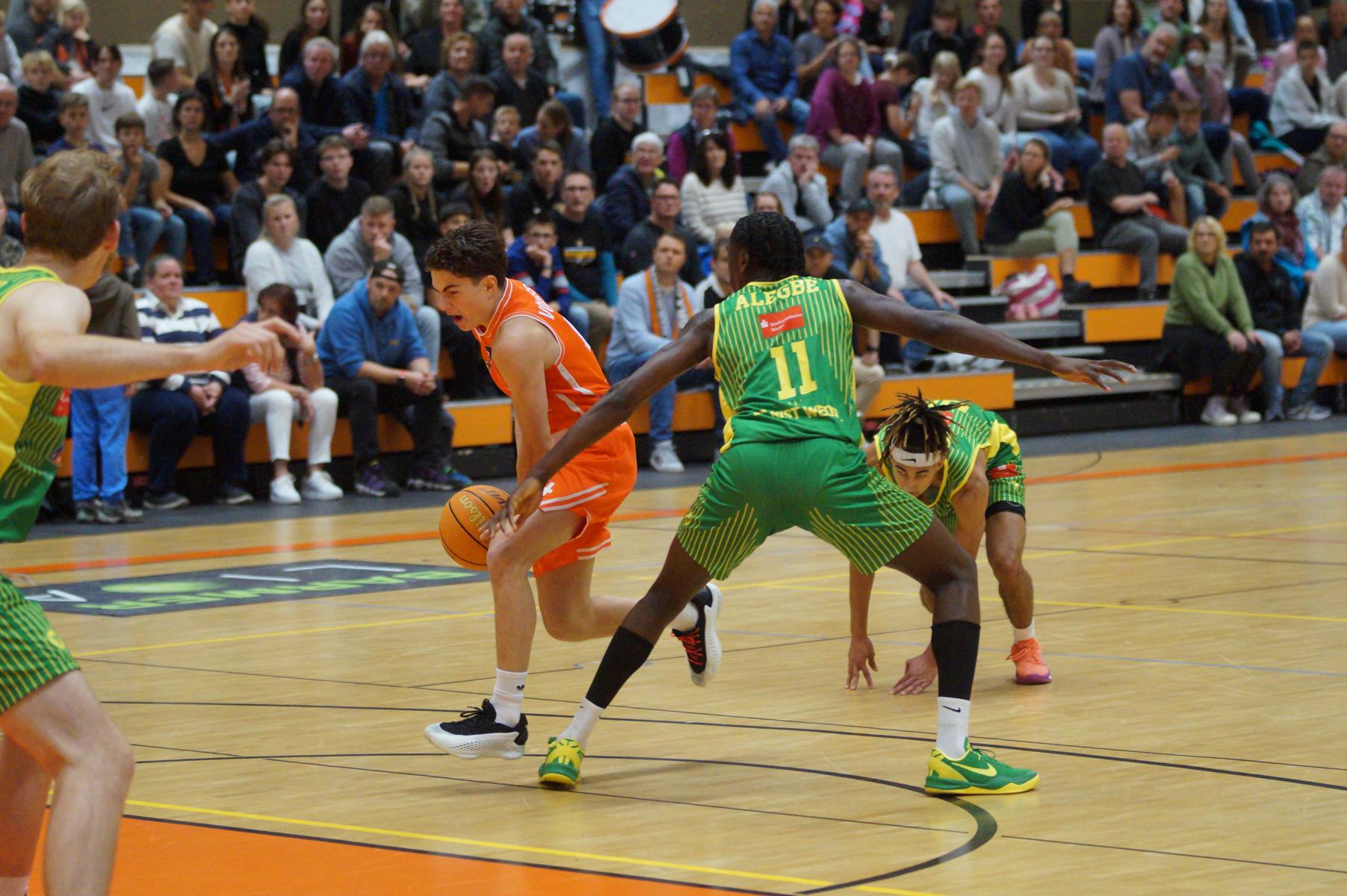 Entsprechend engagiert gingen die Dragons von Beginn an zur Sache. Die Mannschaft wirkte kein Stück verunsichert, sondern legte offensiv selbstbewusst los und ein 11:8 (5“) vor. Lediglich in der Verteidigung erlaubte sich Rhöndorf den ein oder anderen vermeidbaren Fehler, den man jugendlichen Leichtsinn zuordnen konnte. Rist Wedel nutzte die Ballverluste zum 13:13 (8“), es sollte aber der einzige Ausgleich für die Gäste in der gesamten Begegnung bleiben. Nicht zuletzt, weil Rist Wedel einen rabenschwarzen Tag aus der Distanz erwischte und nur zwei von 22 Dreierversuchen verwandelte. In den ersten 20 Minuten hatte die Mannschaft um Max Becker das Geschehen fest im Griff und ging mit einer 38:31-Führung in die Pause.