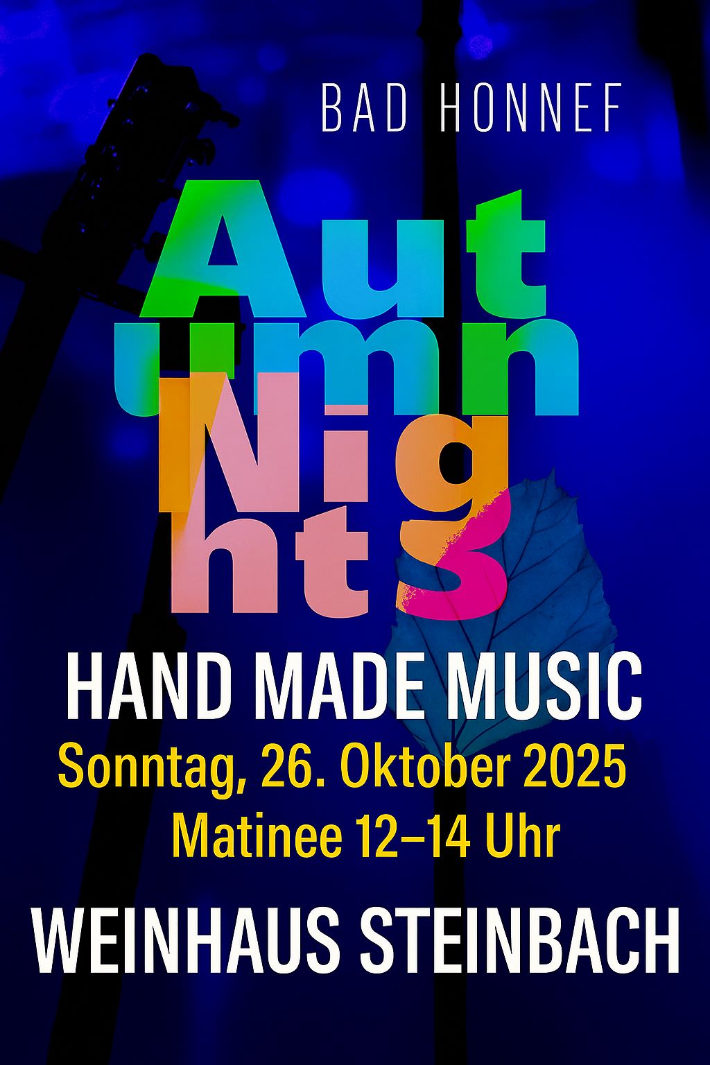 Am Sonntag, den 26. Oktober 2025, lädt das Weinhaus Steinbach (Spiessgasse 2) von 12:00 bis 14:00 Uhr zur musikalischen Matinee mit der Bad Honnefer Band „Autumn Nights“ ein. Unter dem Motto „Hand Made Music“ erwartet die Gäste ein abwechslungsreiches Programm aus Rock- und Popklassikern bis hin zu modernen Titeln.