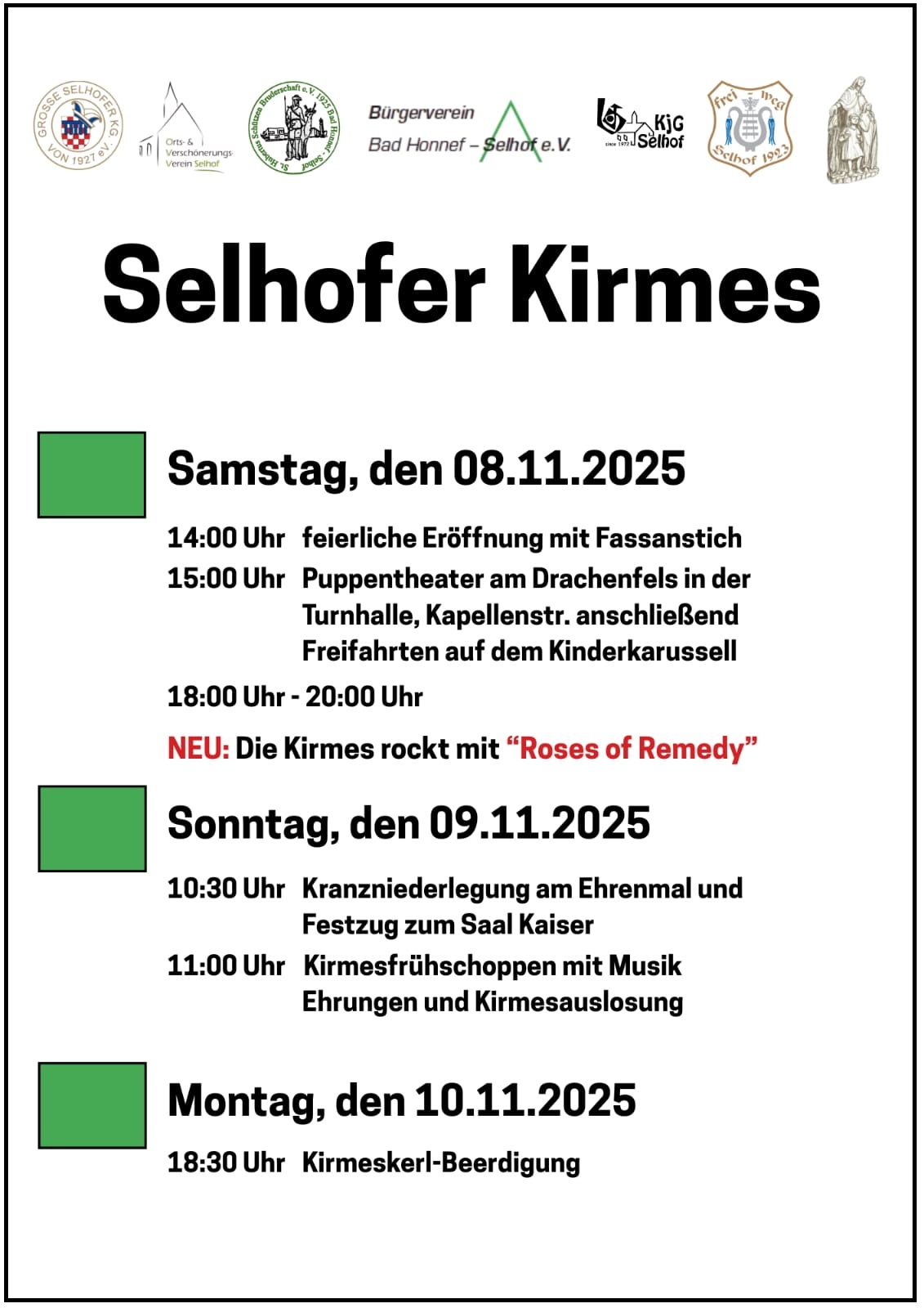 Vom 8. bis 10. November 2025 laden die Selhofer Vereine zur traditionellen Selhofer Kirmes ein. Das Festwochenende bietet ein abwechslungsreiches Programm für Jung und Alt – von feierlicher Eröffnung über Puppentheater, Rööpekuchen (Reibekuchen) bis zur musikalischen Abendveranstaltung. Unsere Martinslose werden bei der Mia und am Kirmesplatz angeboten. Die Ziehung am Sonntag im Saal Kaiser nach dem Frühschoppen.