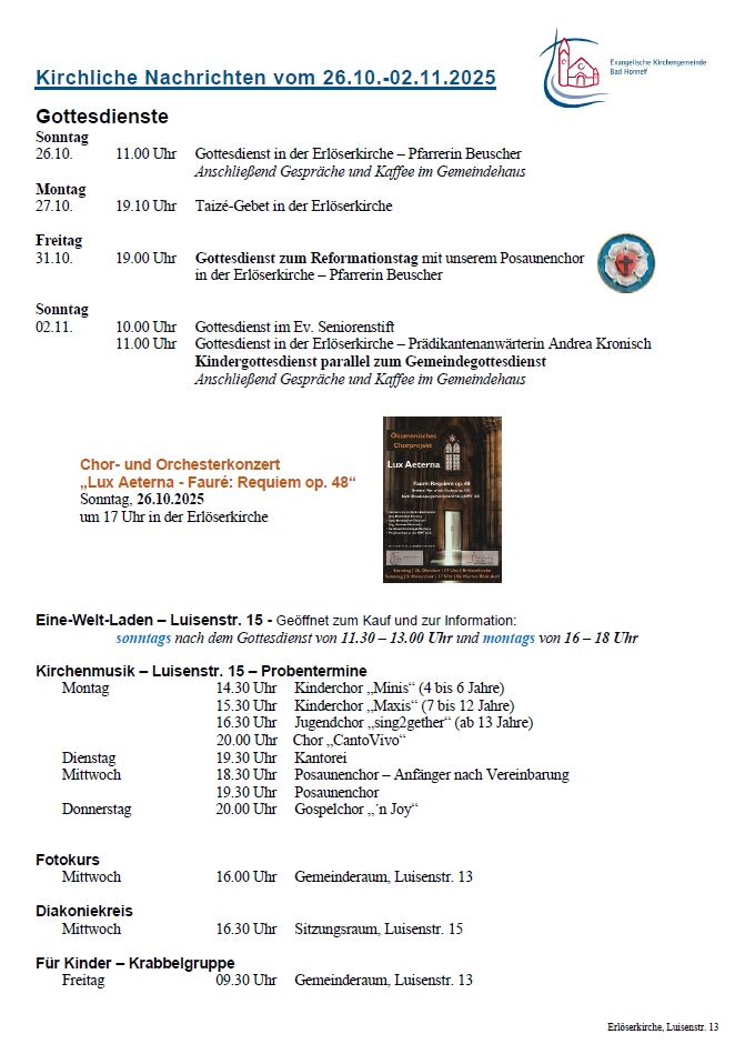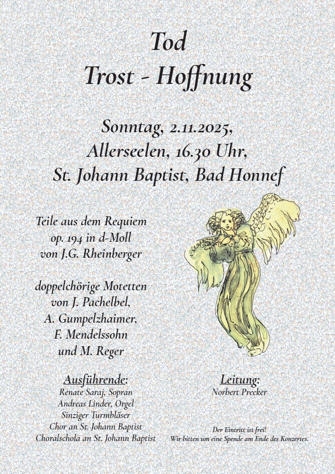 Am Sonntag, den 2. November 2025, lädt der Kirchenchor an St. Johann Baptist um 16.30 Uhr zu einem besonderen Konzert am Allerseelentag ein. Unter dem Titel „Tod – Trost – Hoffnung“ vereinen sich Chor-, Orgel- und Bläserklänge zu einem eindrucksvollen musikalischen Programm, das den Spannungsbogen von Trauer und Vergänglichkeit hin zu Trost und Zuversicht entfaltet.