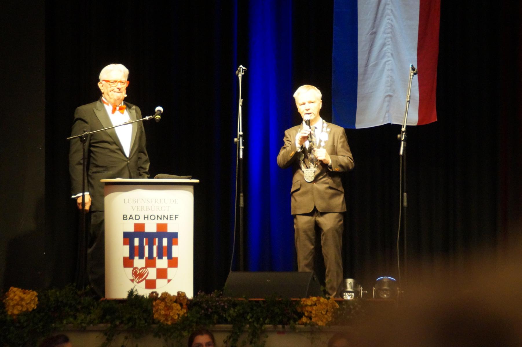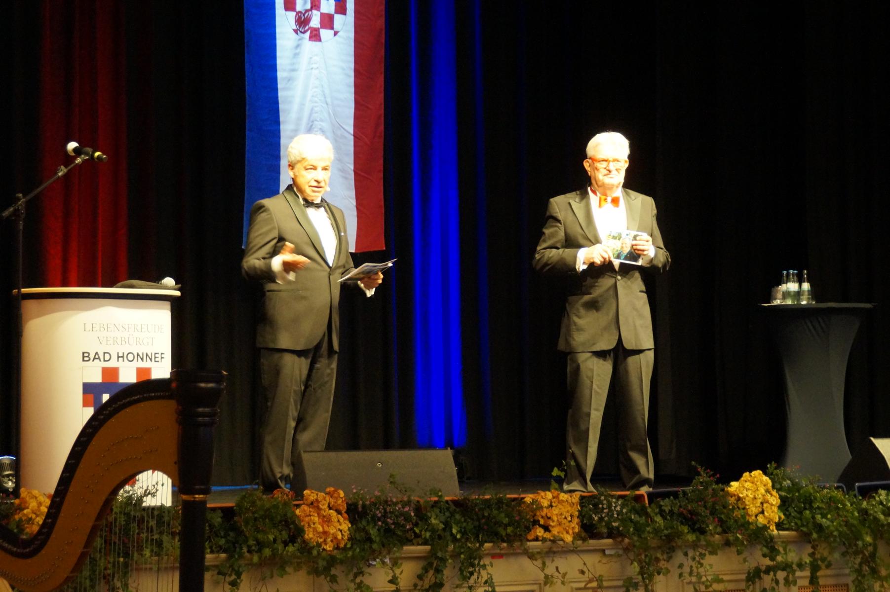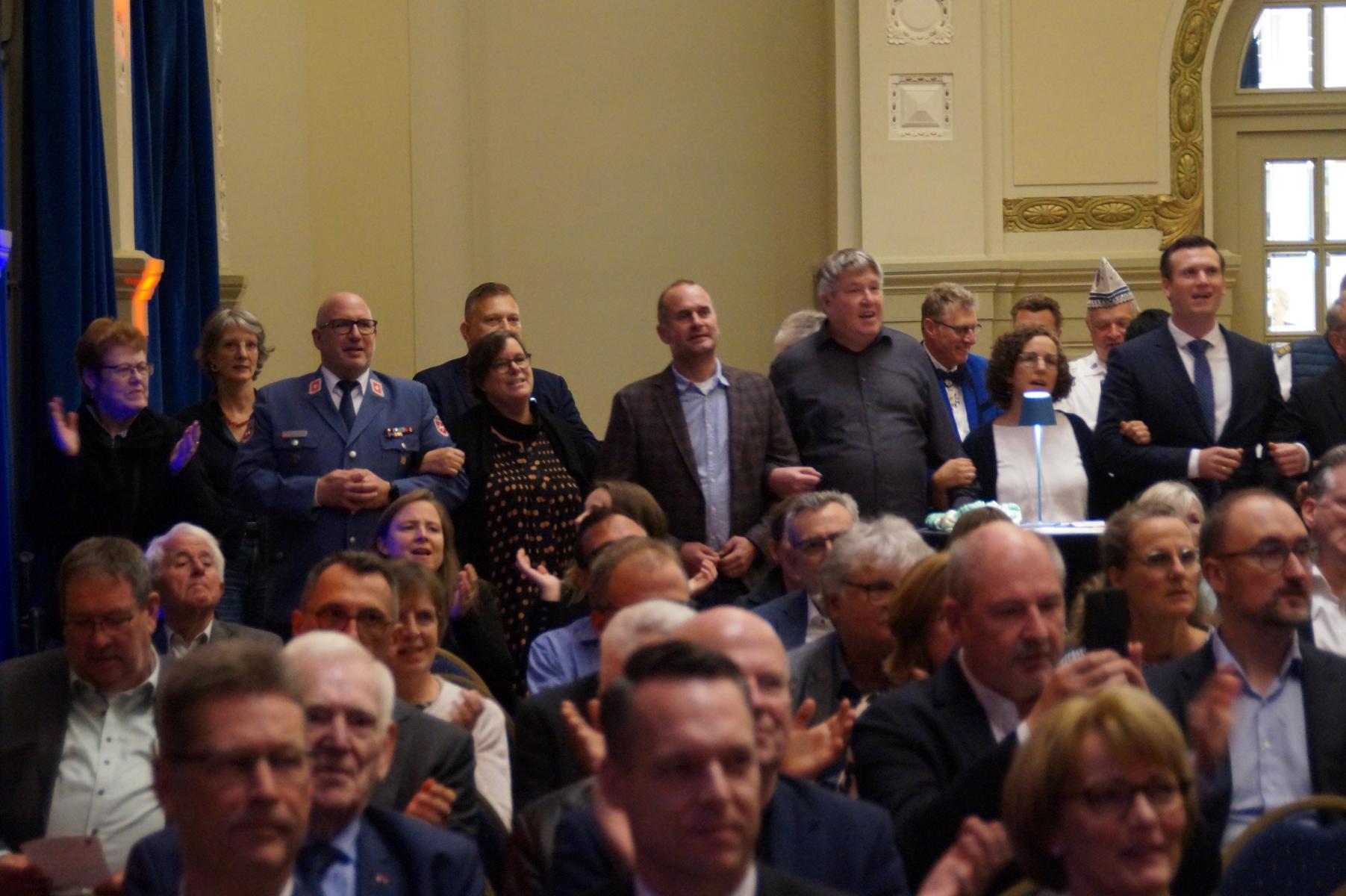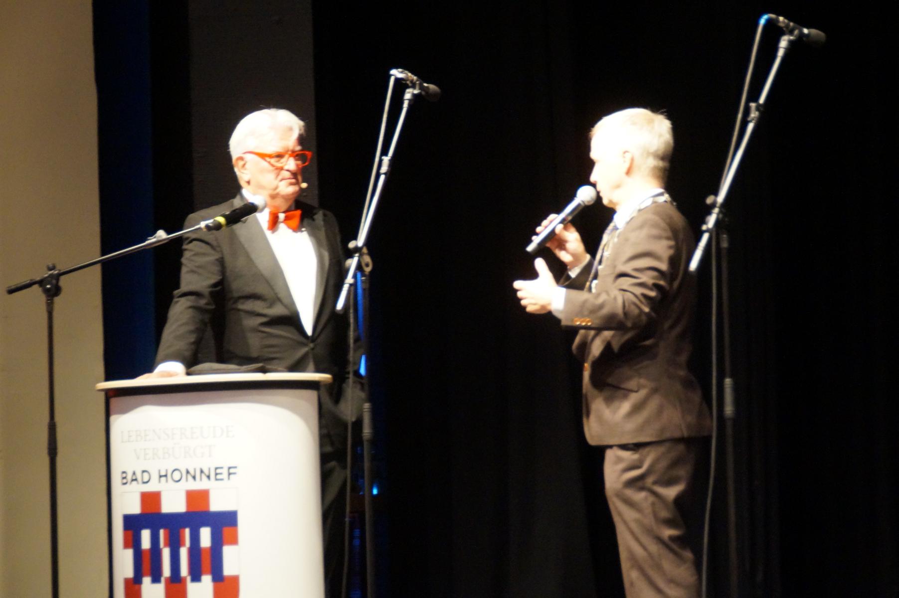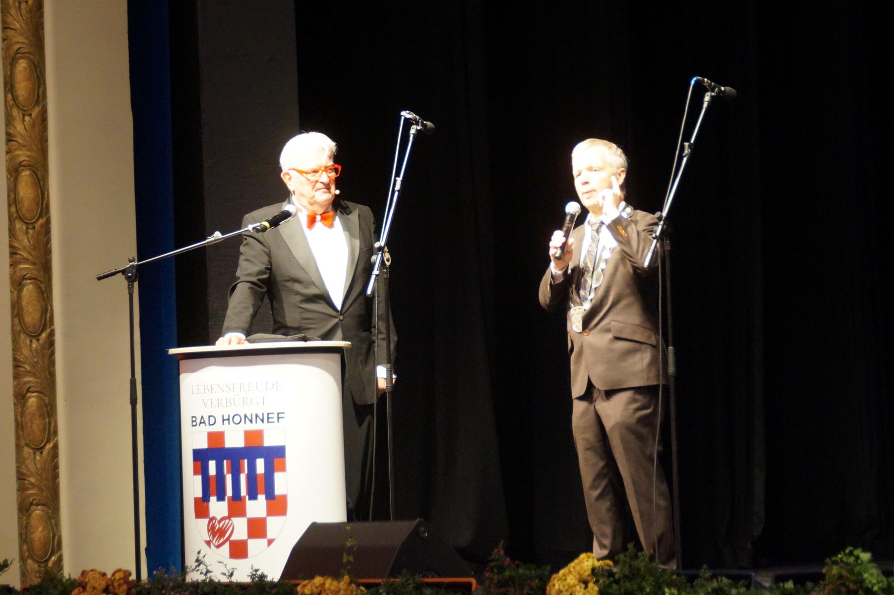 Der festlich geschmückte Kursaal bot den würdigen Rahmen für die Veranstaltung. Vertreter aus Politik, Verwaltung, Vereinen und Bürgerschaft waren gekommen, um Otto Neuhoff zu ehren. Die Moderation übernahmen Thomas Heyer und Peter Hurrelmann, die mit Charme und Witz durch den Abend führten. Sie erinnerten augenzwinkernd daran, dass Neuhoff „elf Jahre und 111 Tage“ im Amt war – eine Zahl, die im Rheinland nicht zufällig gewählt schien.