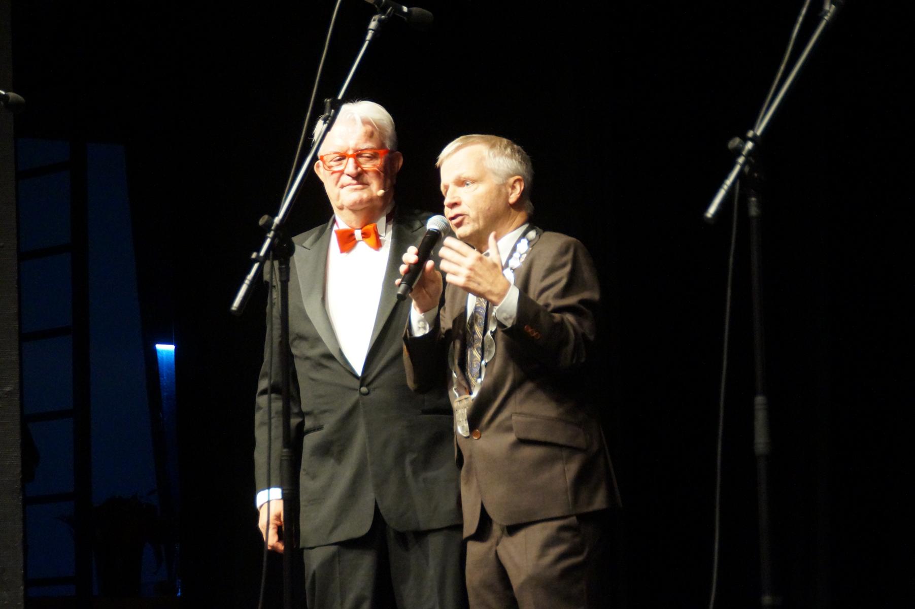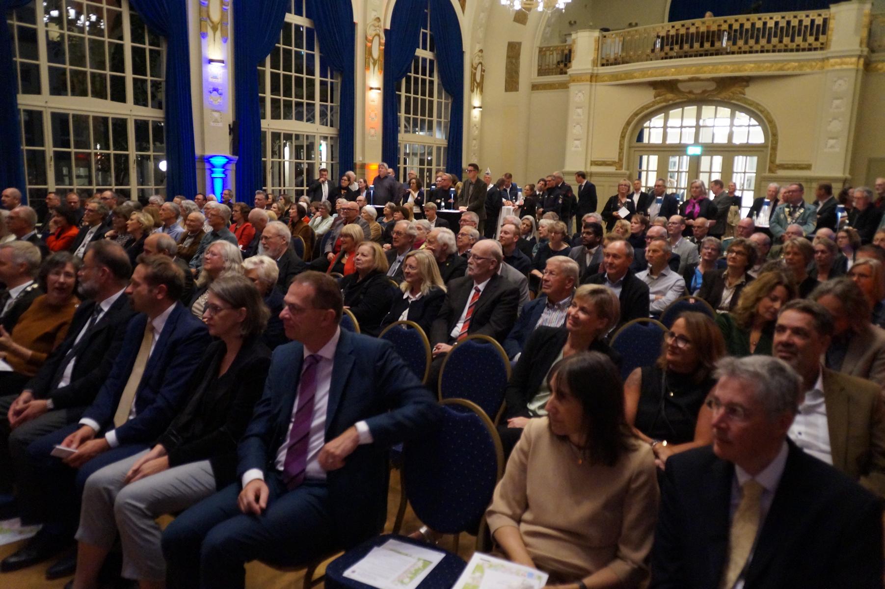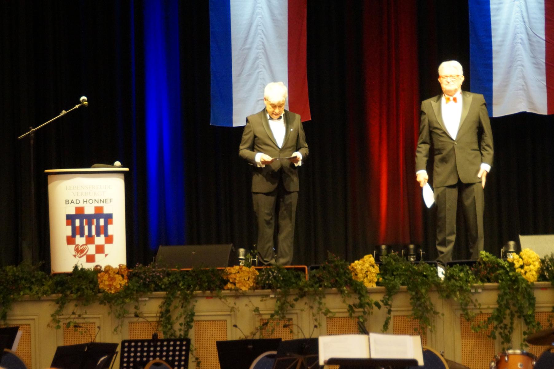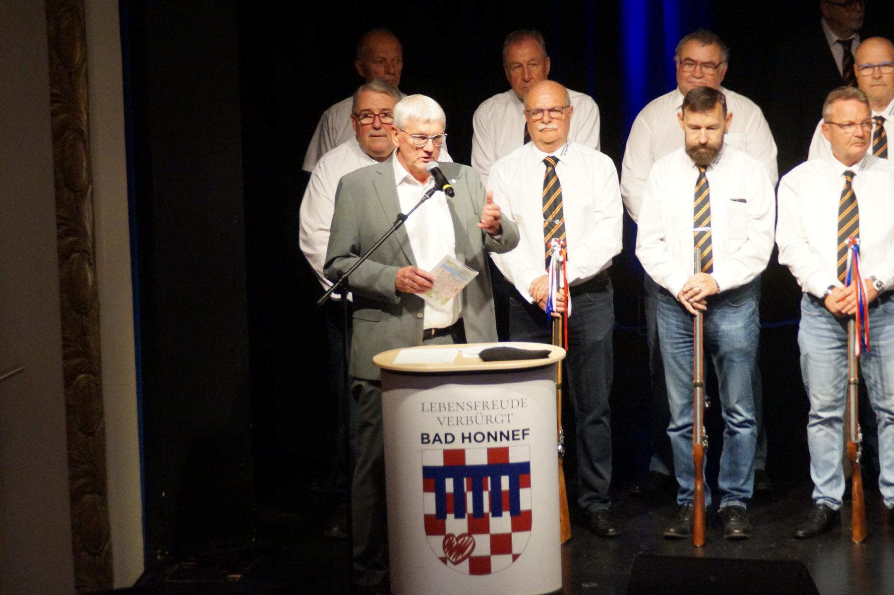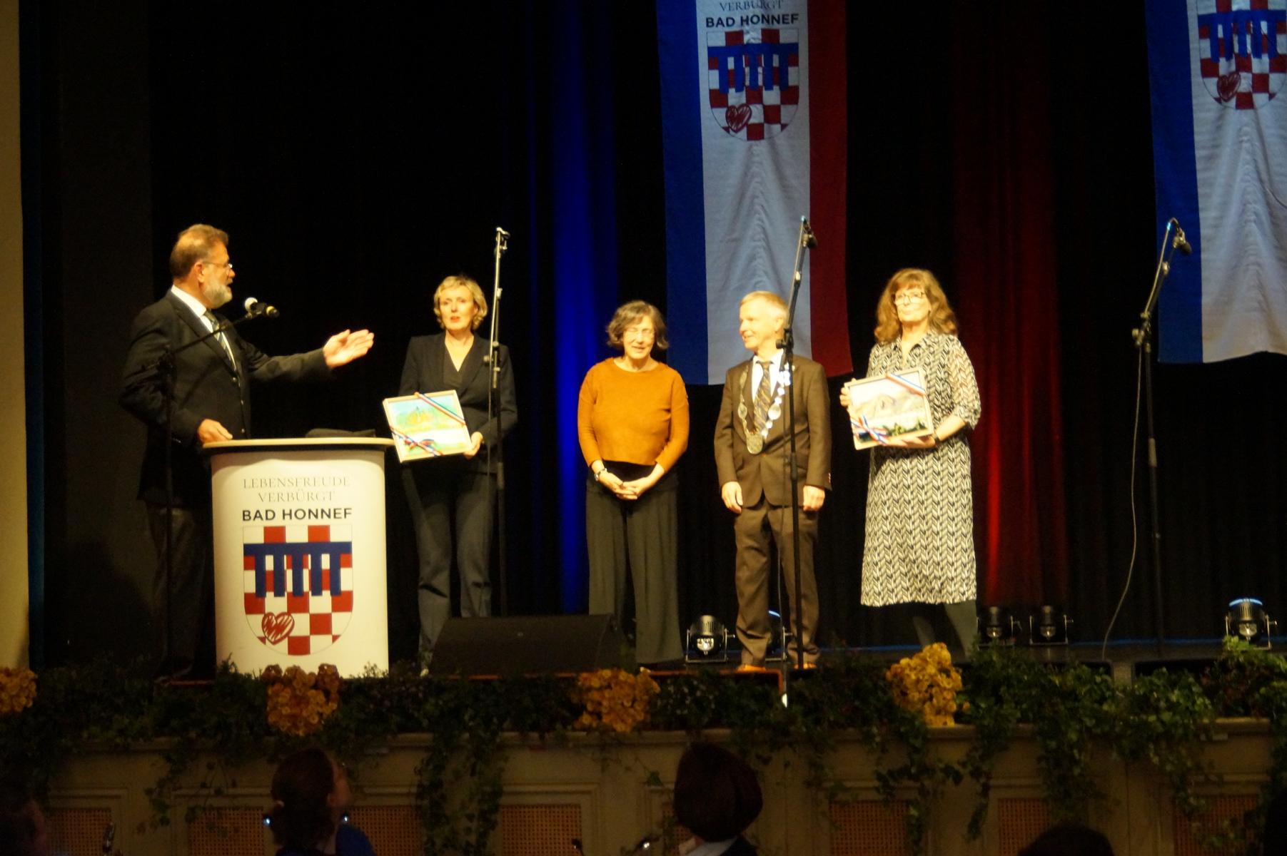 Der festlich geschmückte Kursaal bot den würdigen Rahmen für die Veranstaltung. Vertreter aus Politik, Verwaltung, Vereinen und Bürgerschaft waren gekommen, um Otto Neuhoff zu ehren. Die Moderation übernahmen Thomas Heyer und Peter Hurrelmann, die mit Charme und Witz durch den Abend führten. Sie erinnerten augenzwinkernd daran, dass Neuhoff „elf Jahre und 111 Tage“ im Amt war – eine Zahl, die im Rheinland nicht zufällig gewählt schien.