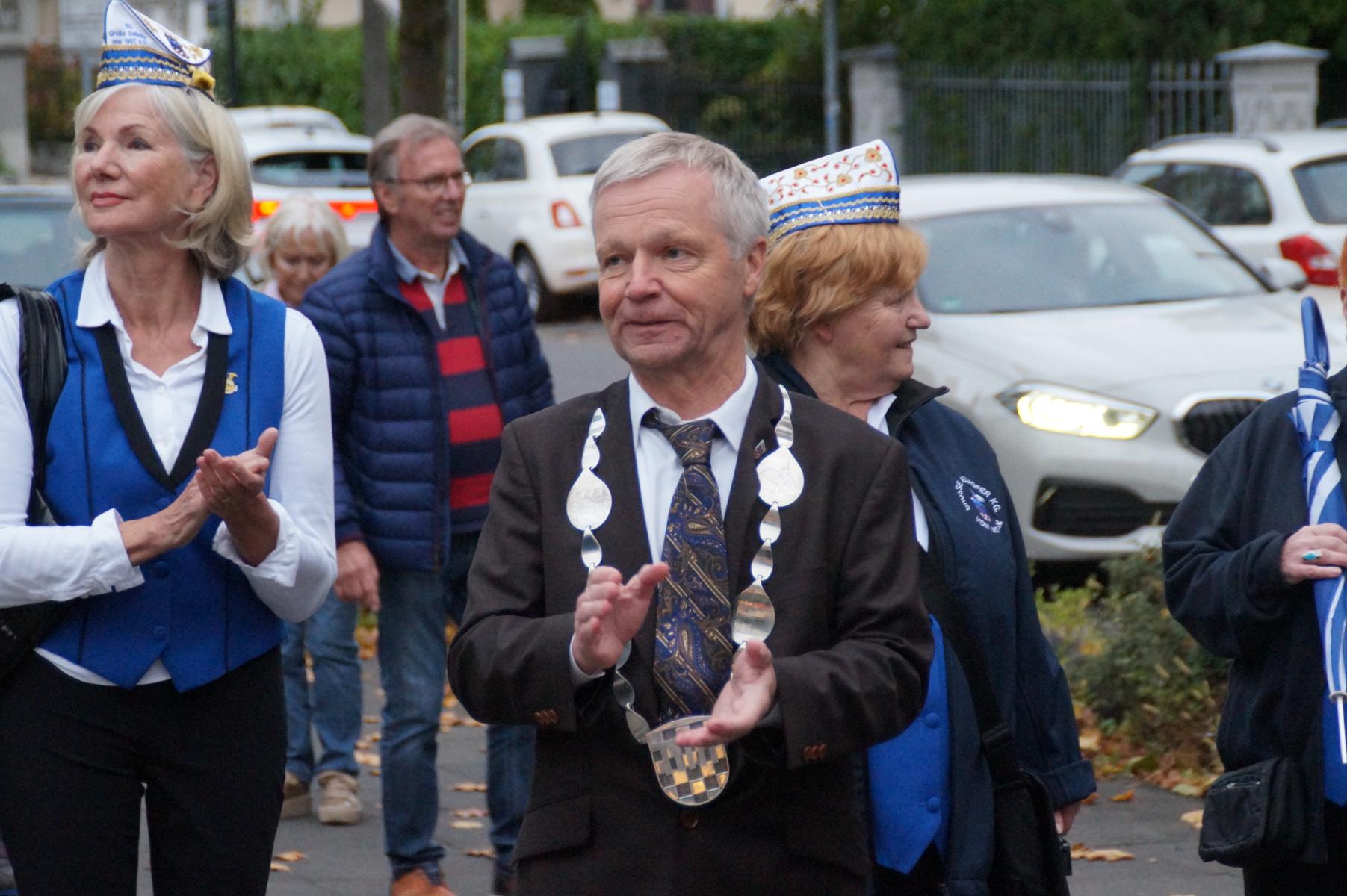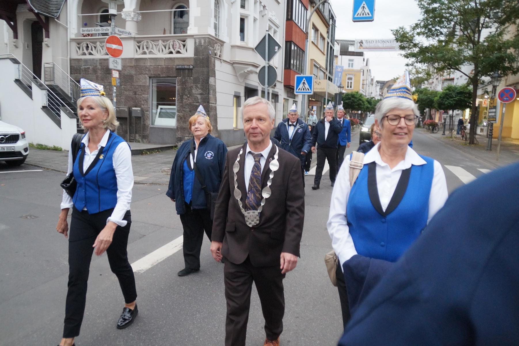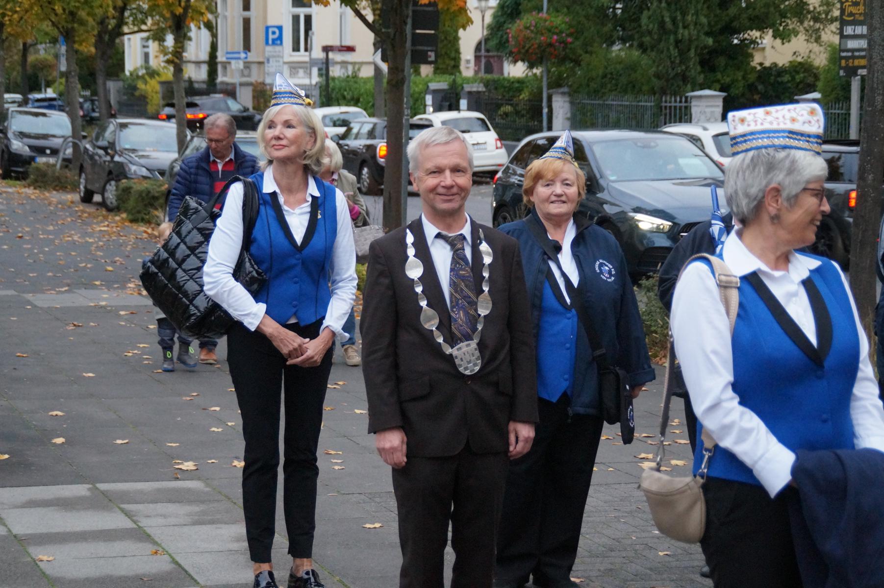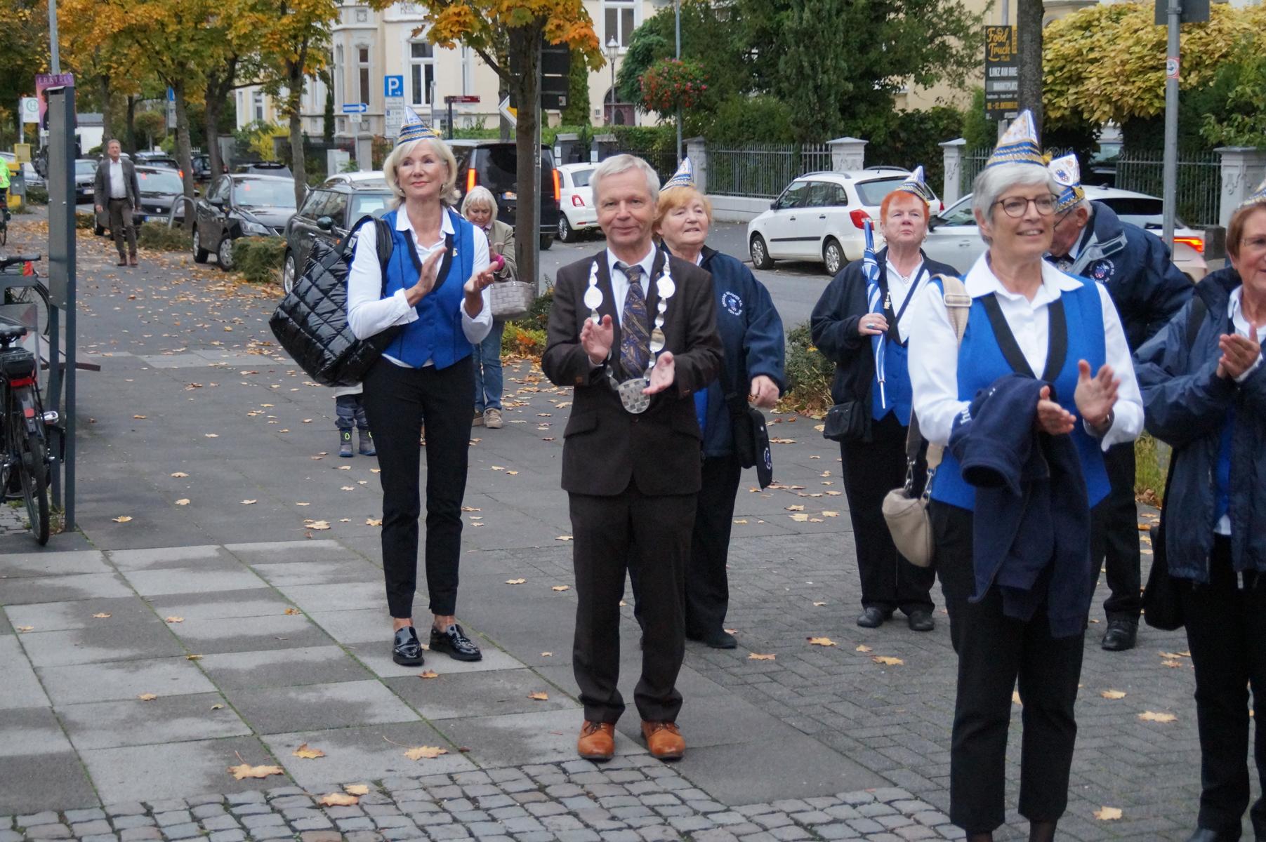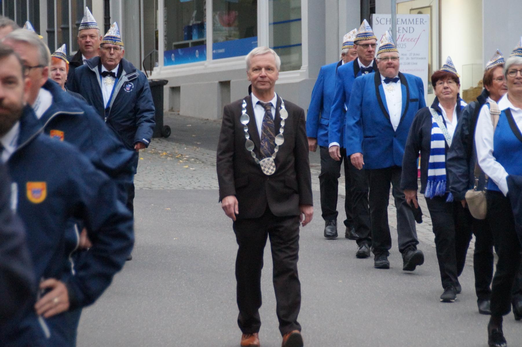 Der Abschied begann bereits am 9. Oktober 2025 am Rathaus: Otto Neuhoff wurde dort feierlich abgeholt, begleitet von den Bad Honnefer Stadtsoldaten und den Senatoren der KG Blau-Weiß Selhof, bei denen Otto Neuhoff selbst Senator ist. In einem festlichen Zug ging es gemeinsam durch die Fußgängerzone bis zum Kurhaus, wo die offizielle Verabschiedung stattfand.