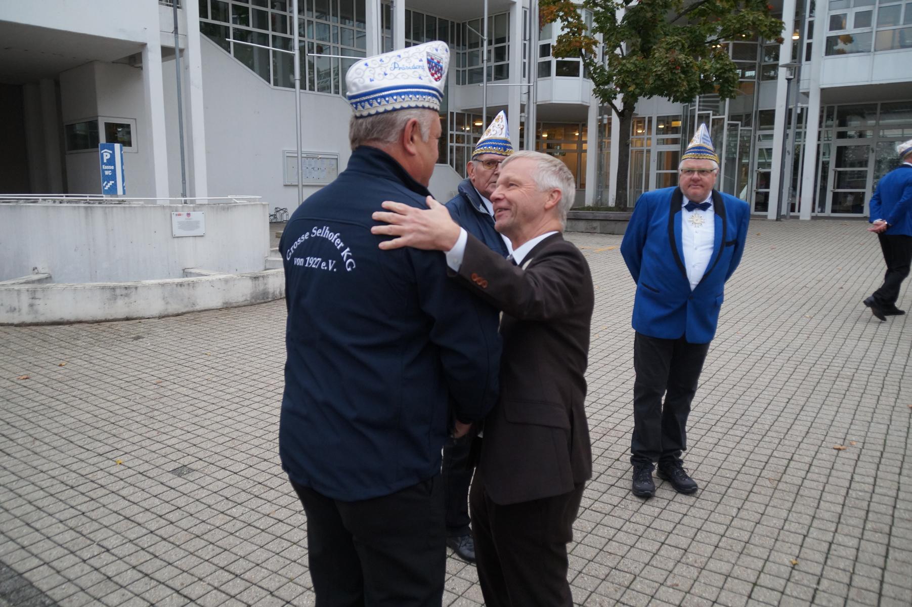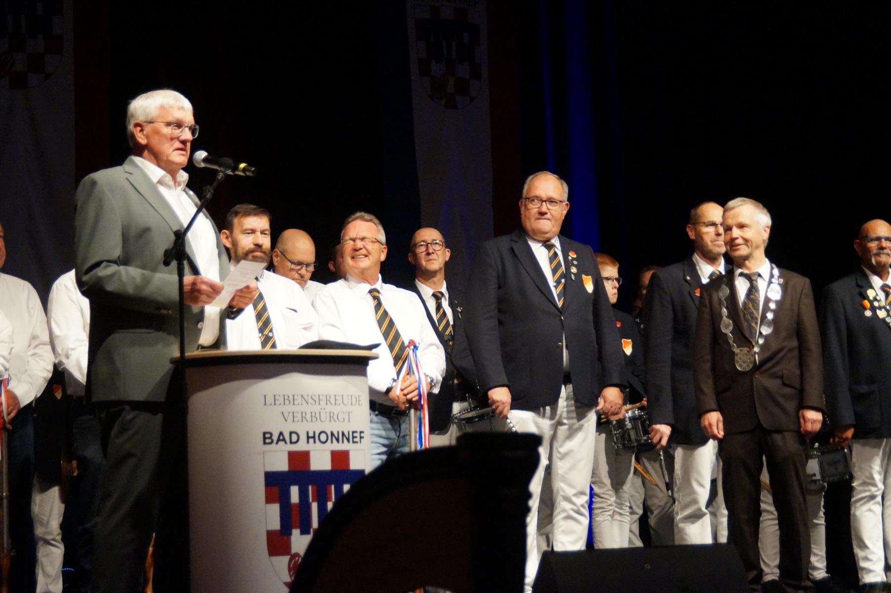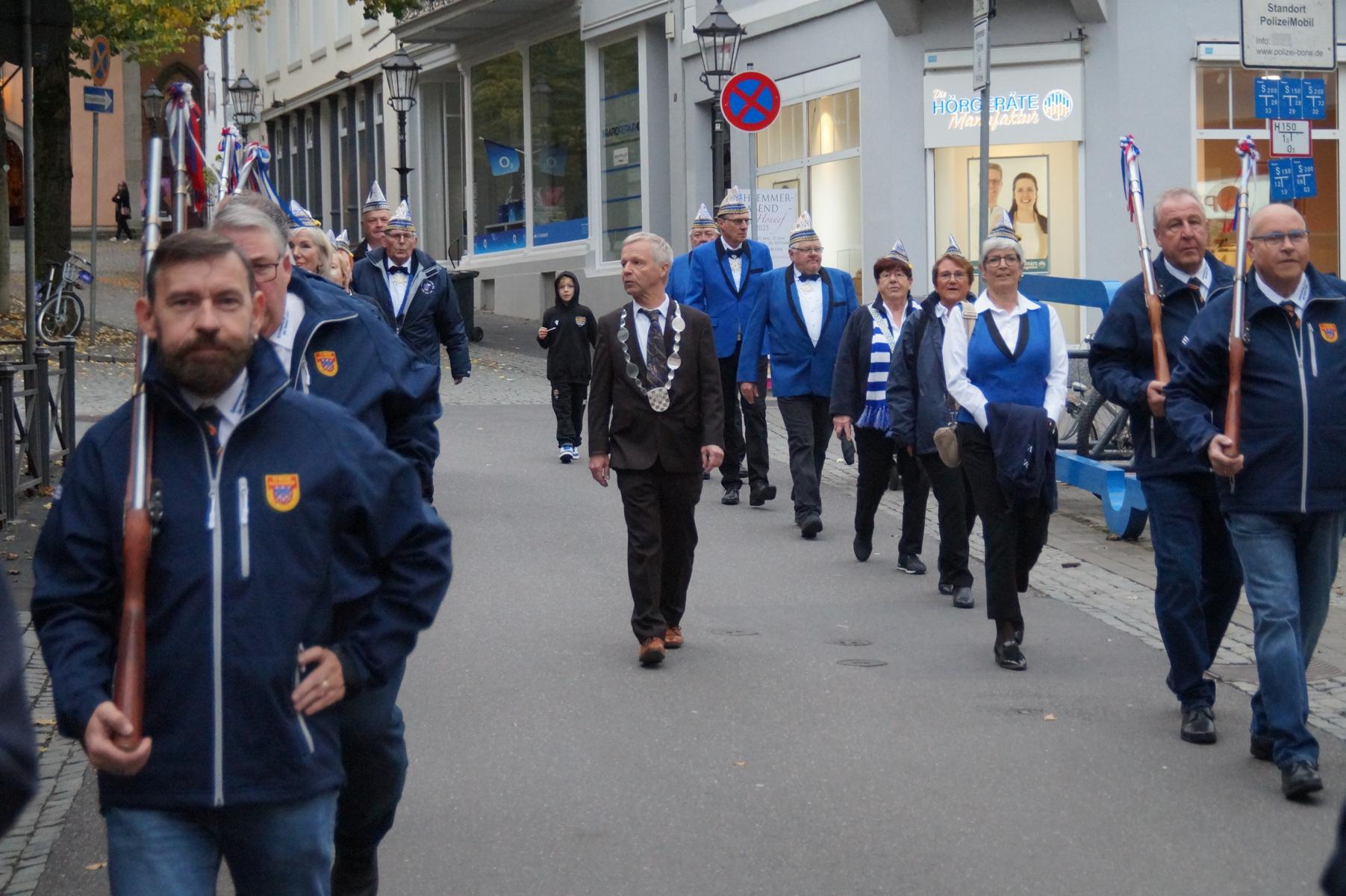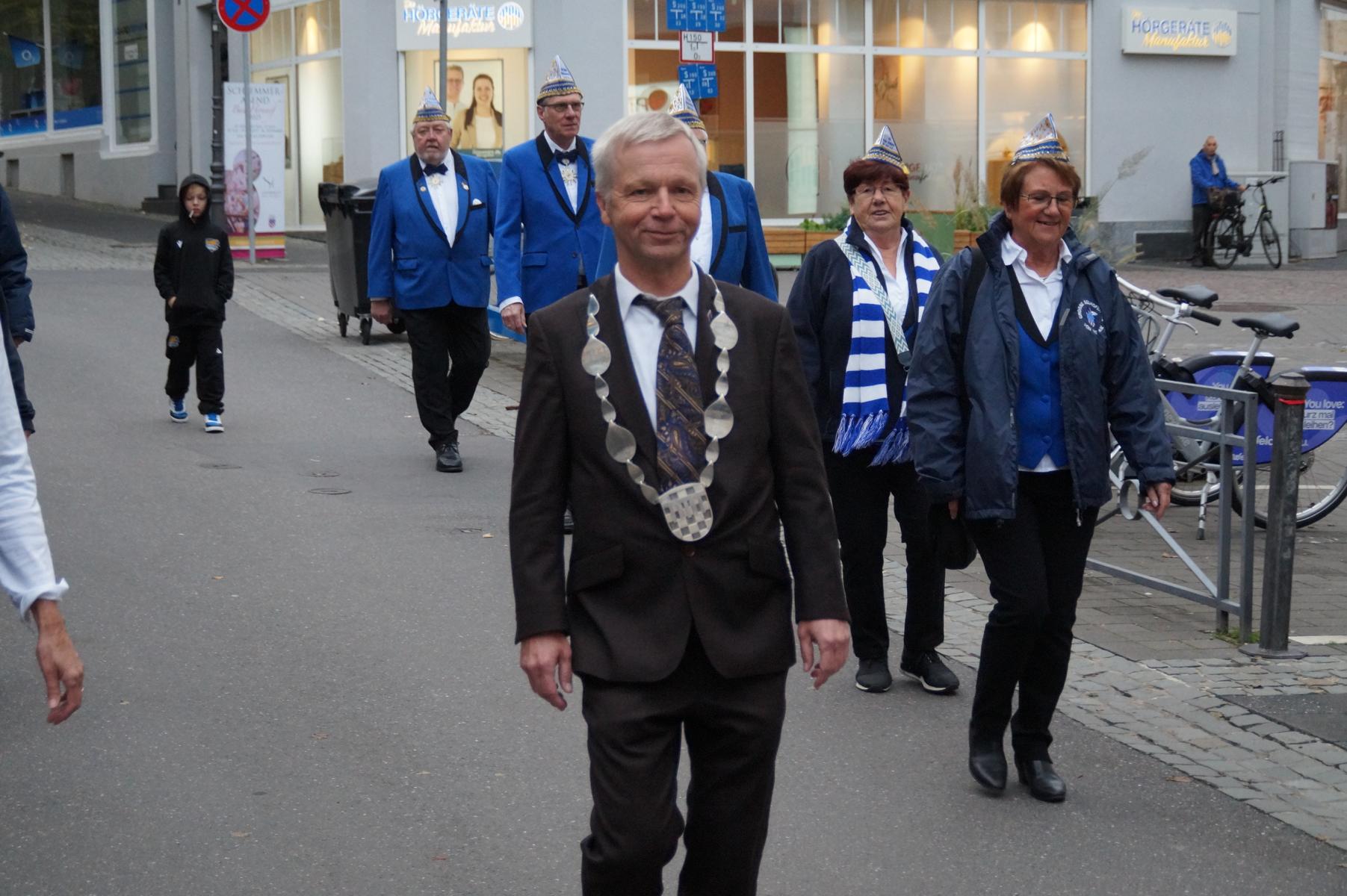 Der Abschied begann bereits am 9. Oktober 2025 am Rathaus: Otto Neuhoff wurde dort feierlich abgeholt, begleitet von den Bad Honnefer Stadtsoldaten und den Senatoren der KG Blau-Weiß Selhof, bei denen Otto Neuhoff selbst Senator ist. In einem festlichen Zug ging es gemeinsam durch die Fußgängerzone bis zum Kurhaus, wo die offizielle Verabschiedung stattfand.