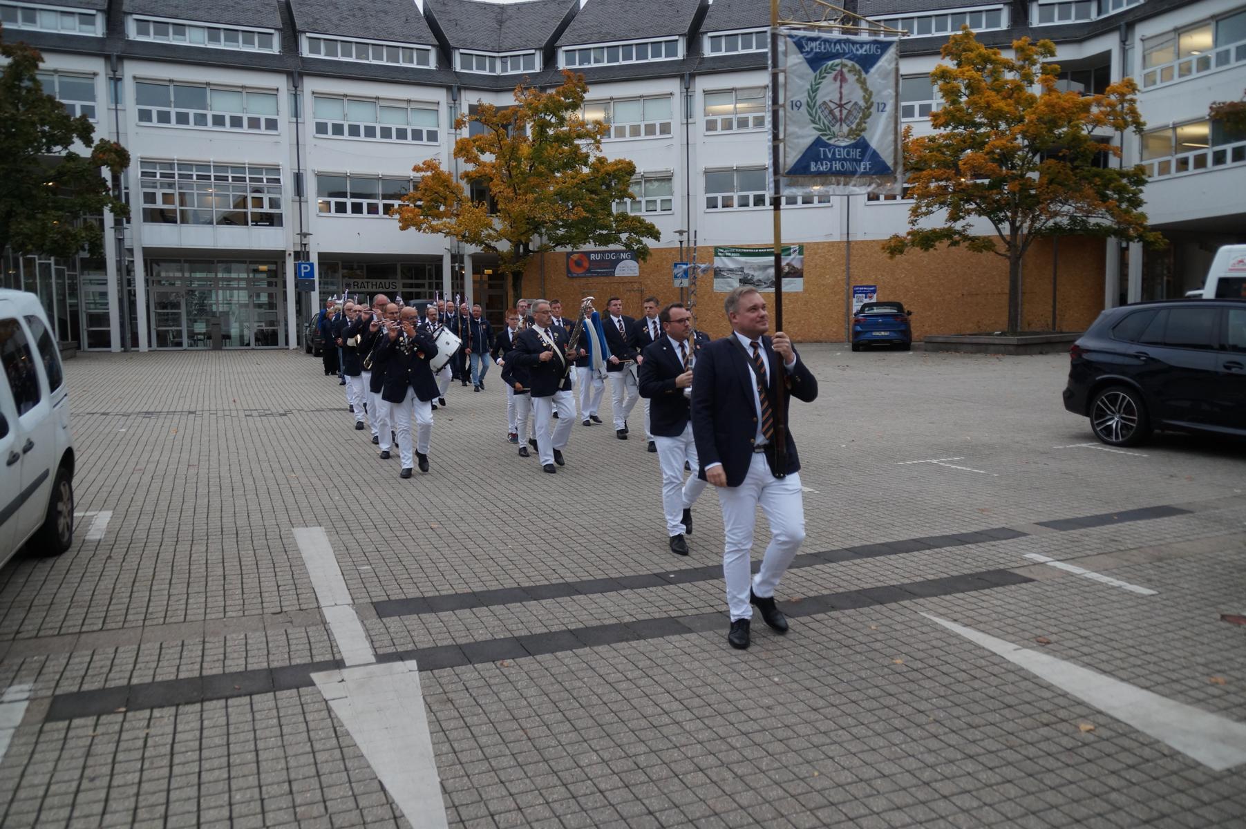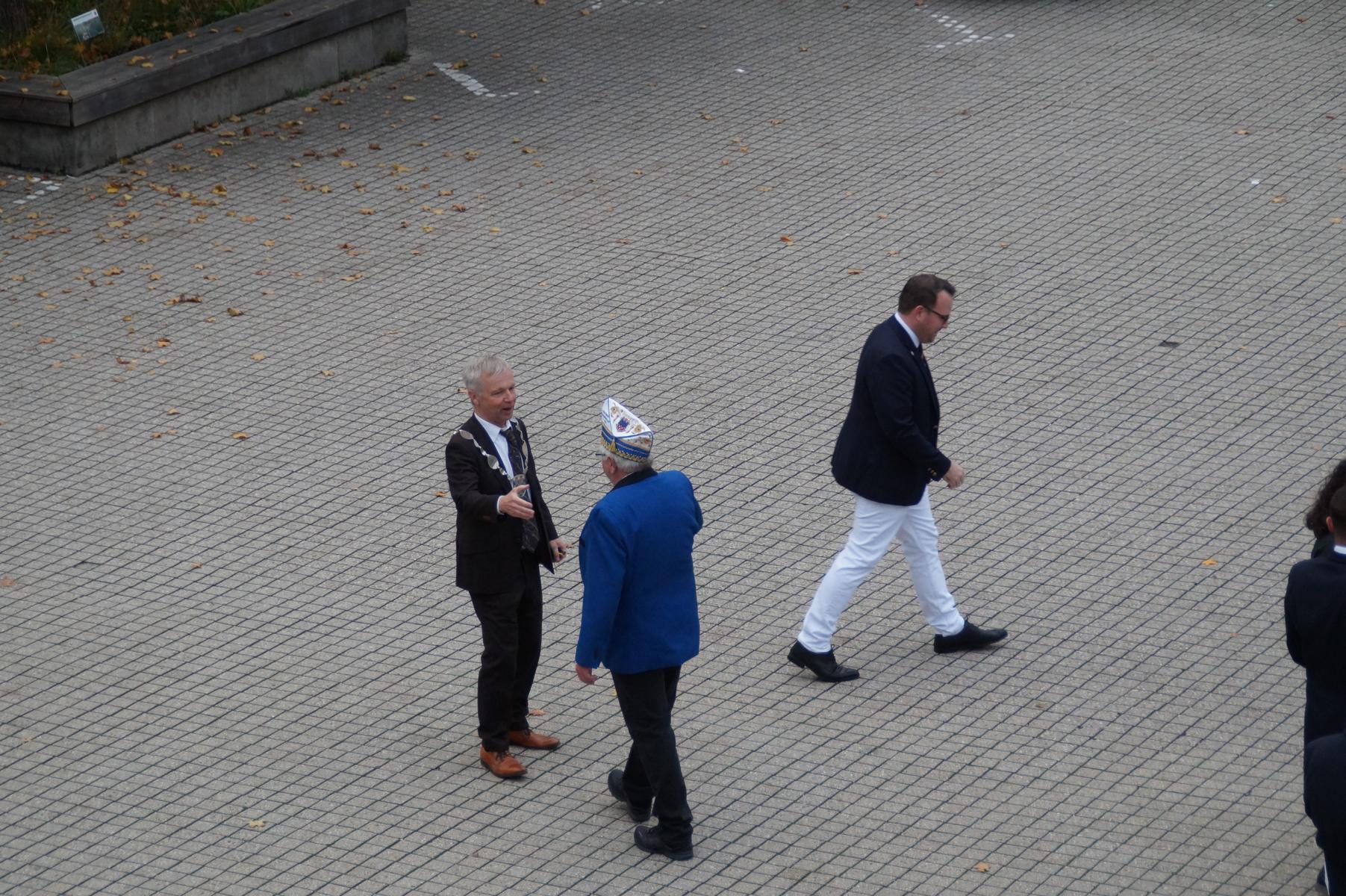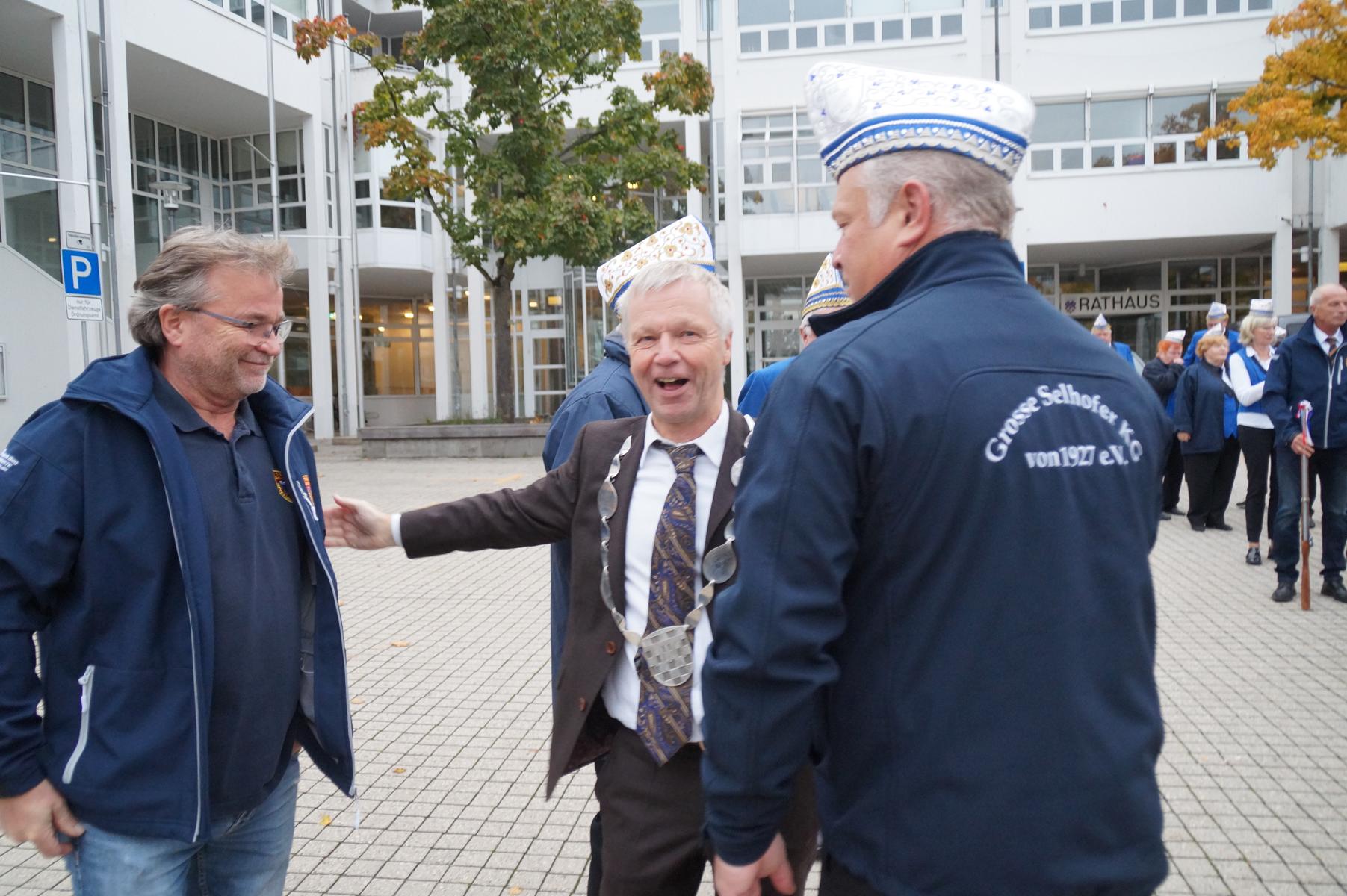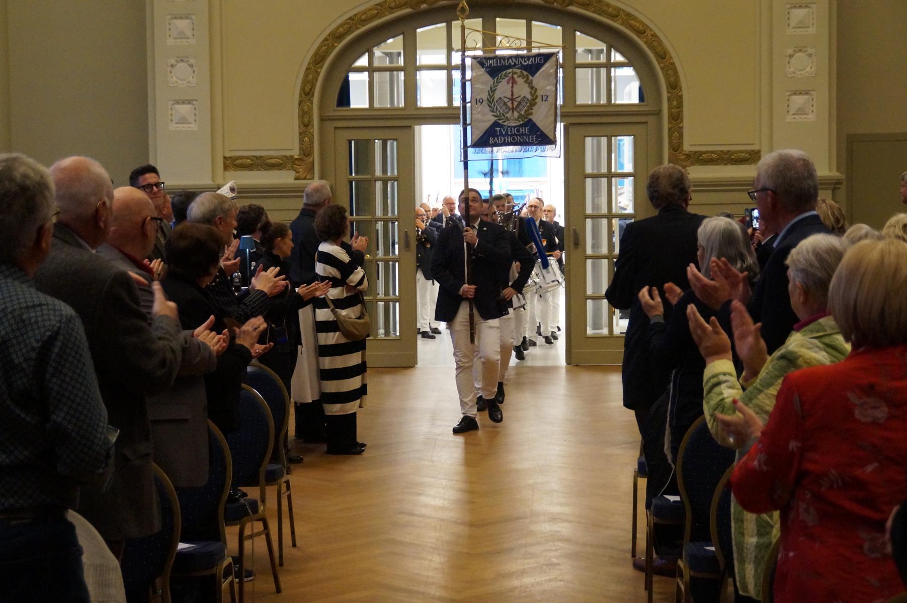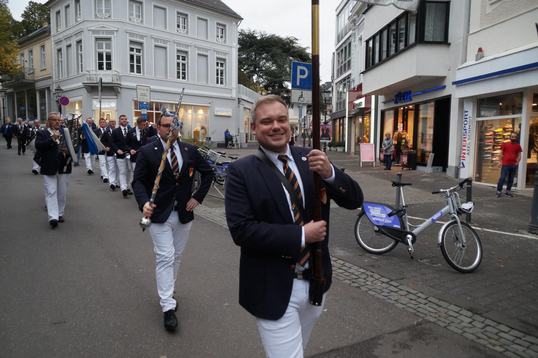 Der Abschied begann bereits am 9. Oktober 2025 am Rathaus: Otto Neuhoff wurde dort feierlich abgeholt, begleitet von den Bad Honnefer Stadtsoldaten und den Senatoren der KG Blau-Weiß Selhof, bei denen Otto Neuhoff selbst Senator ist. In einem festlichen Zug ging es gemeinsam durch die Fußgängerzone bis zum Kurhaus, wo die offizielle Verabschiedung stattfand.