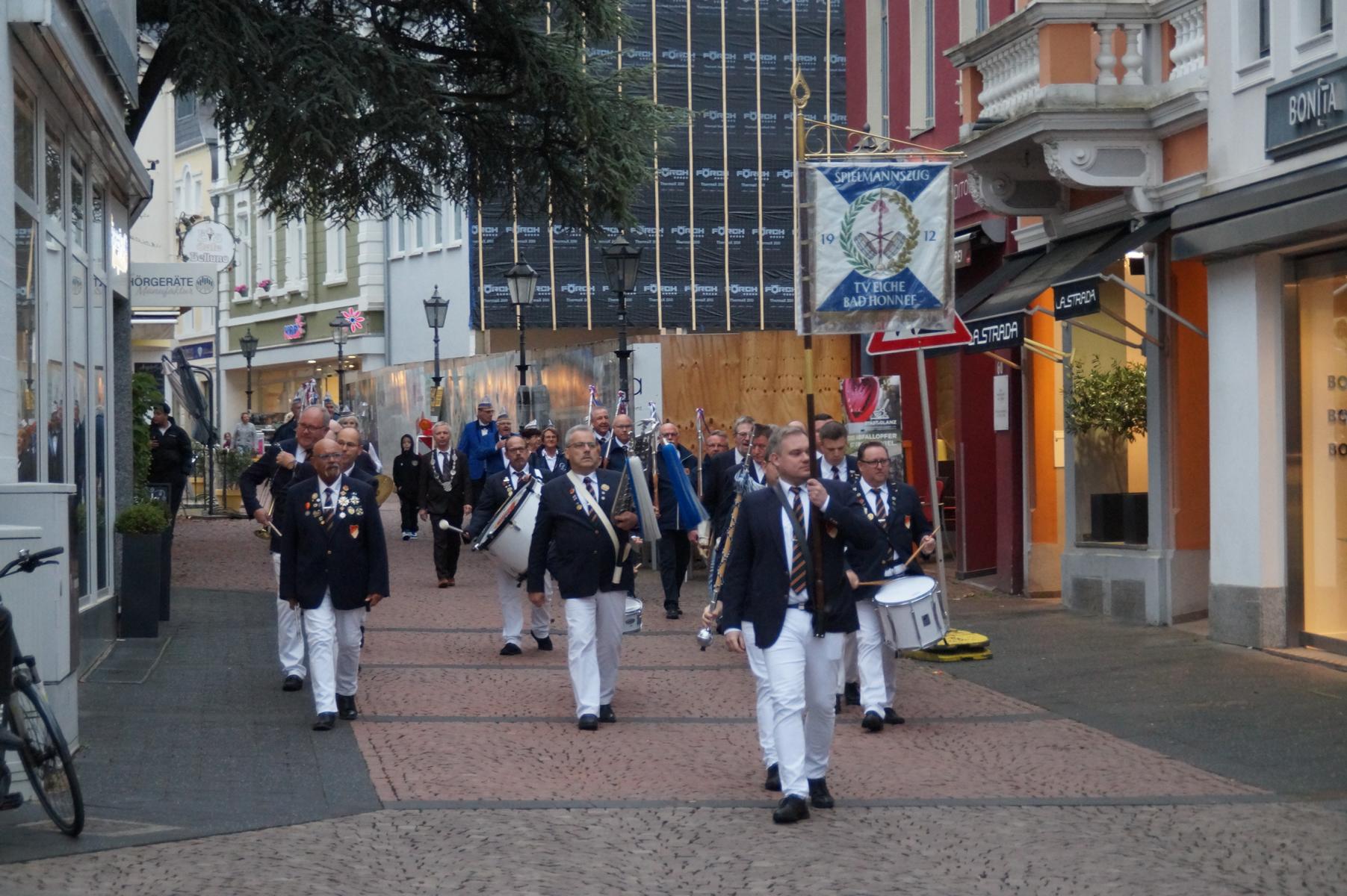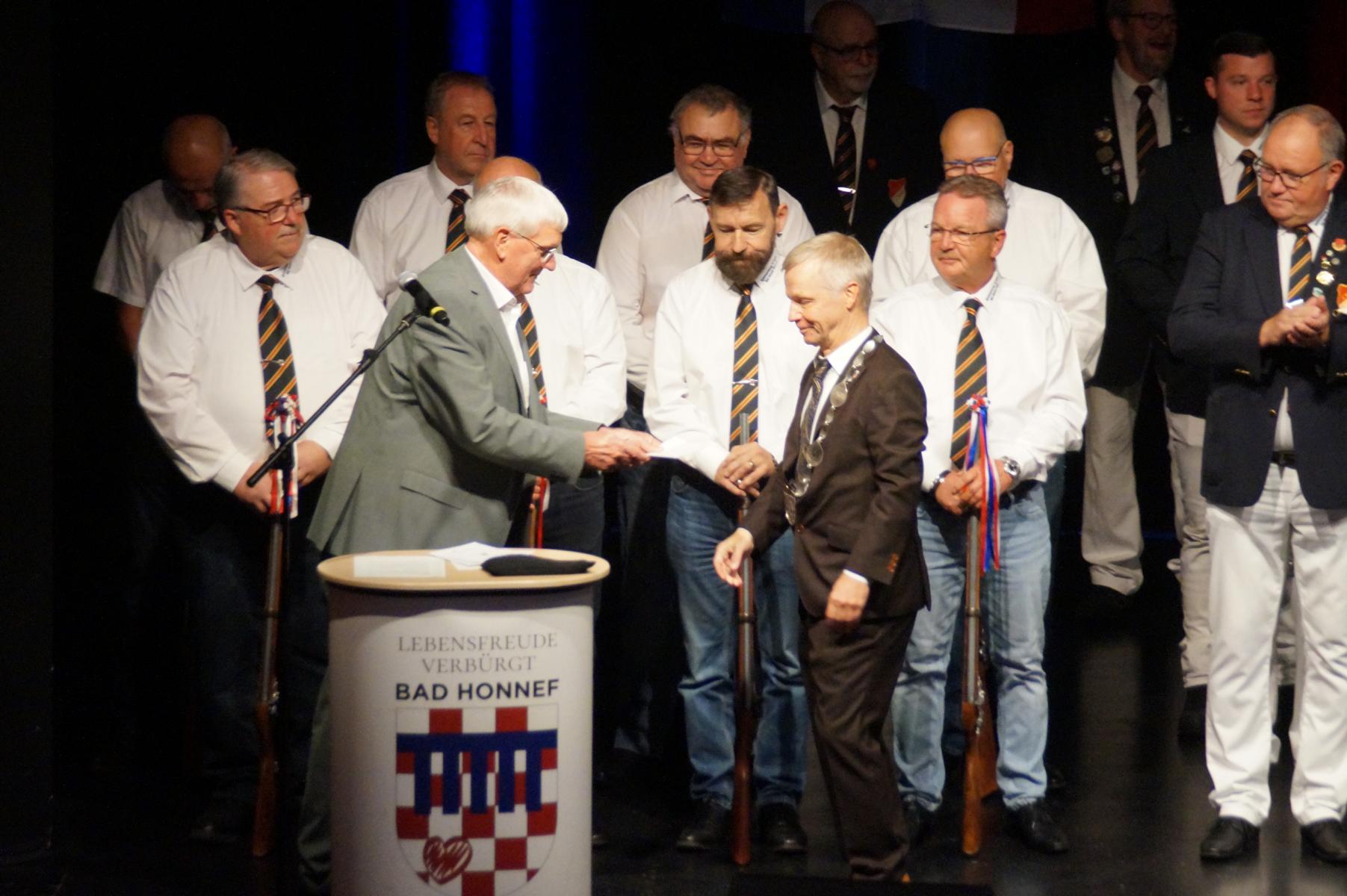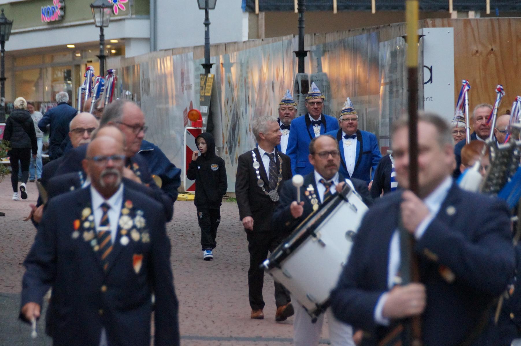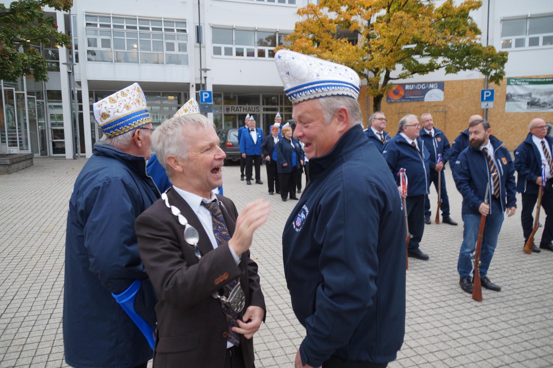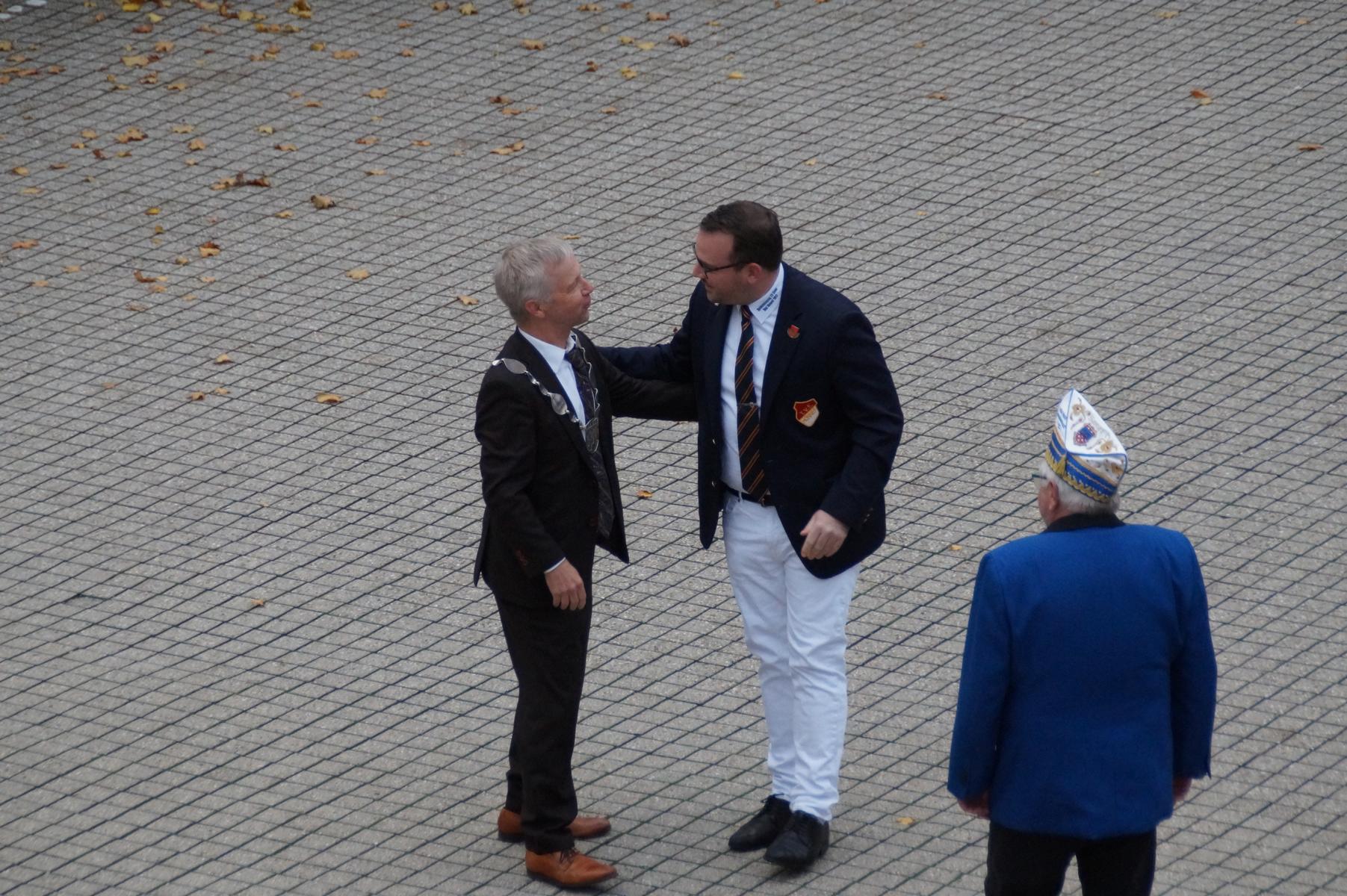 Der Abschied begann bereits am 9. Oktober 2025 am Rathaus: Otto Neuhoff wurde dort feierlich abgeholt, begleitet von den Bad Honnefer Stadtsoldaten und den Senatoren der KG Blau-Weiß Selhof, bei denen Otto Neuhoff selbst Senator ist. In einem festlichen Zug ging es gemeinsam durch die Fußgängerzone bis zum Kurhaus, wo die offizielle Verabschiedung stattfand.