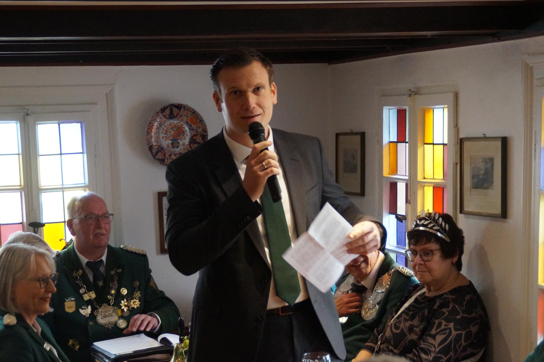Der Präsident der St. Hubertus Schützengesellschaft Rhöndorf, Ralf Wagner begrüßte die Vereinsmitglieder, Ehrenmitglieder und Gäste, darunter das Stadtoberhaupt Philipp Herzog, den Kreisvorsitzenden des RSB 10,4, Klaus Linnig. den stellvertretenden Bezirksbundesmeister der historischen Schützen, Ralf Püllen, sowie die Vertreter der befreundeten Vereine. Wagner bedankte sich herzlich für die Patronatsmesse, die in der Rhöndorfer St Marien Kapelle gefeiert wurde.