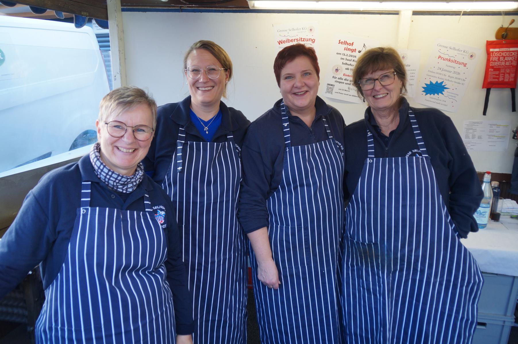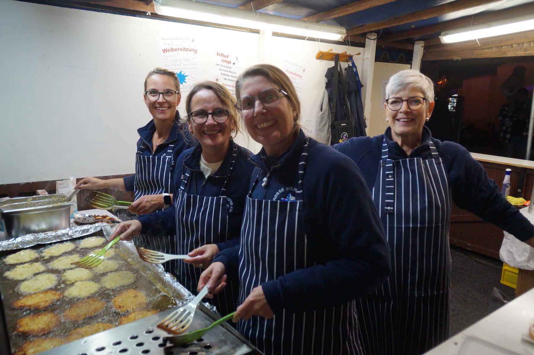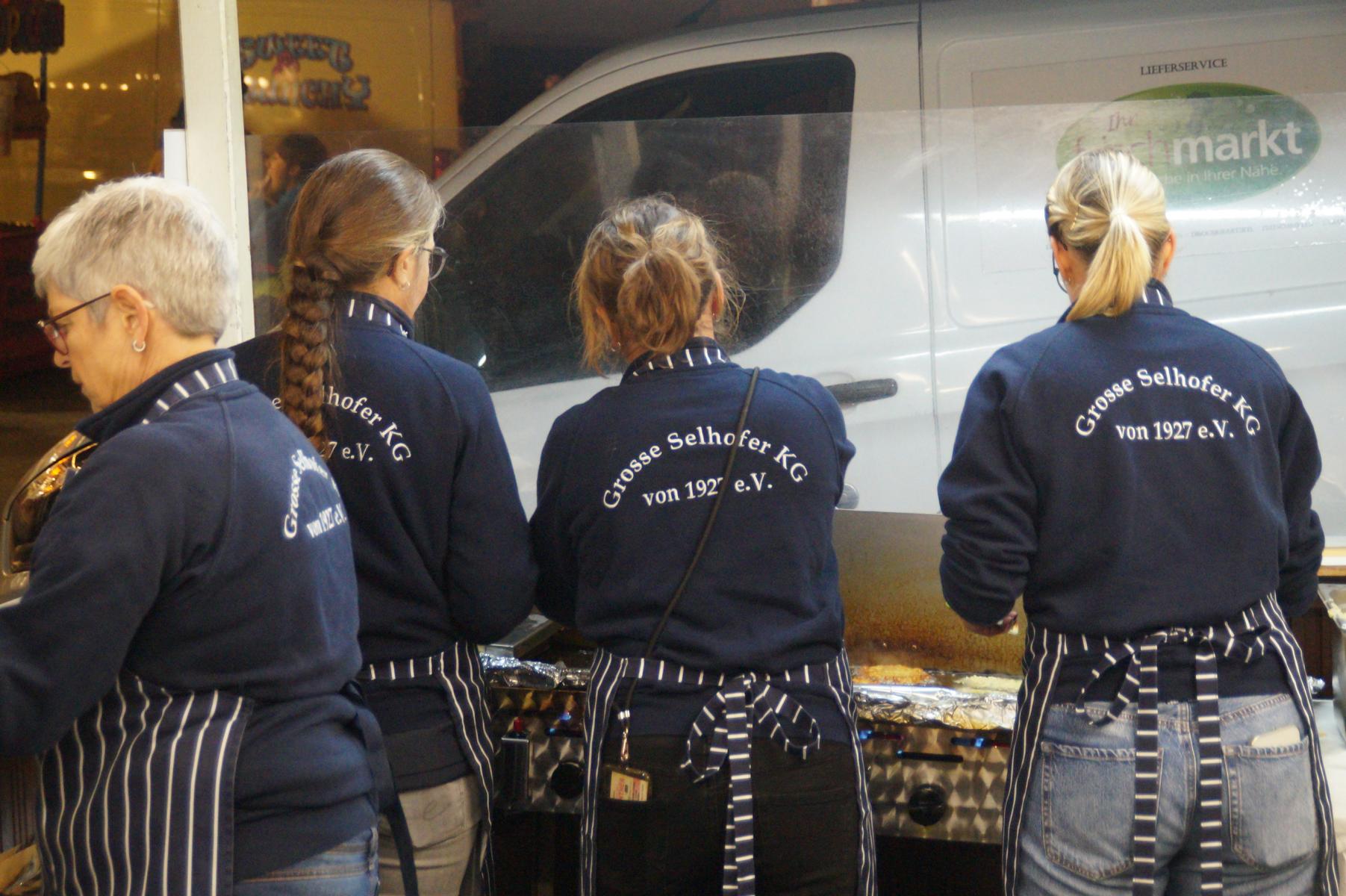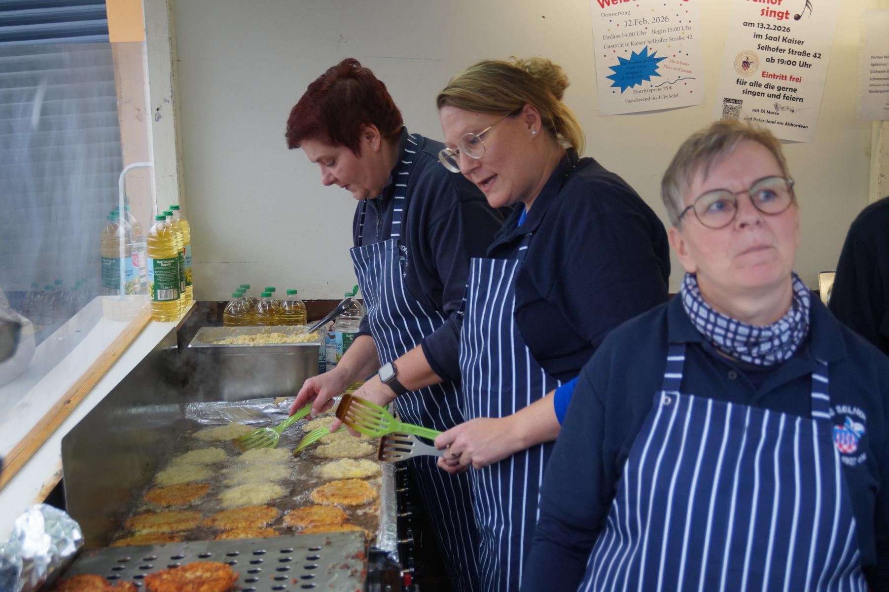 Bereits am Freitagabend traf sich ein Team an einem geheimen Ort in Selhof, um die Zutaten für die beliebten Reibekuchen vorzubereiten. Rund 300 Kilogramm Kartoffeln und eine große Menge Zwiebeln wurden geschält, zerkleinert und mit Gewürzen zu einem schmackhaften Teig verarbeitet. Ab Samstag war der Reibekuchenstand durchgehend gut besucht – ein echter Klassiker der Kirmes.