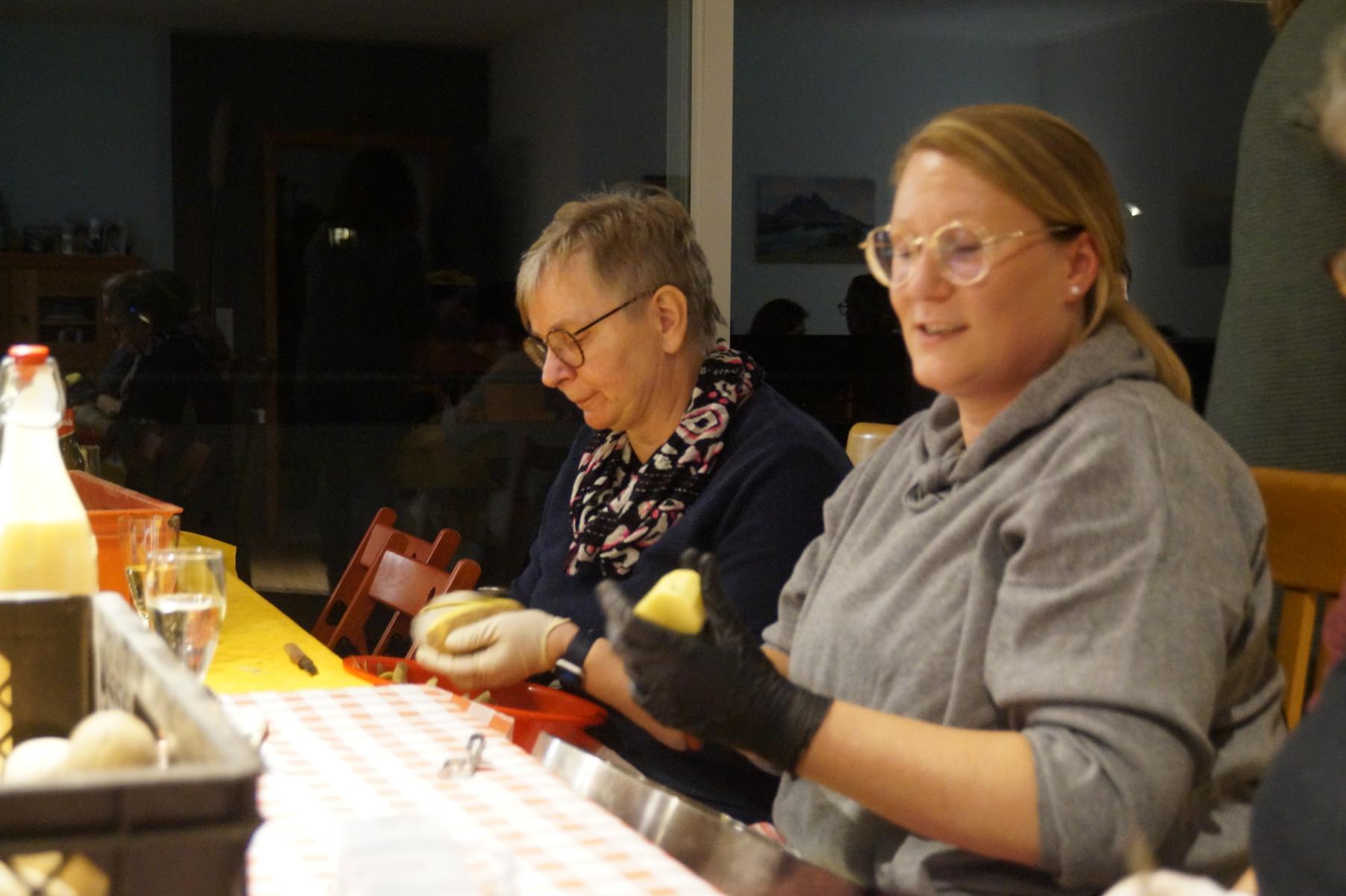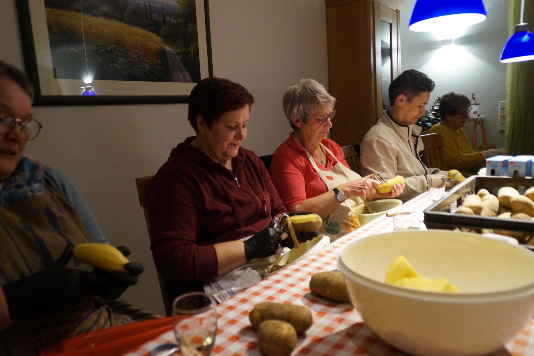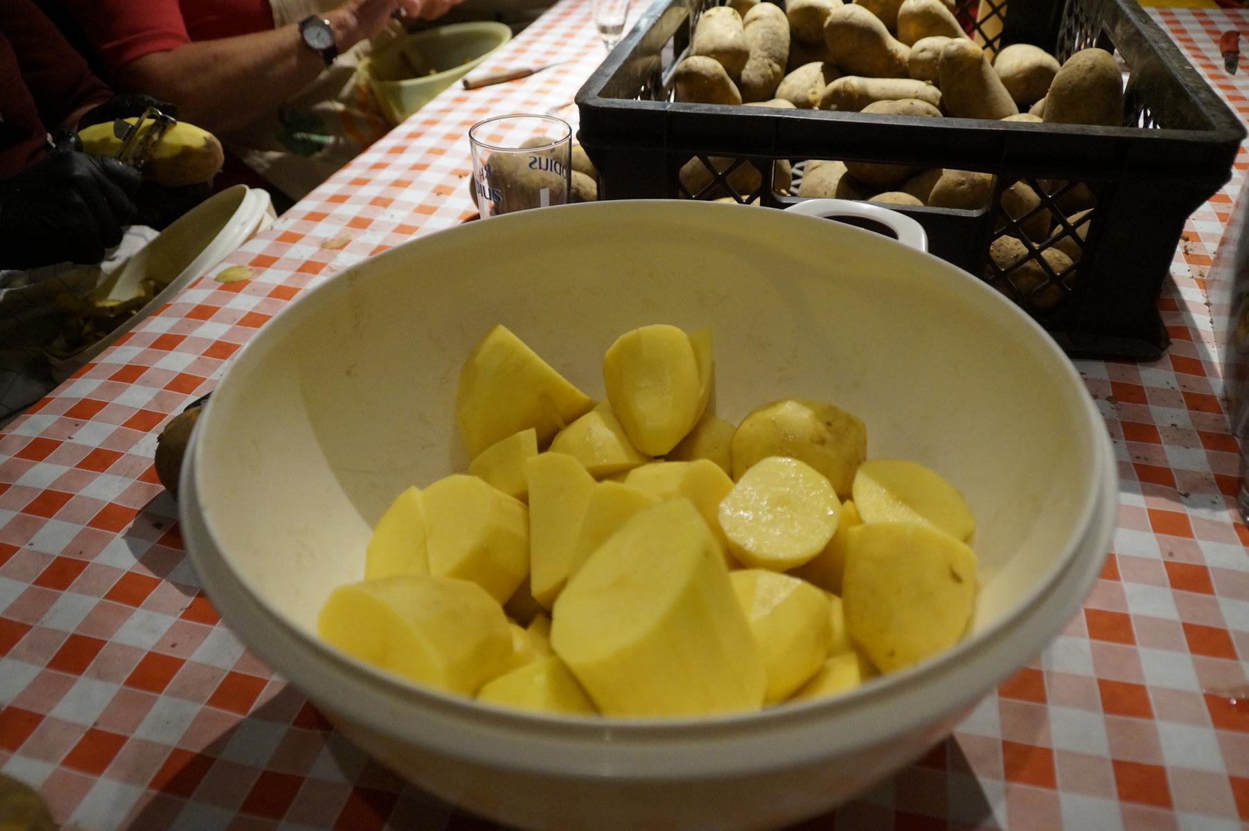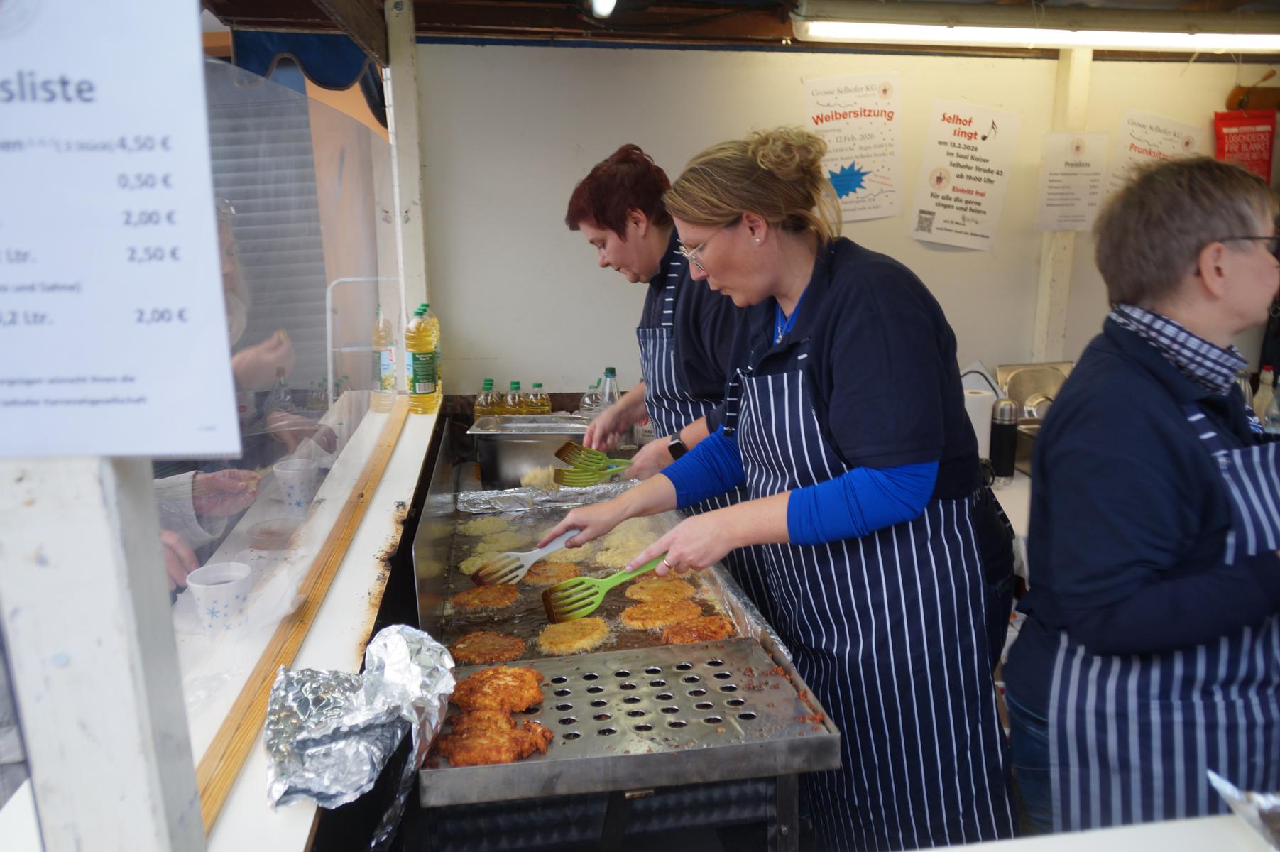 Bereits am Freitagabend traf sich ein Team an einem geheimen Ort in Selhof, um die Zutaten für die beliebten Reibekuchen vorzubereiten. Rund 300 Kilogramm Kartoffeln und eine große Menge Zwiebeln wurden geschält, zerkleinert und mit Gewürzen zu einem schmackhaften Teig verarbeitet. Ab Samstag war der Reibekuchenstand durchgehend gut besucht – ein echter Klassiker der Kirmes.