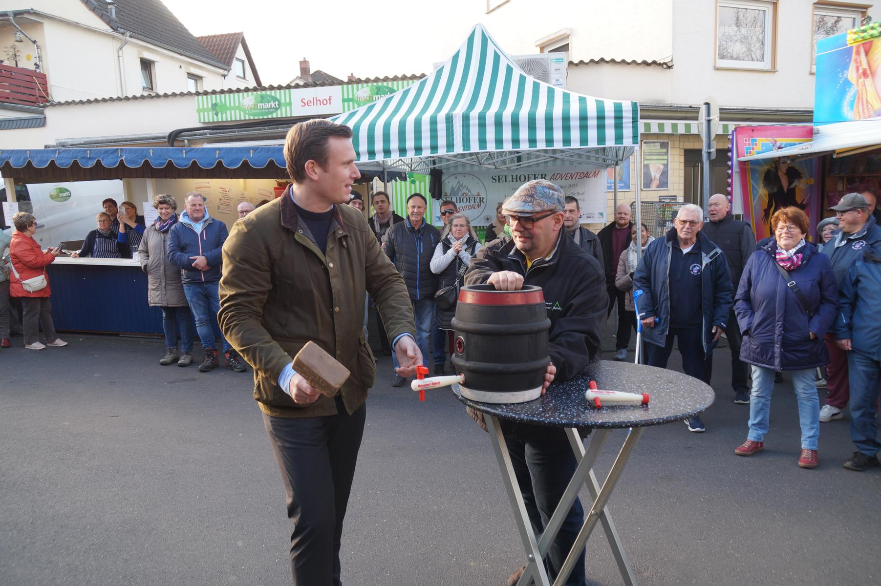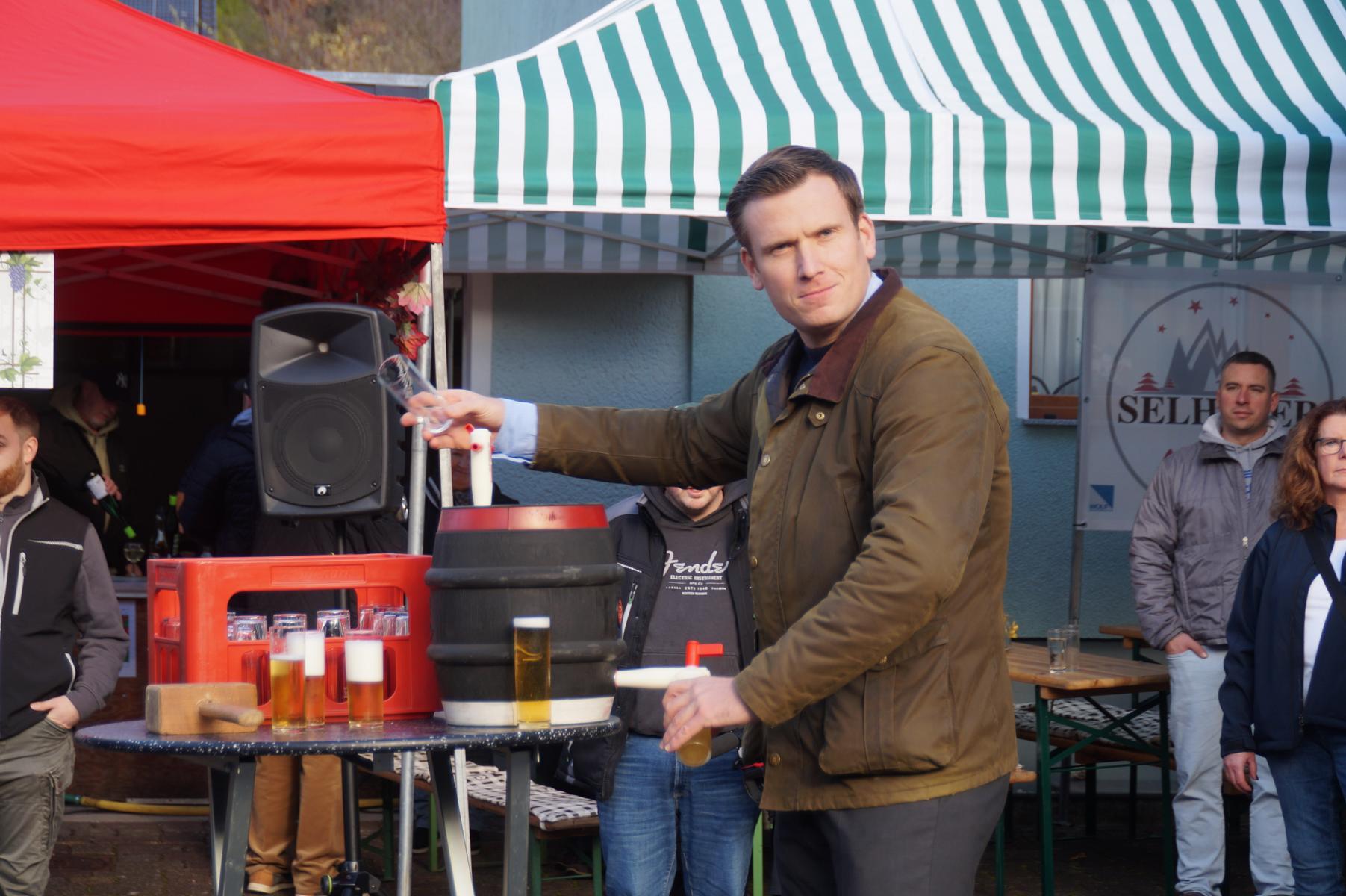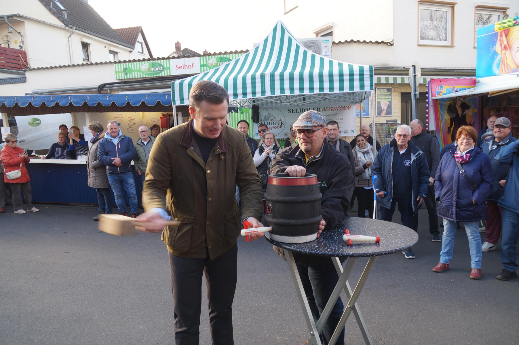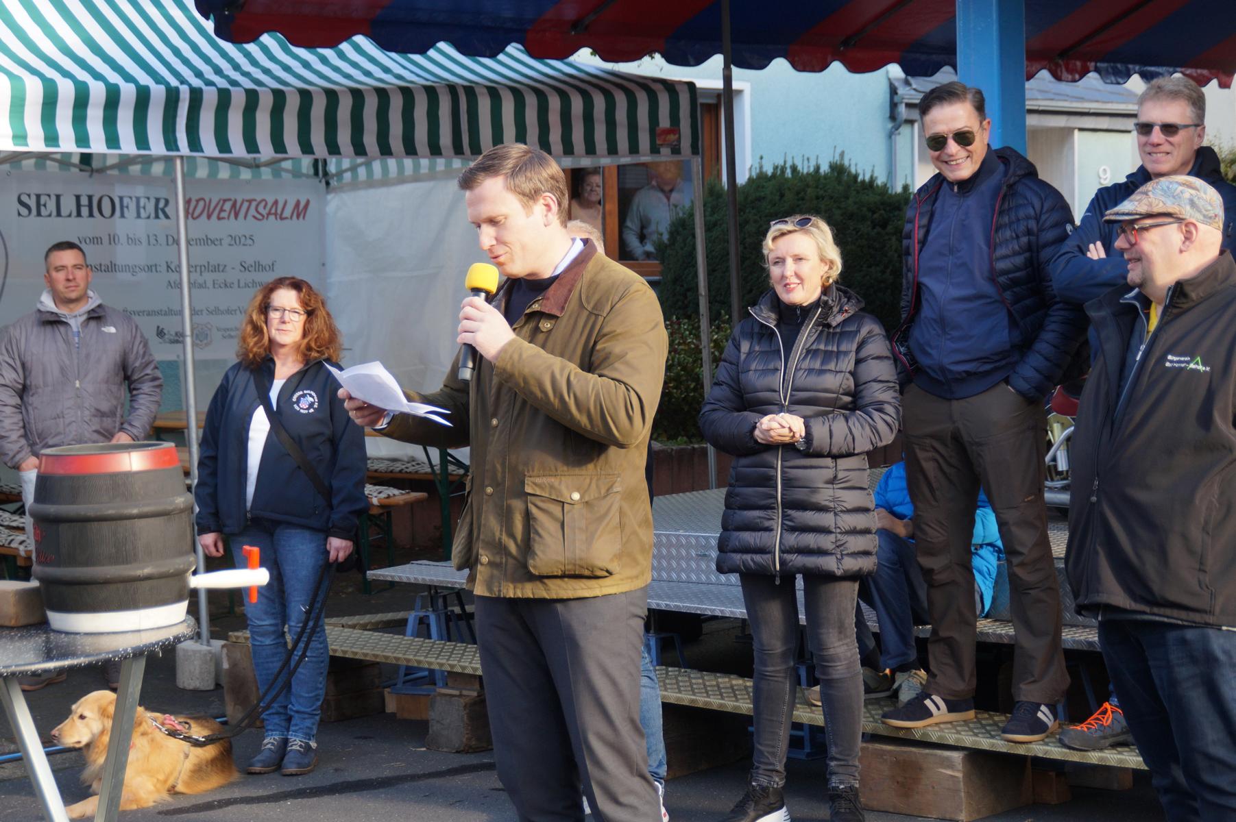 Die Selhofer Kirmes begann am Samstag, dem 8. November 2025, um 14 Uhr. Bürgermeister Philipp Herzog eröffnete das Fest mit seinem ersten Fassanstich im Amt. Mit drei gezielten Schlägen brachte er das Kirmesfässchen zum Fließen – damit war die Kirmes offiziell eröffnet. Feierlich begleitet wurde der Fassanstich vom Tambourcorps „Frei Weg“ Selhof, das mit schwungvollen Klängen für die passende musikalische Untermalung sorgte.