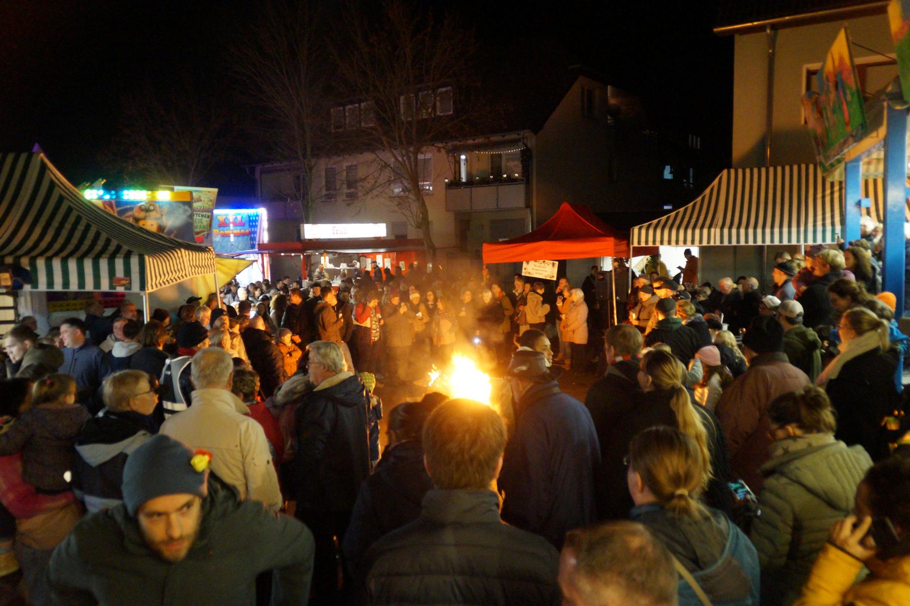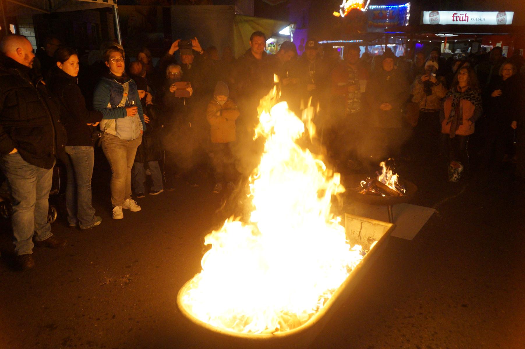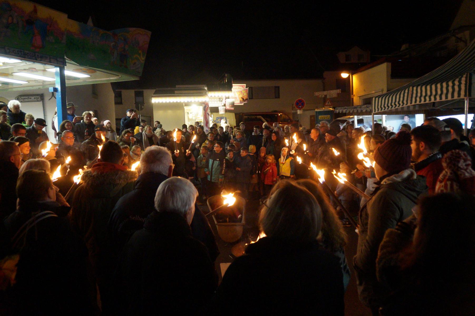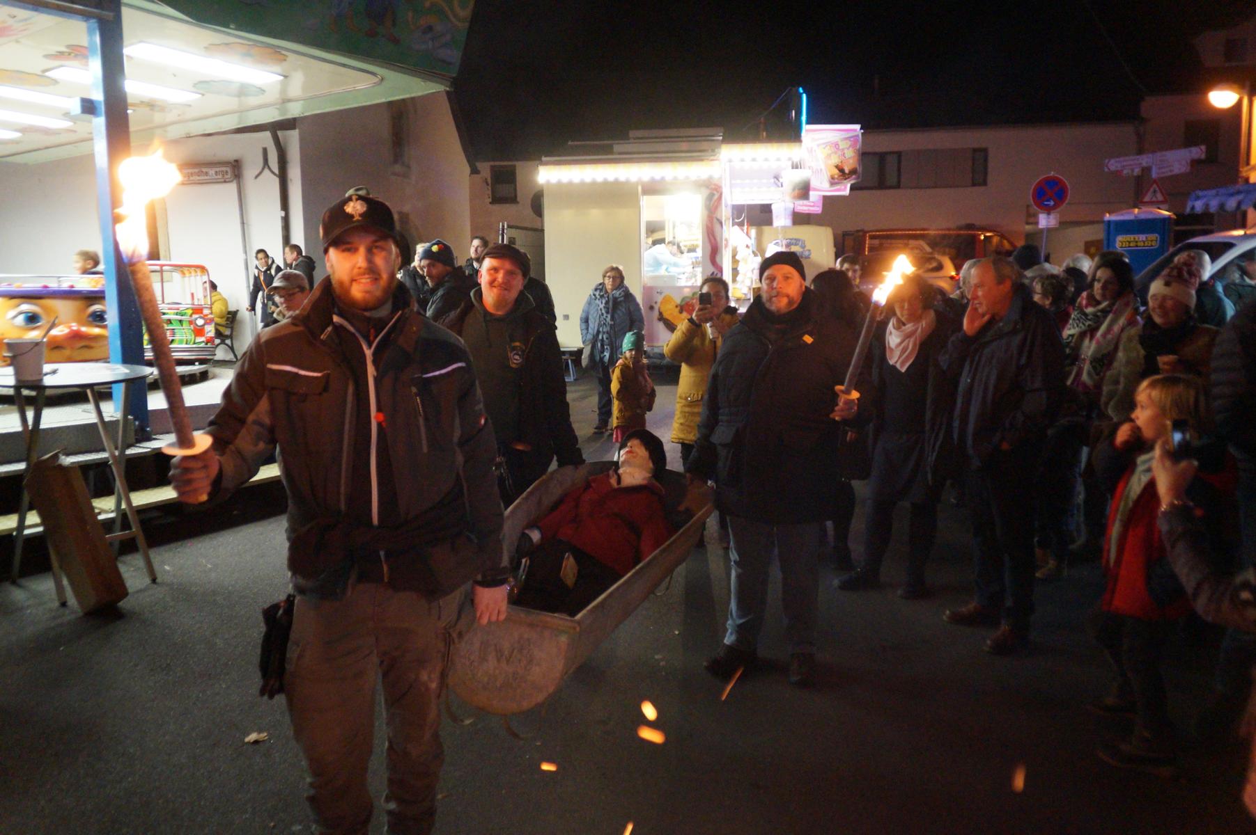 Am Montagabend, dem 13. November, fand der traditionelle Fackelzug durch die Straßen von Selhof statt. Pünktlich um 18:30 Uhr wurde der Kirmesmann unter den Trauerworten von Max Raffauf den Flammen übergeben. Doch die Trauer währte nicht lange: Ein lauter Knall kündigte das große Finale an.