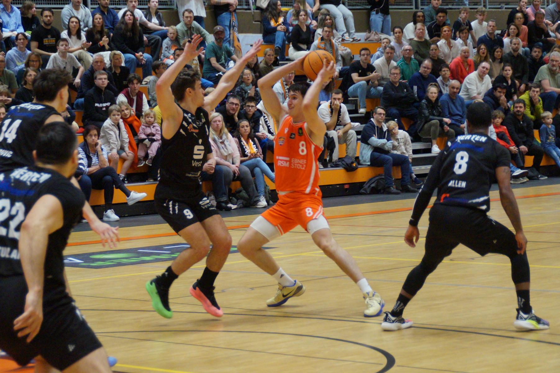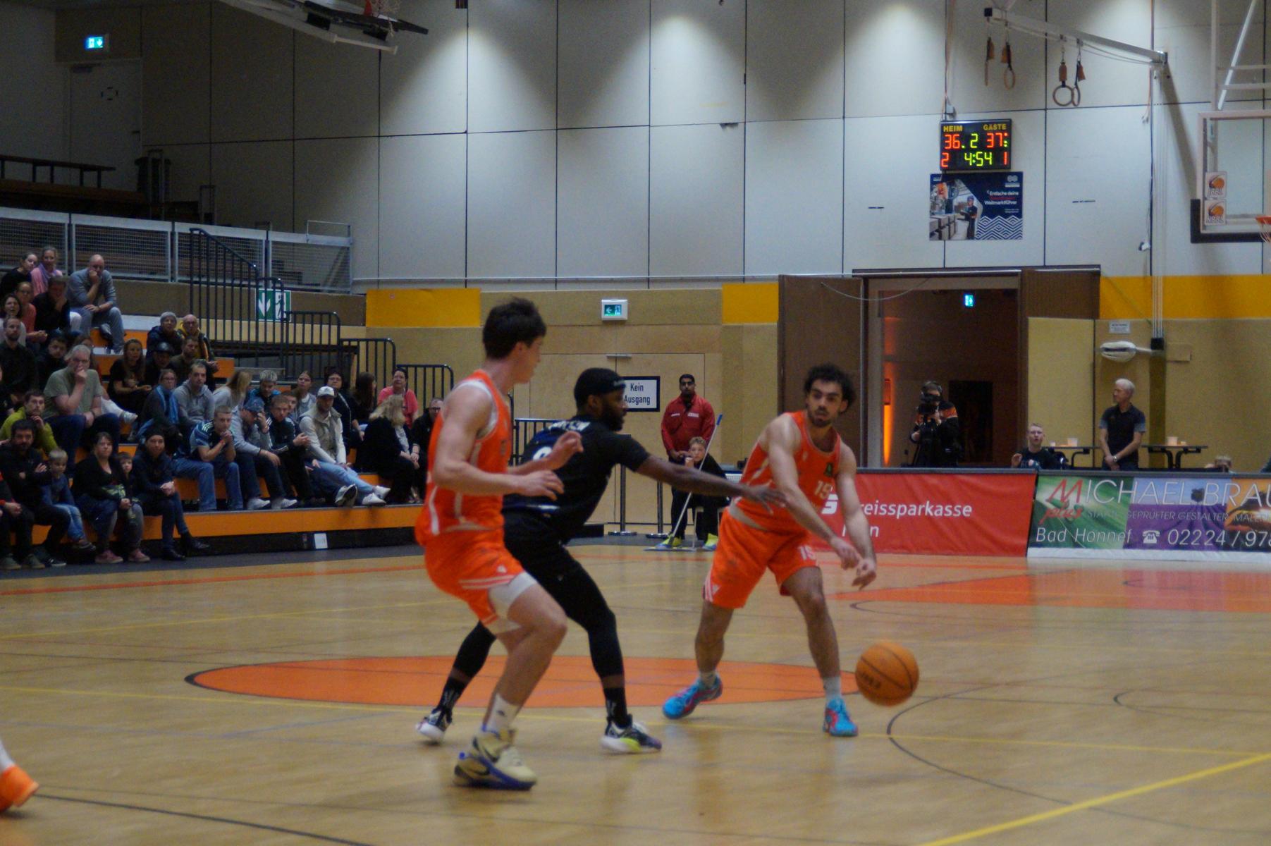 Der Start ins dritte Viertel lief aus Sicht der Dragons zunächst top. Kenan Reinhart sowie Duje Dujmovic klinkten Dreier ein und brachten Rhöndorf in Front (22“/50:49). Bis zur 28. Minute konnten die Hausherren die knappe Führung behaupten. Dann legten die Gäste eine 10:0-Serie auf, gekrönt von einem Dreier des starken US-Guard Bryant Allen (20 Pkt./3-3er), zum 63:69. Im Schlussabschnitt zogen die Löwen sogar bis auf acht Punkte davon (33“/67:75). Dem Team aus der Rhein-Ruhr-Region gehörte in dieser Spielphase das Glück des Tüchtigen. Sie schafften es aufreizend oft mit einem schwierigen Wurf, kurz vor Ablauf der 24-Sekunden-Uhr, Bälle einzunetzen.