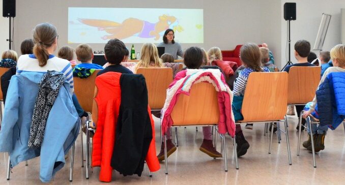 Den Abschluss bildete die bekannte Kinderbuchautorin Isabel Abedi, die den 3. und 4. Klassen aus ihrem neuesten Buch „Mi, mittendrin“ vorlas. Sie erzählte den Kindern, dass sie jetzt die Sprache ihres Vaters – persisch – lernen würde und schon waren um die 20 andere Sprachen im Raum. Faszinierend. Dabei ging es auch um Kinderrechte. In einem lockeren Gespräch mit der Autorin zeigten die Kinder, wie viel sie über Kinderrechte bereits wissen. Spannend fanden sie die Geschichte von dem Mädchen „Mi“ allemal.