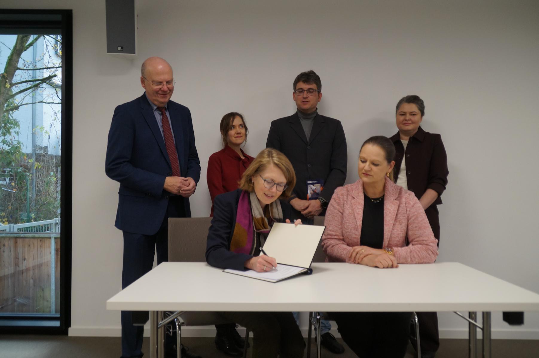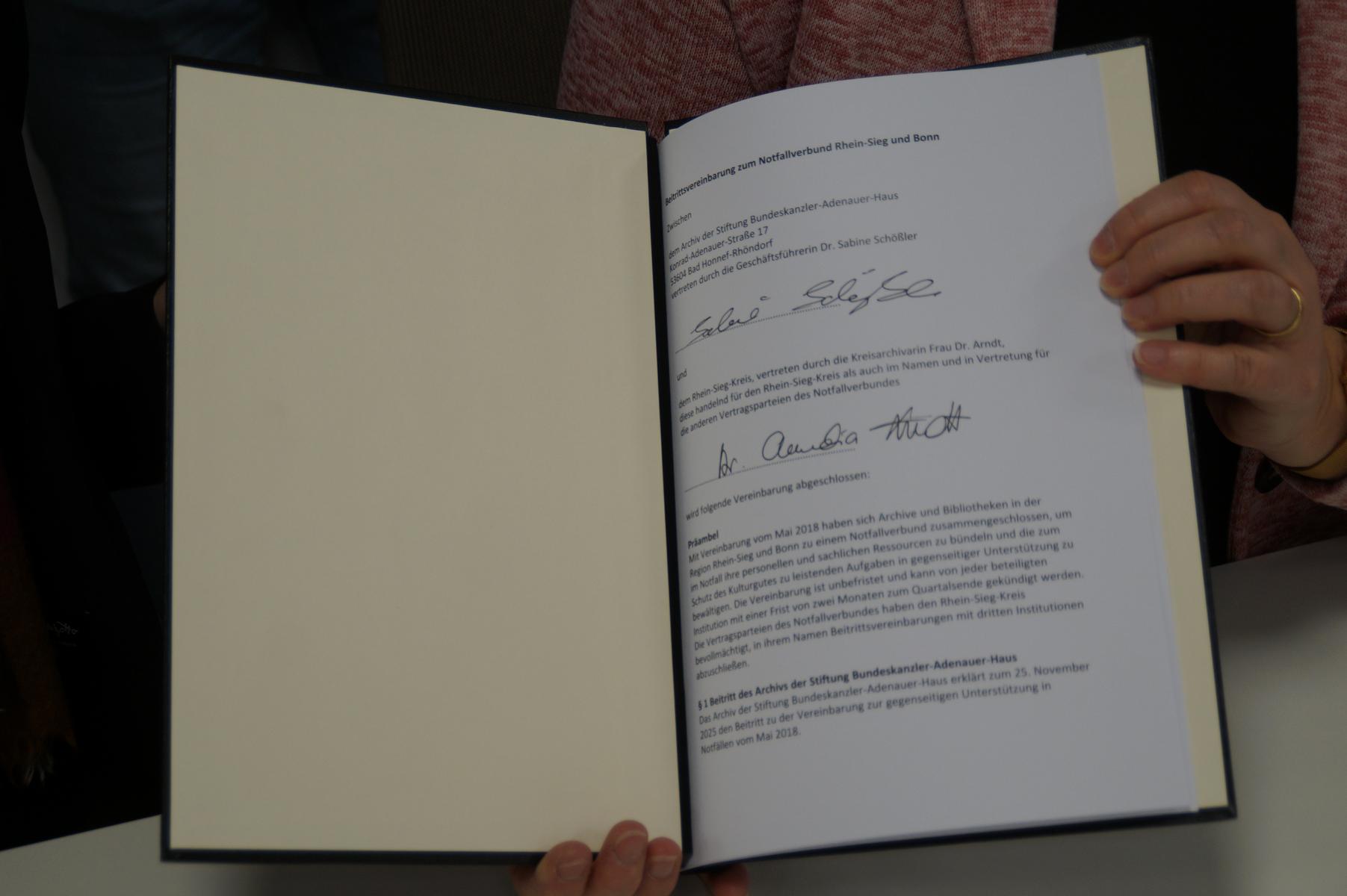 Die Aufnahme wurde am Dienstag, 25. November 2025, offiziell durch eine Vertragsunterzeichnung bestätigt. Dr. Claudia Arndt, Kreisarchivarin und Vertreterin des Notfallverbundes, sowie Dr. Sabine Schößler, Geschäftsführerin der Stiftung Bundeskanzler-Adenauer-Haus, setzten ihre Unterschriften unter die Vereinbarung.